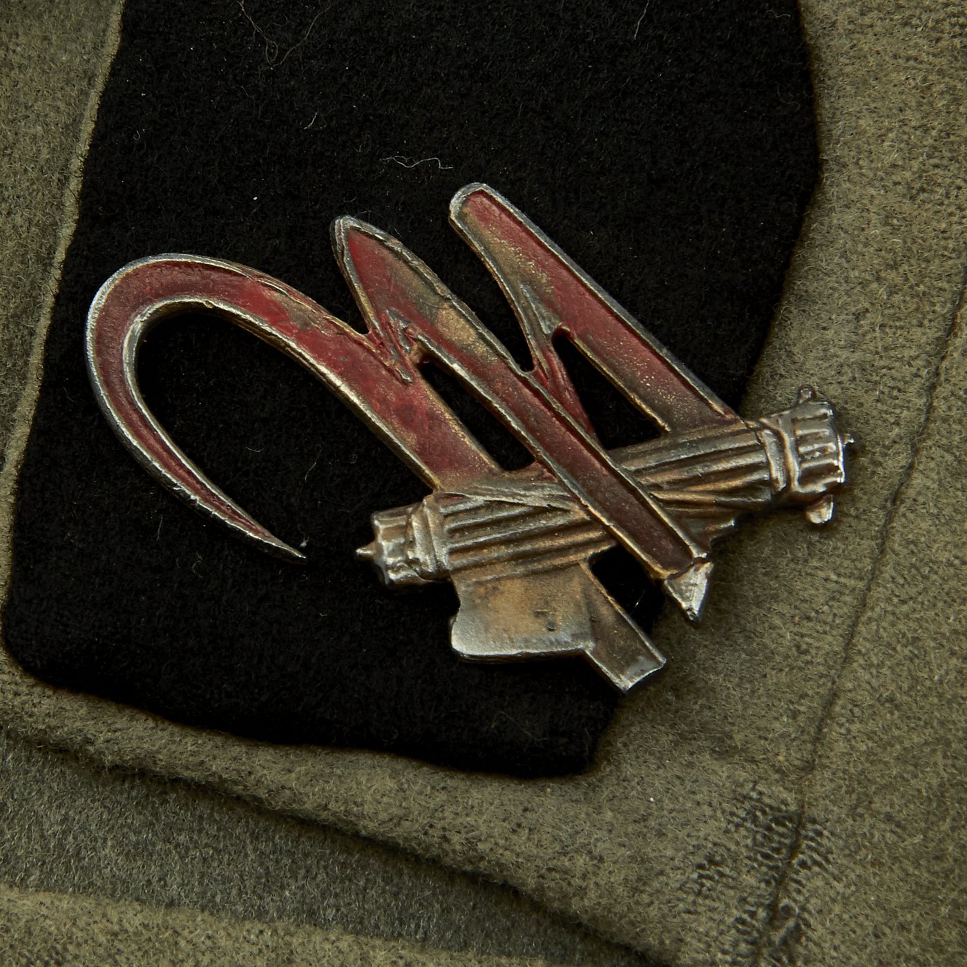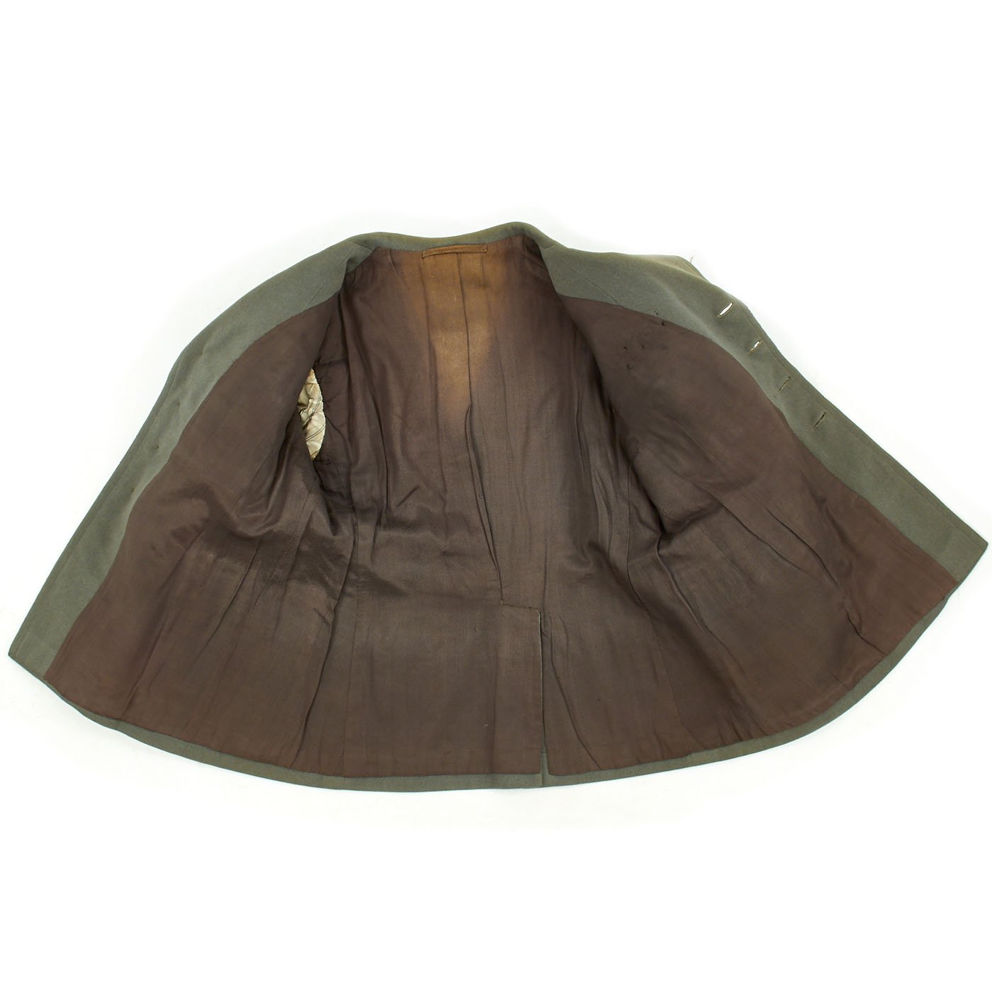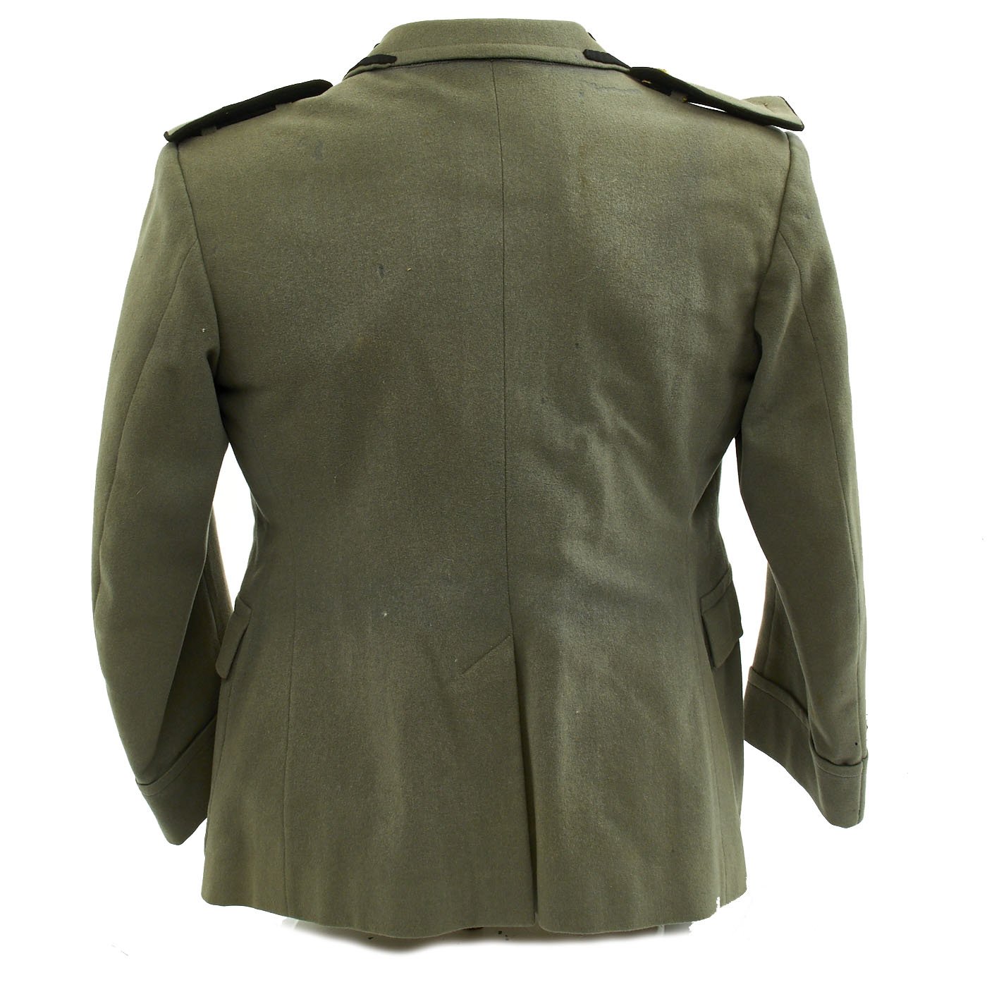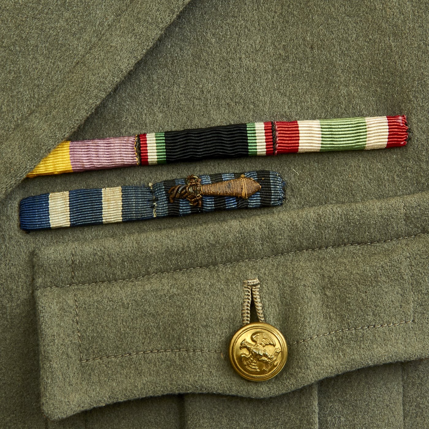 Original Item: Only One Available. World War Two Italian MVSN Aspirante Sottocapomanipolo (Officer Cadet) tunic constructed of green wool. Features MVSN black collar tabs with fascist axe inside M collar pins, Aspirante sleeve rank insignia and multiple medal ribbons. Front has four button closure, two hip pockets and two chest pockets. Overall very good condition.