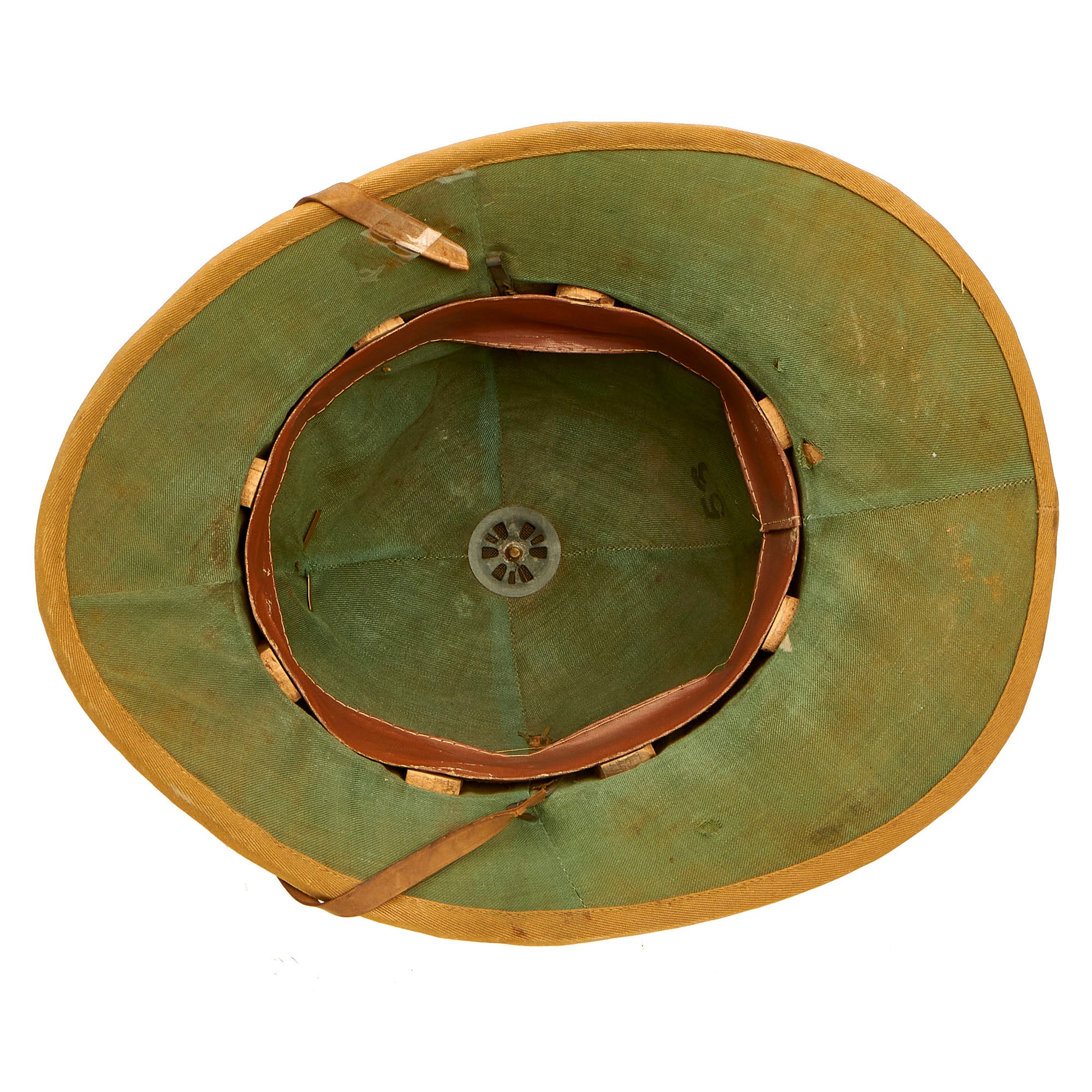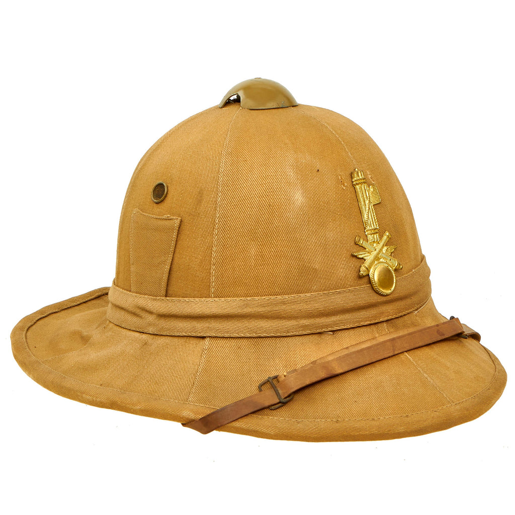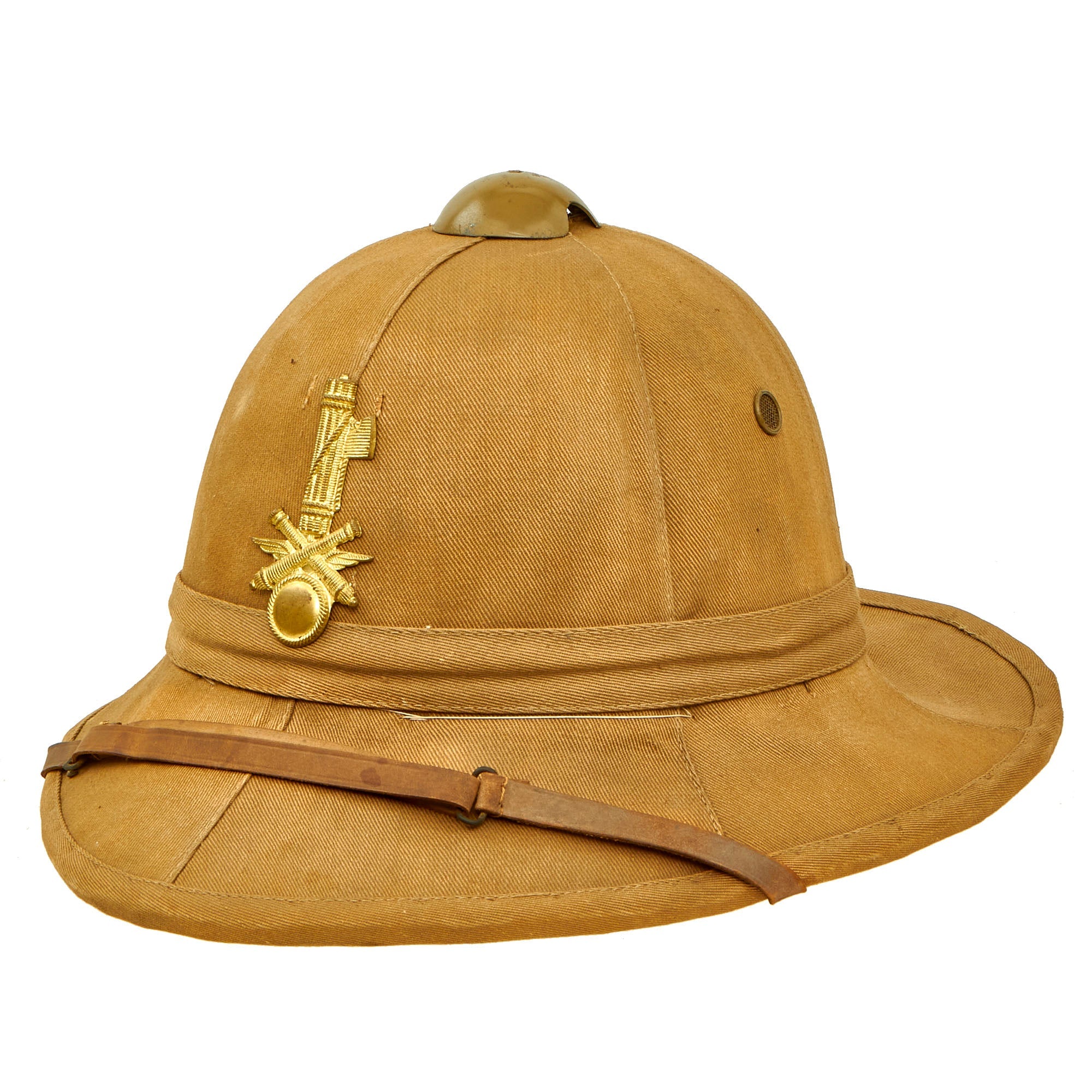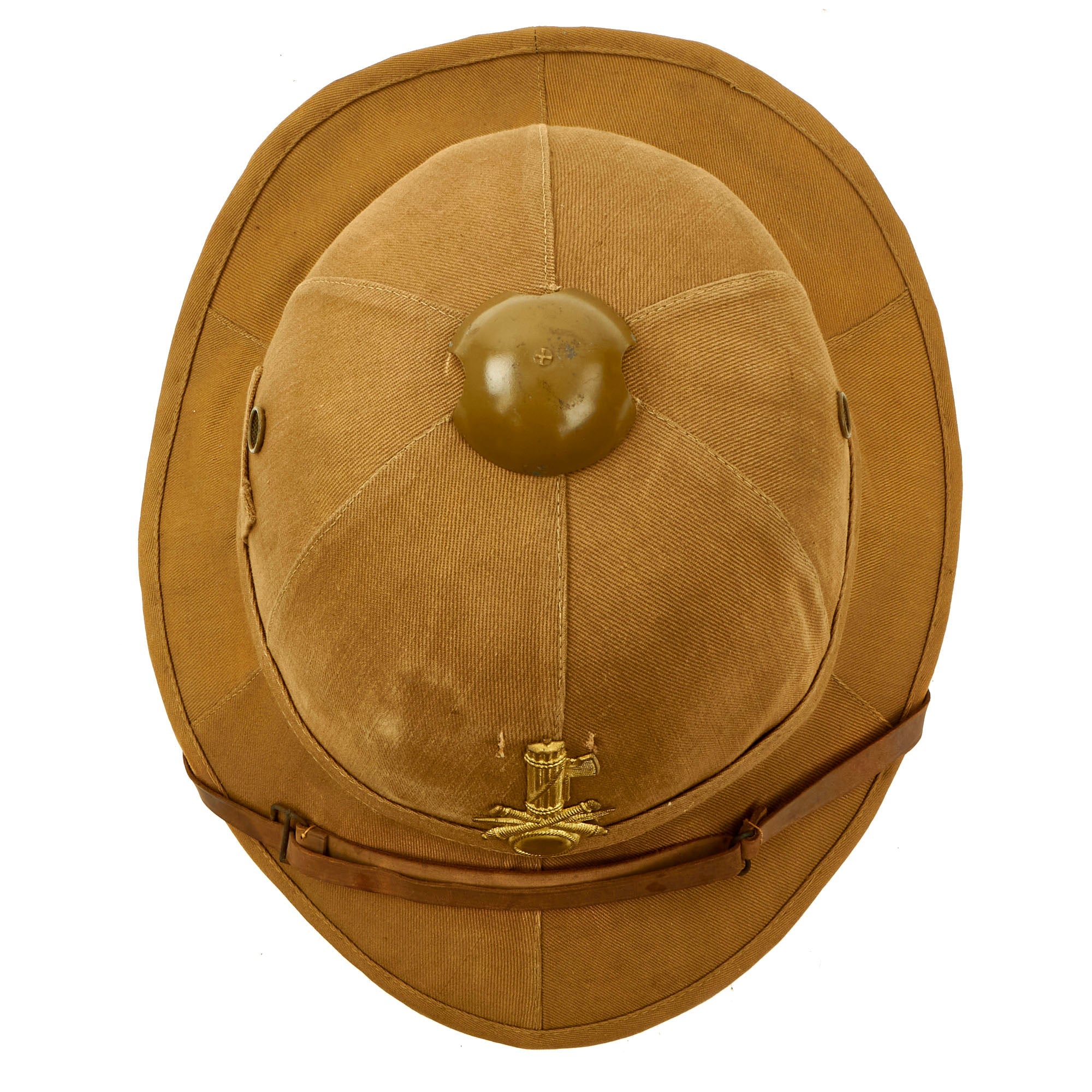 Original Item: Only One available. This is an excellent example of an Italian model 1928 tropical sun helmet (first version pre-WW2) with Italian Anti-Aircraft badge. Overall a hard to find display helmet of an item used during the North African campaign by an Italian officer who most probably came under the command of Rommel's Afrika Korps. This example is offered in excellent condition, complete with metal helmet plate, correct wire vents, chinstrap, and complete liner. There is an ink stamp on the green fabric inner lining indicating size 56, or a US 7.