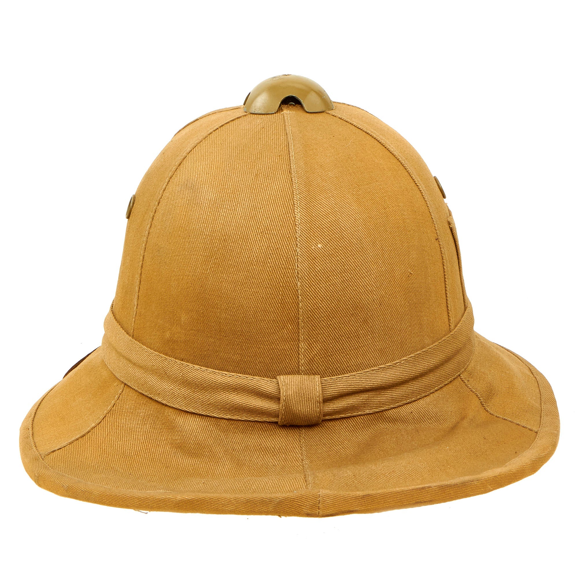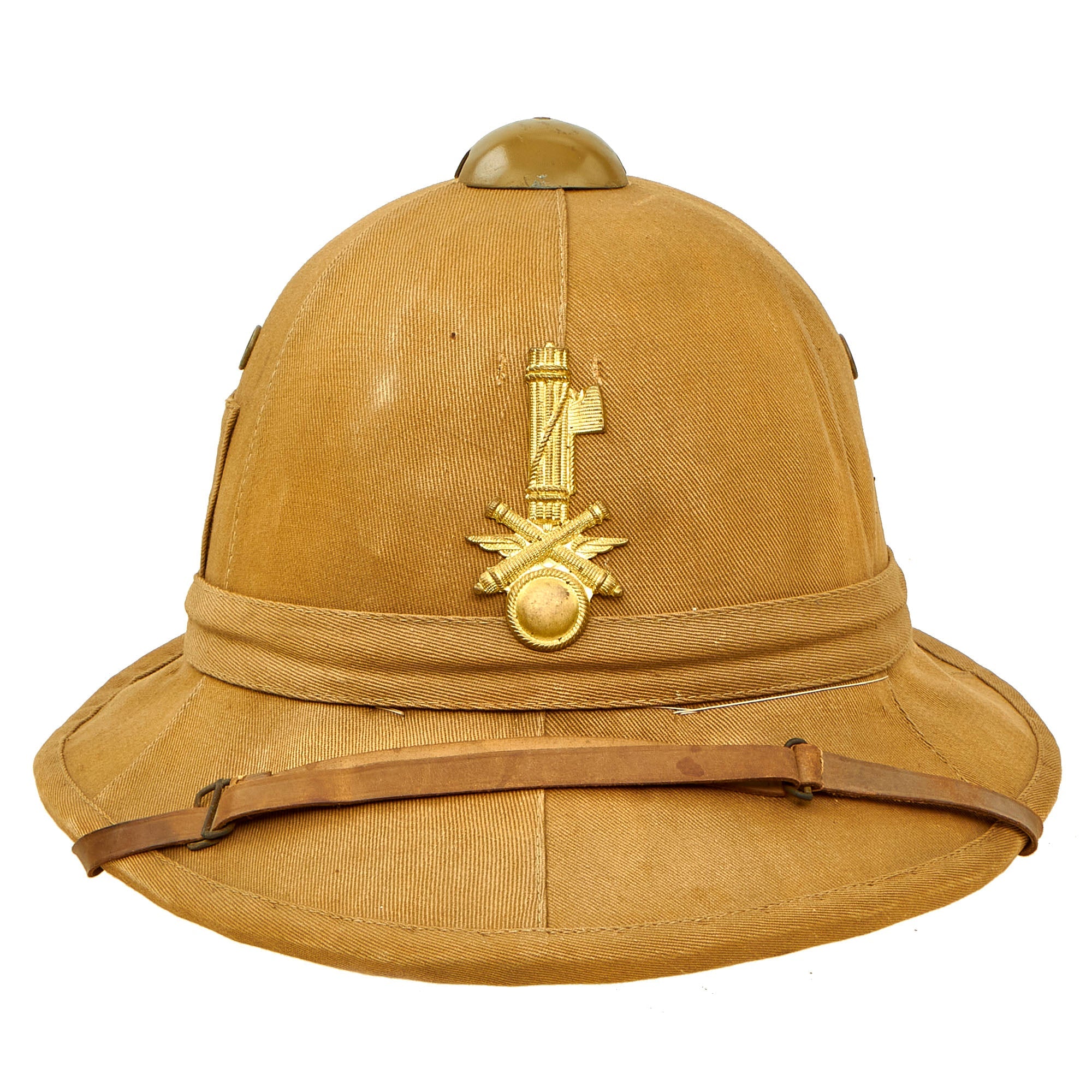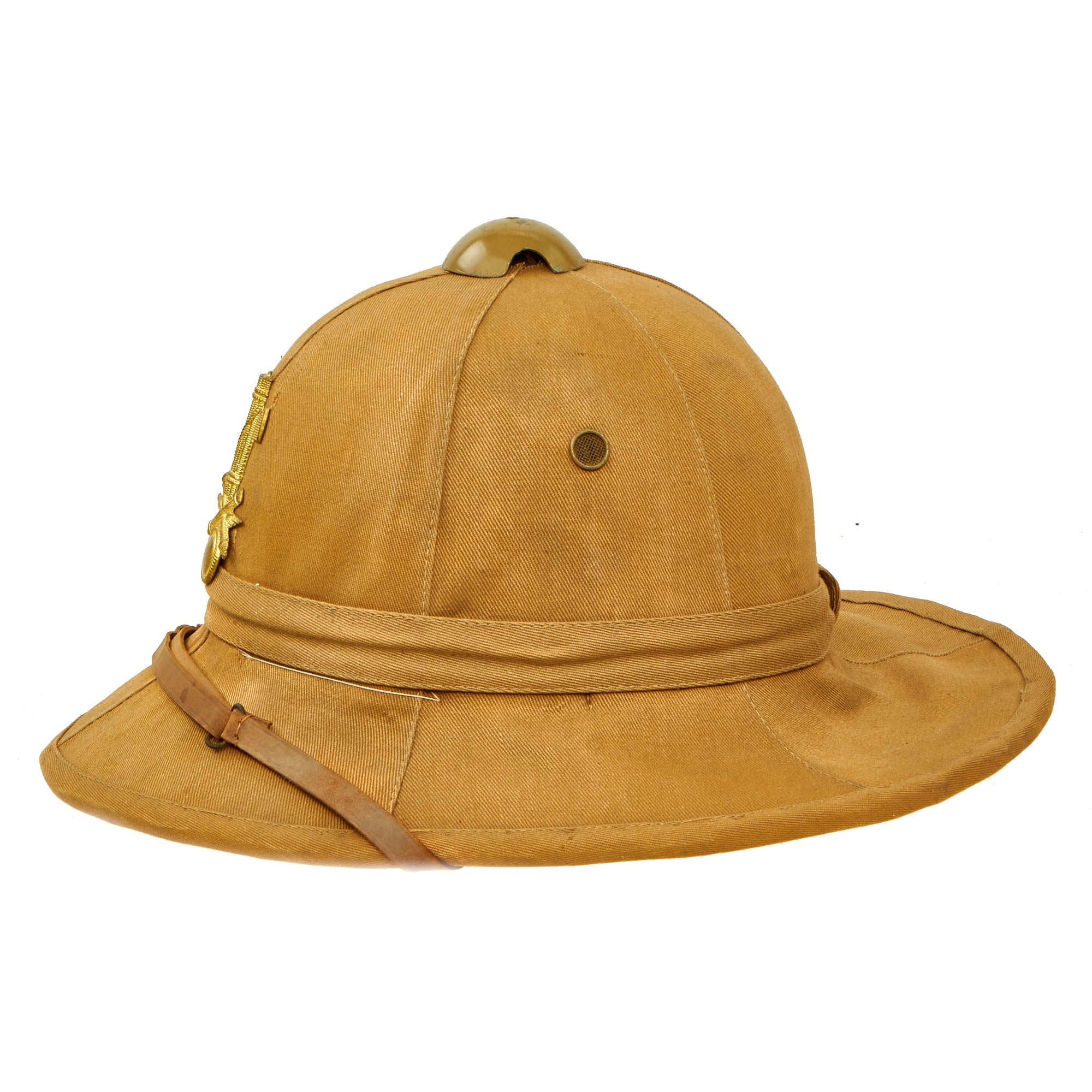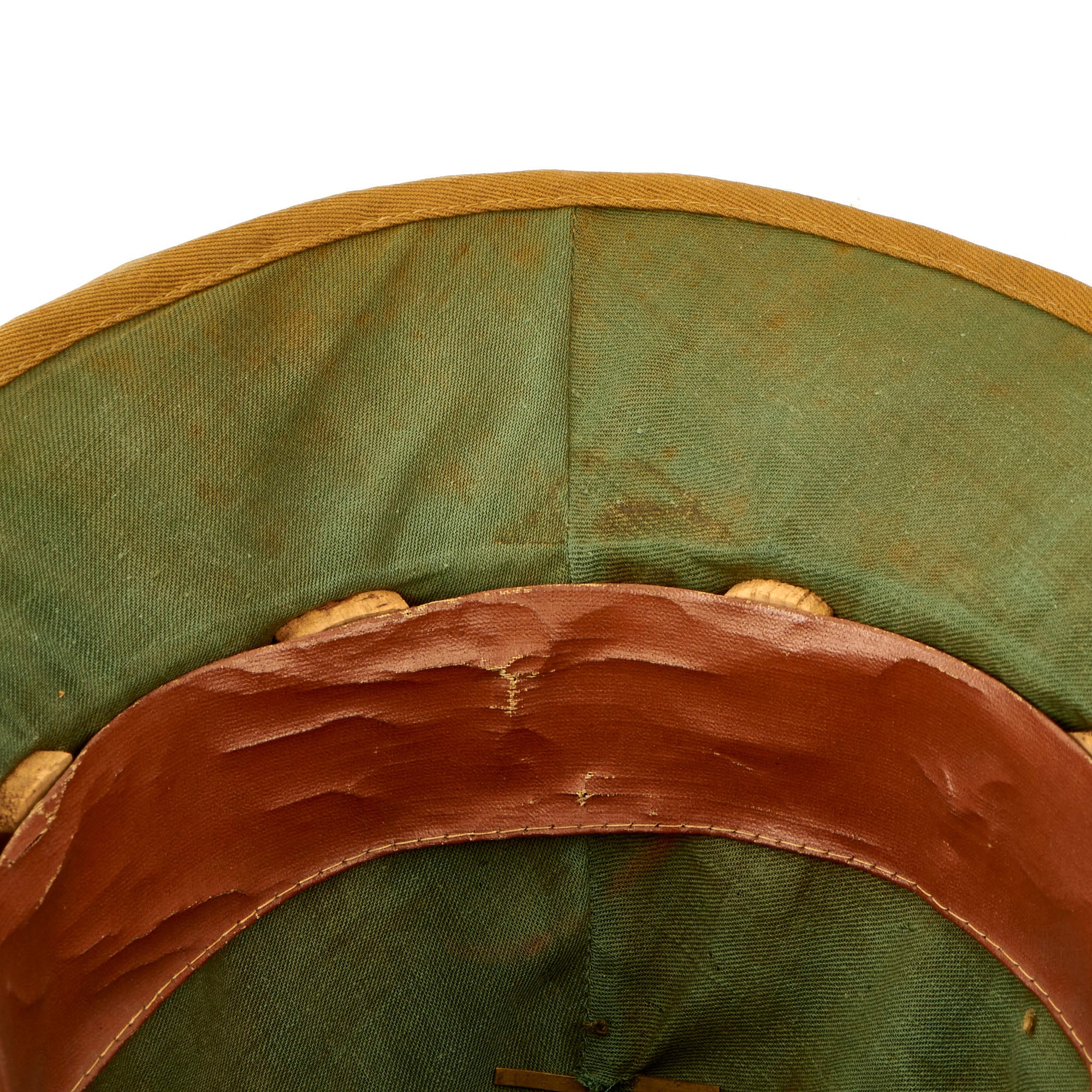 Original Item: Only One available. This is an excellent example of an Italian model 1928 tropical sun helmet (first version pre-WW2) with Italian Anti-Aircraft badge. Overall a hard to find display helmet of an item used during the North African campaign by an Italian officer who most probably came under the command of Rommel's Afrika Korps. This example is offered in excellent condition, complete with metal helmet plate, correct wire vents, chinstrap, and complete liner. There is an ink stamp on the green fabric inner lining indicating size 56, or a US 7.