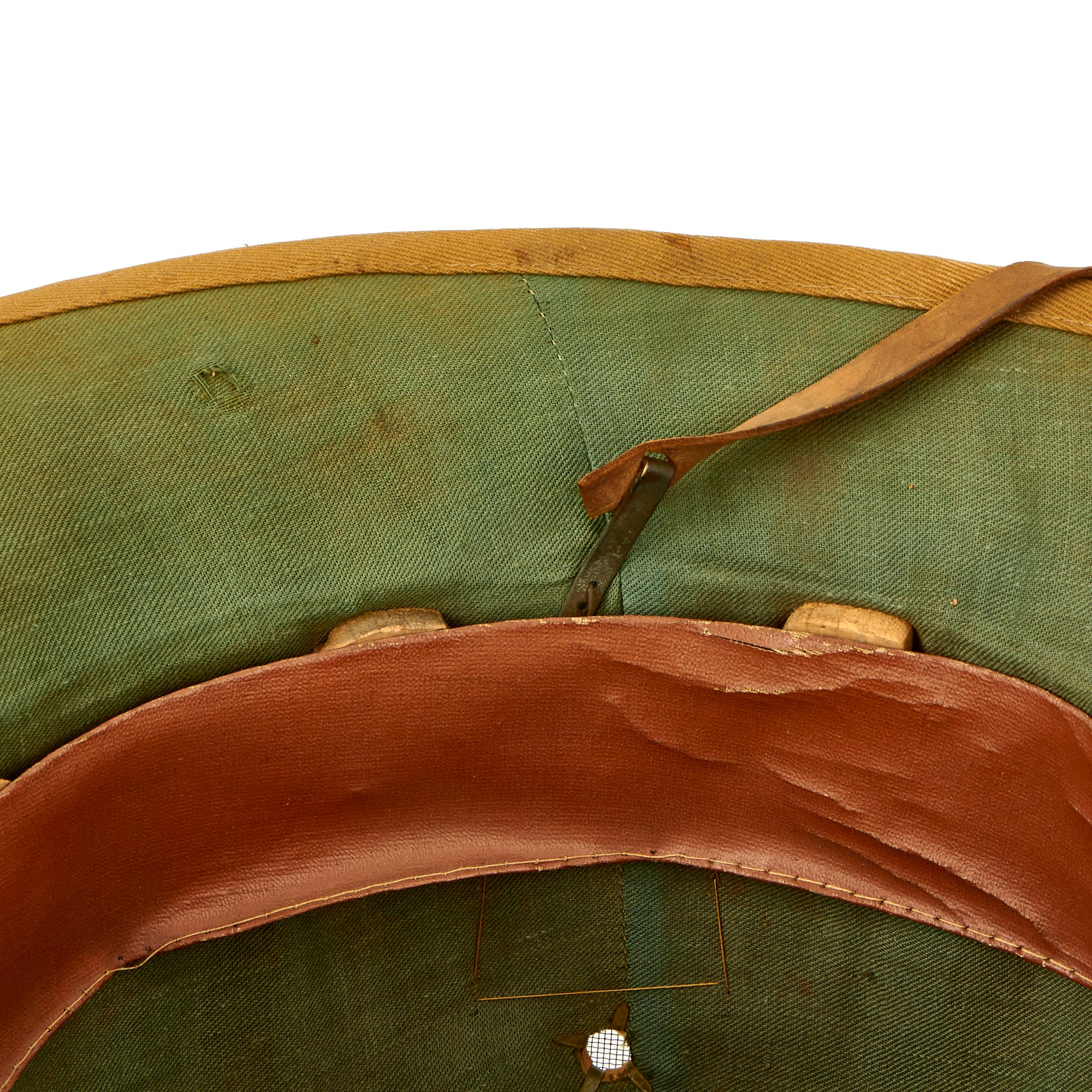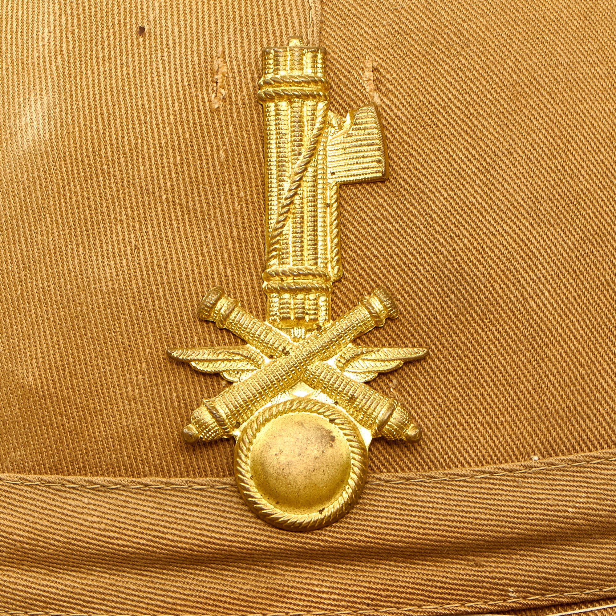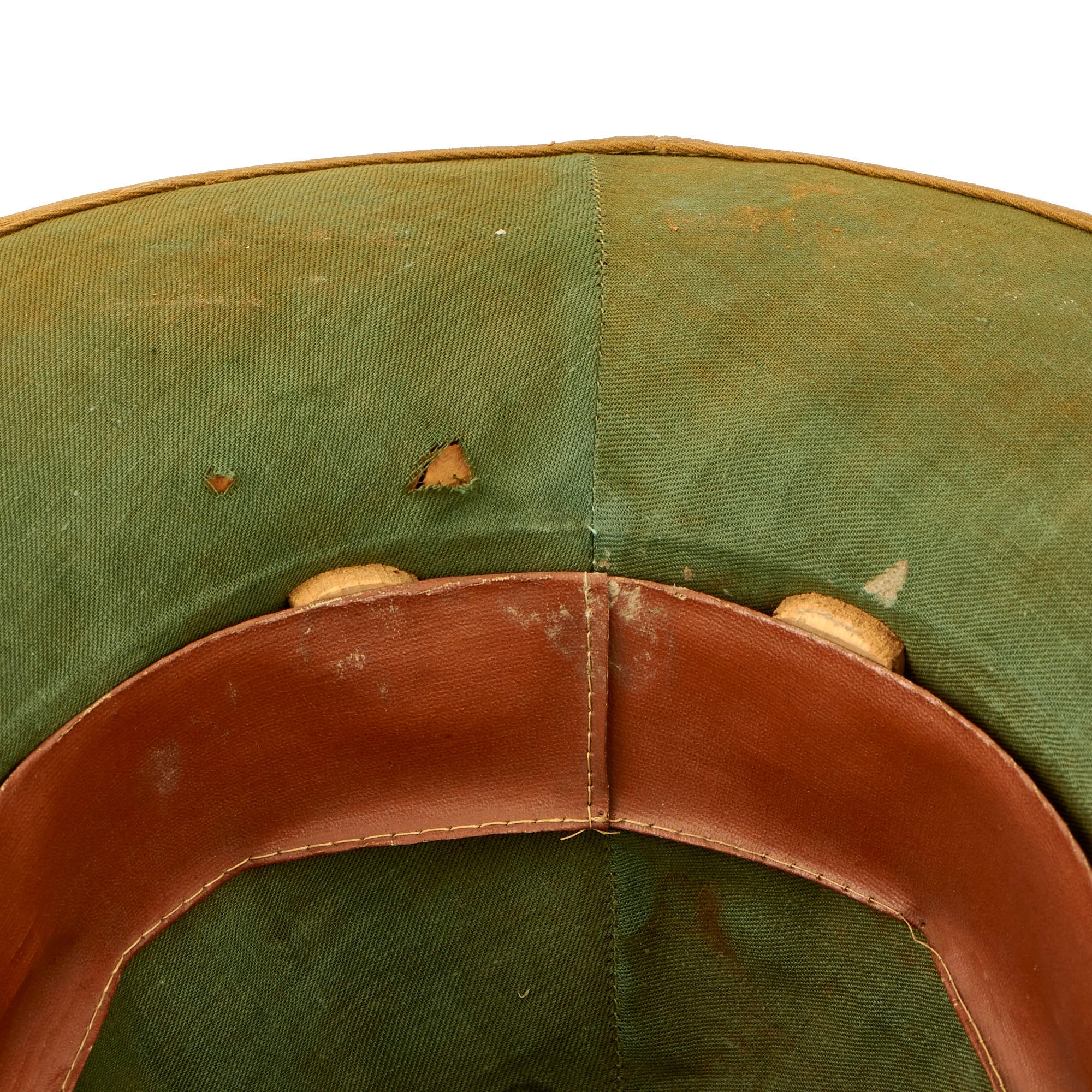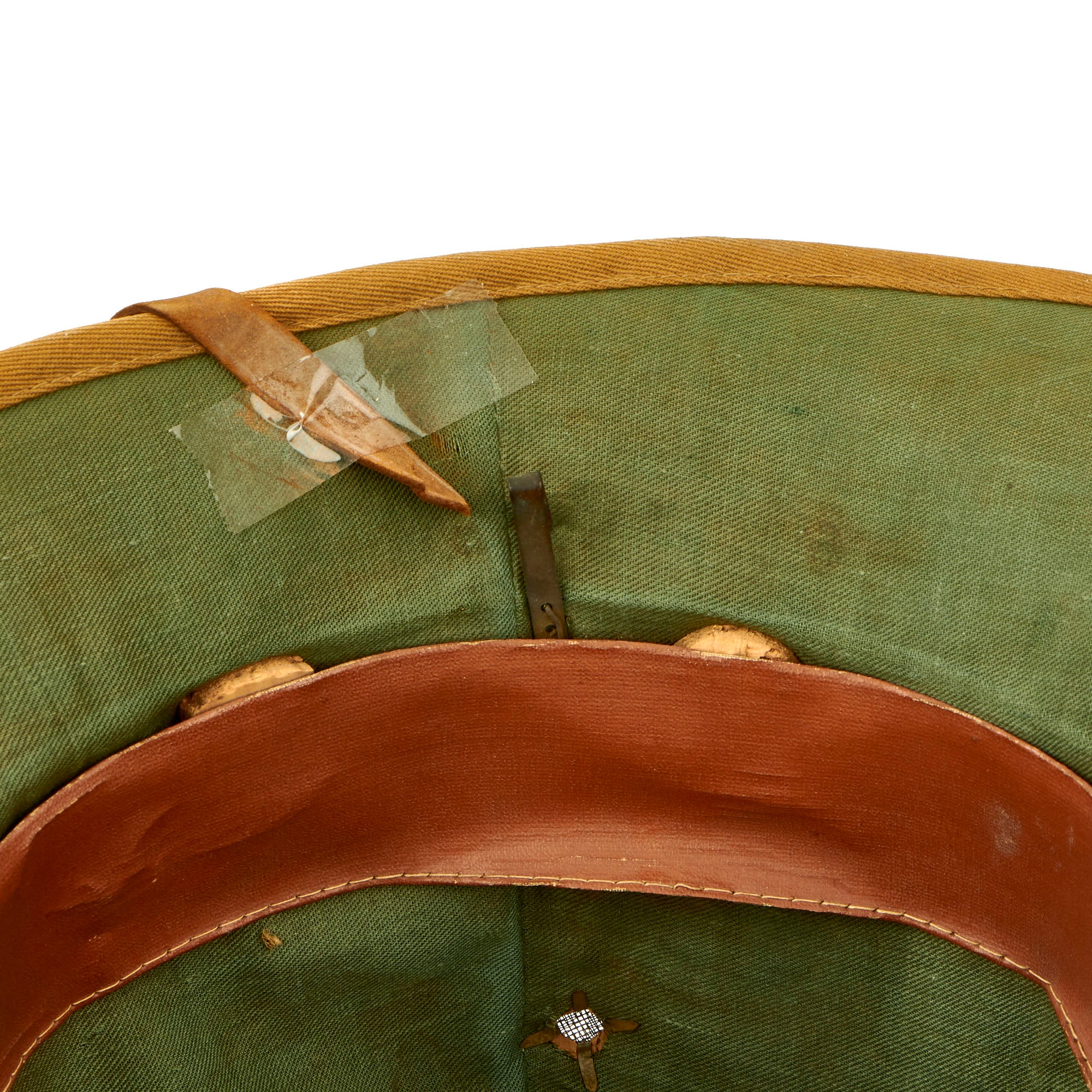 Original Item: Only One available. This is an excellent example of an Italian model 1928 tropical sun helmet (first version pre-WW2) with Italian Anti-Aircraft badge. Overall a hard to find display helmet of an item used during the North African campaign by an Italian officer who most probably came under the command of Rommel's Afrika Korps. This example is offered in excellent condition, complete with metal helmet plate, correct wire vents, chinstrap, and complete liner. There is an ink stamp on the green fabric inner lining indicating size 56, or a US 7.