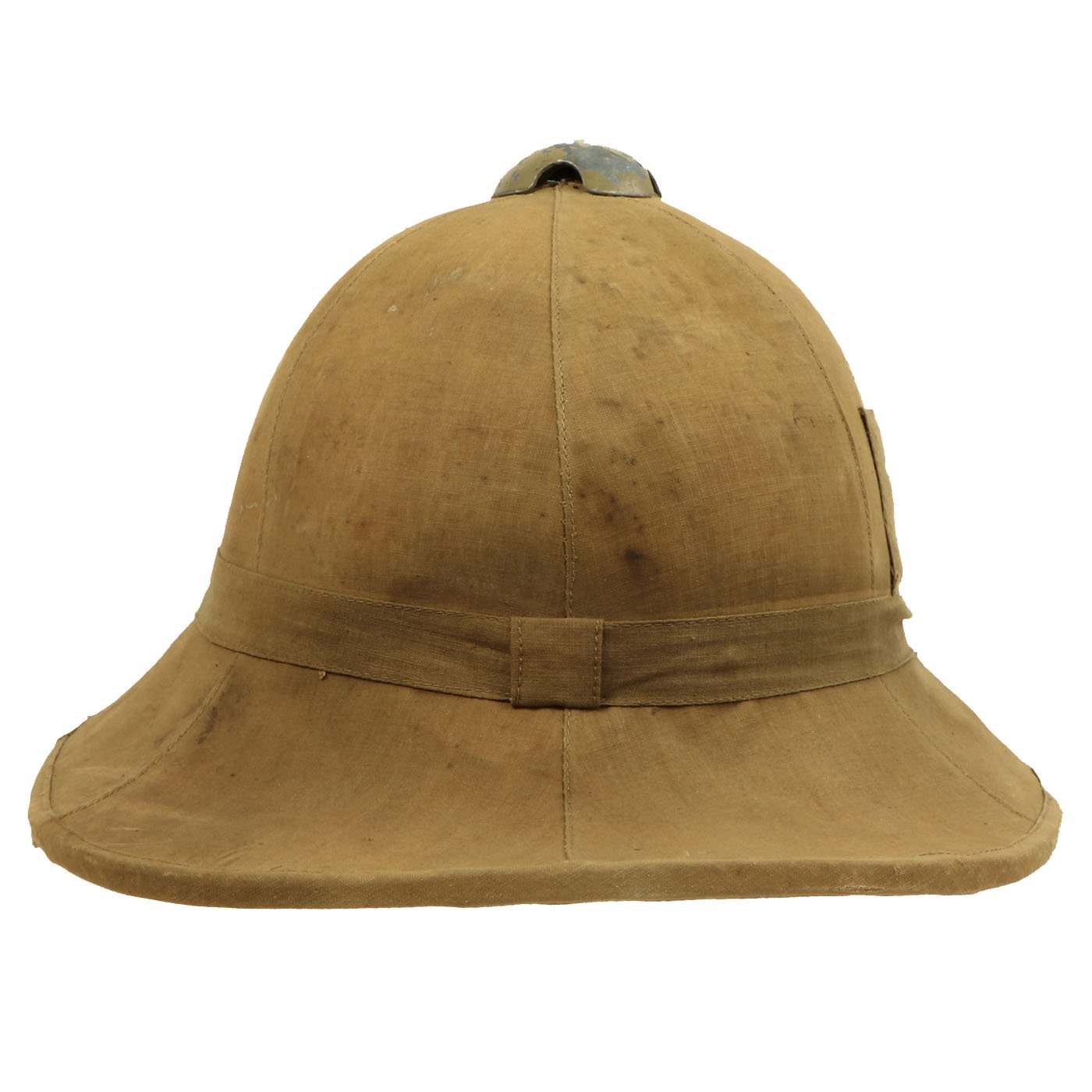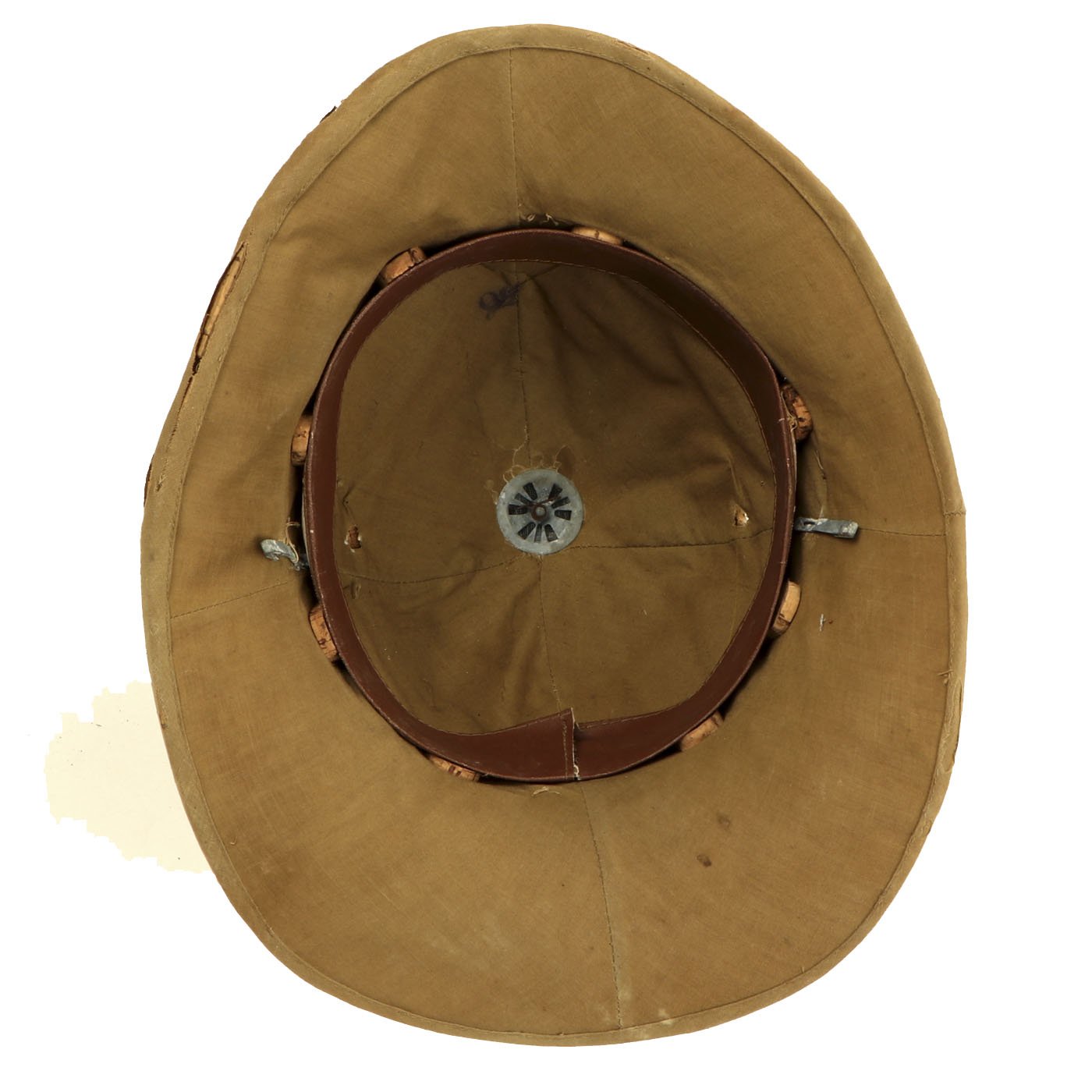 This example is offered in service worn condition, and it definitely has degradation to the cork / pith base layer, with some interior cracks and crumbling. This helmet looks to have been used, which usually involves dousing it with water, which then helps to cool the head. It has two vents punched into the sides of the helmet, which may have had fittings in them at one point. The top vent is intact, but is missing a lot of the original paint. The chin strap is completely missing, though the interior sweatband is still present, and the lining is size marked 58.