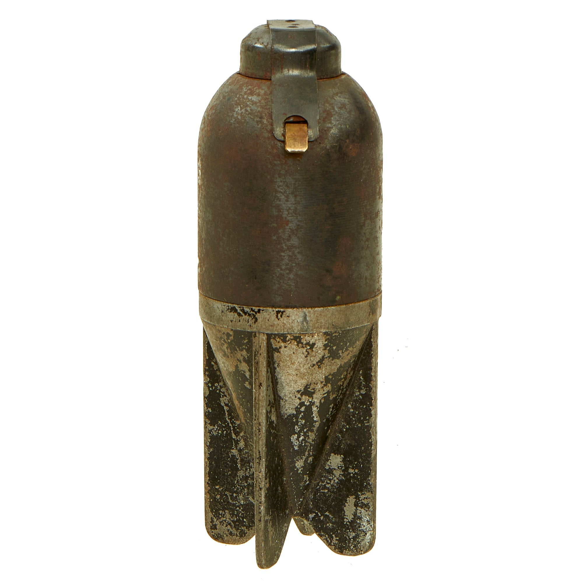 Original Item: Only One Available. This is an excellent condition Italian WW2 "Red Devil" 45mm Brixia Mortar bomb offered in totally inert condition. This example unscrews to reveal the internal explosive cavity and fuse mechanism (no explosives). This example is marker marked SRCM and dated 40 on the side of one of the rear fins, and has original black paint present which identified the type of munition. It has the original cover for the detonator button, held in place by a brass pull clip.