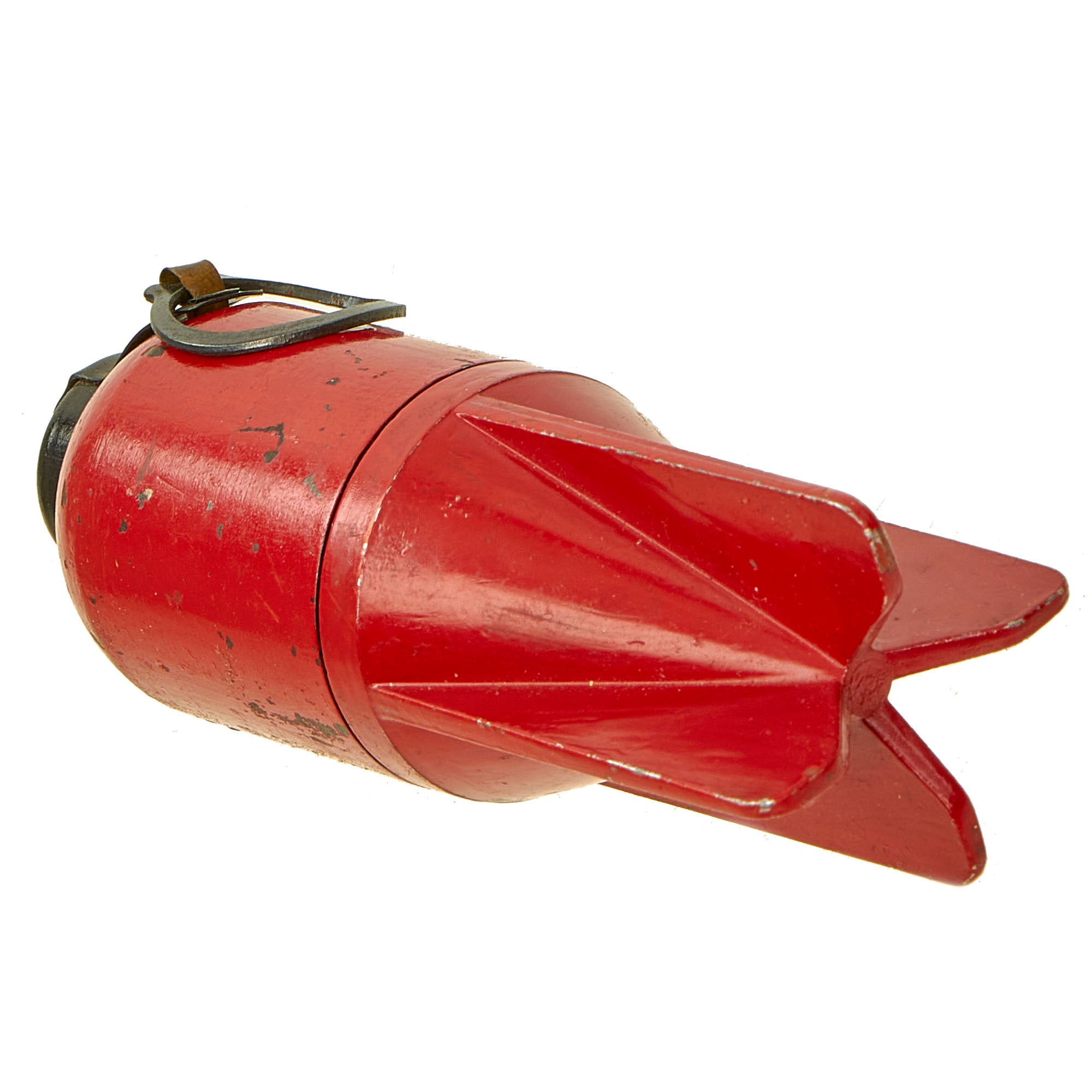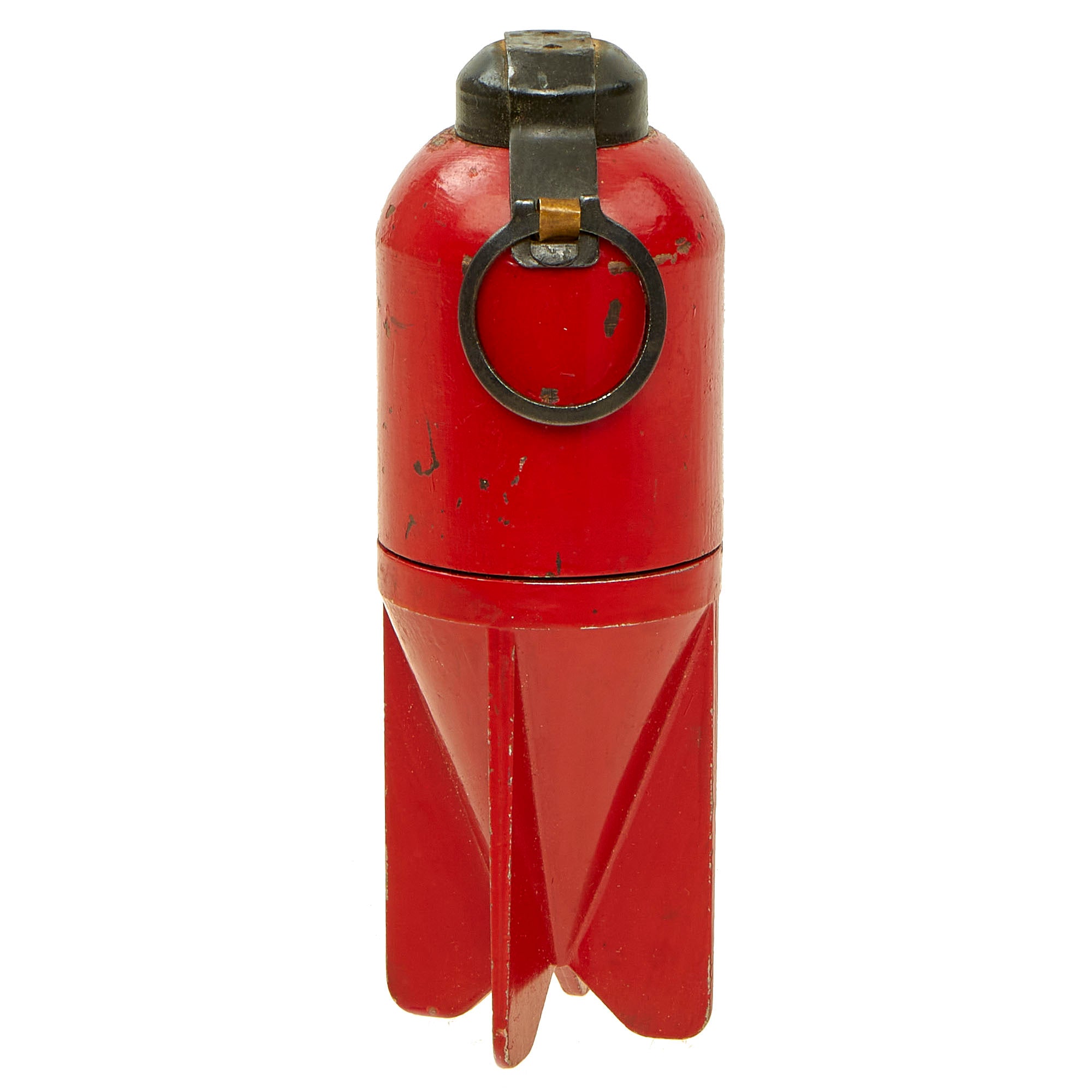 Original Item: Only One Available. This is an excellent condition Italian WW2 "Red Devil" 45mm Brixia Mortar bomb offered in totally inert condition. This example unscrews to reveal the internal explosive cavity and fuse mechanism (no explosives). This example is marker marked SRCM and dated 41 on the side of one of the rear fins, and has original red paint, which indicated the type of round it is. It has the original cover for the detonator button, held in place by a brass pull clip.