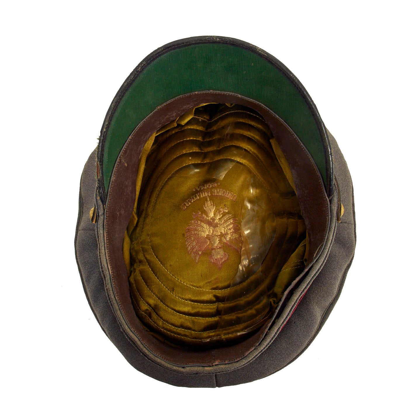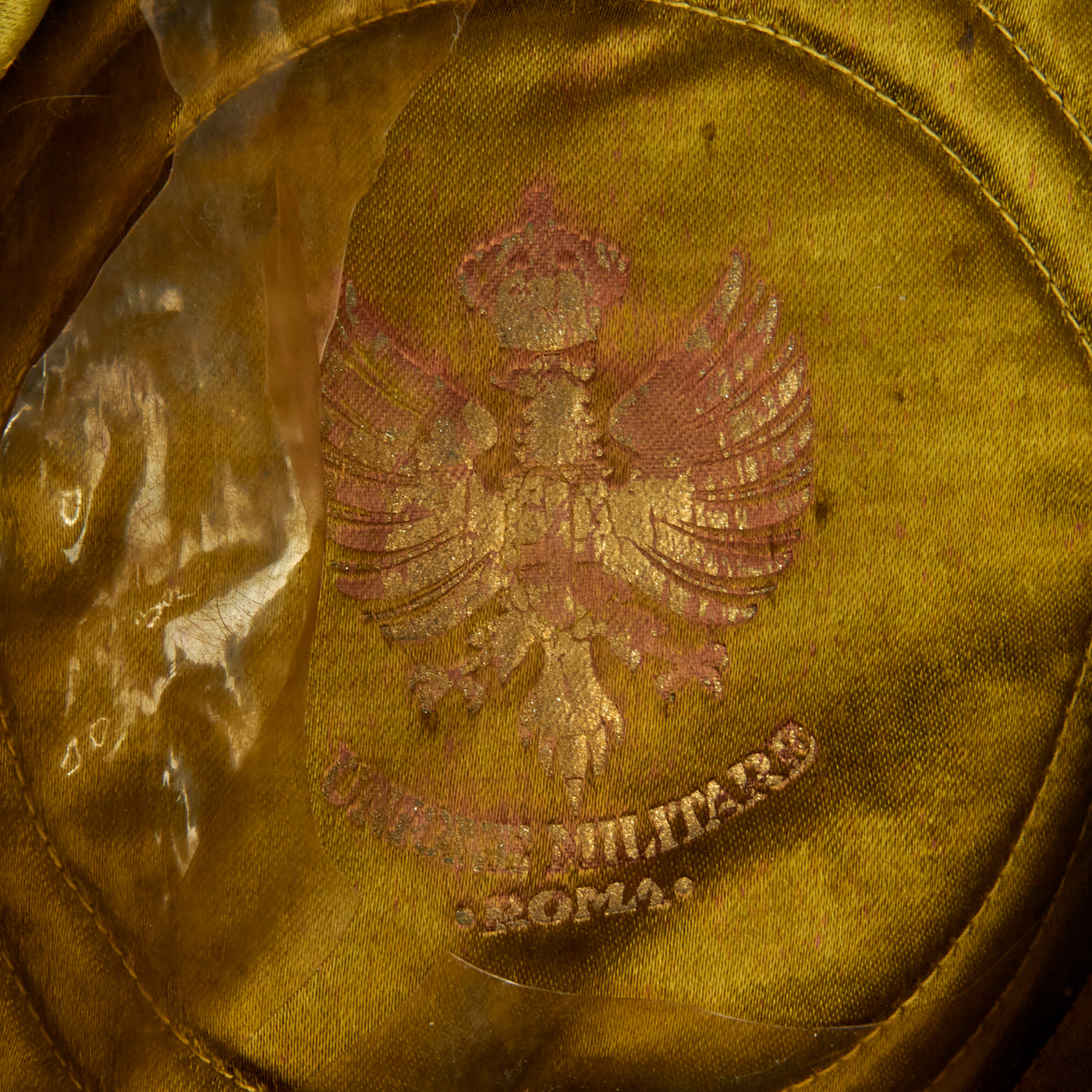 The visor is constructed of a grey, wool/rayon, gabardine. Rank insignia consisting of one, single width, gilt tress, around the centerband, signifying rank of “Sottotenente”, Second Lieutenant. THe front bullion insignia is a wonderful example and the threading is retained quite nicely, only minor loss to the center white. The black patent finished visor still retains most of its reinforced edging material and stitching, and is medium green to its underside. The cap has its original black patent leather chinstrap, with dual adjustment sliders, fixed by gilt-washed alloy buttons, with embossed Artillery insignia. The light brown leather sweatband is fully intact. The cap is fully lined in goldish green, artificial silk. Remnants of the original celluloid shield is present. Nicely maker marked "UNIONE MILITARE ROMA".