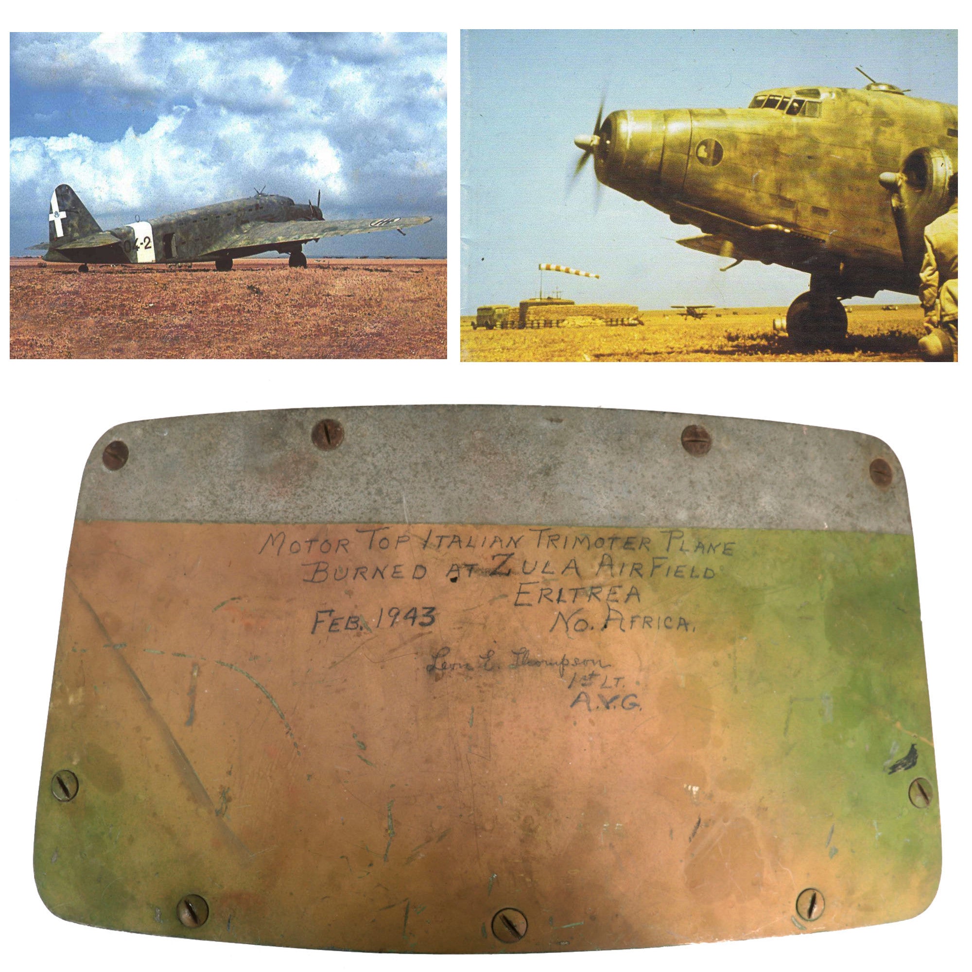 This Italian Savoia-Marchetti SM.82 Engine Cover section was captured by one of the U.S. Army members of the A.V.G, who wrote the full capture information on the camouflage side: