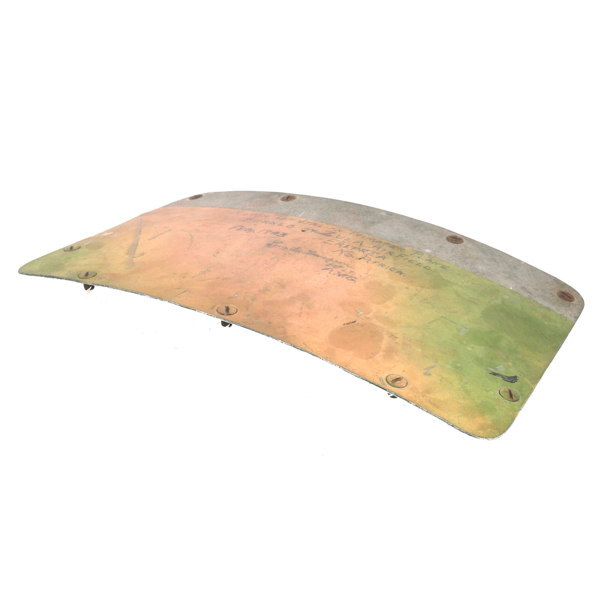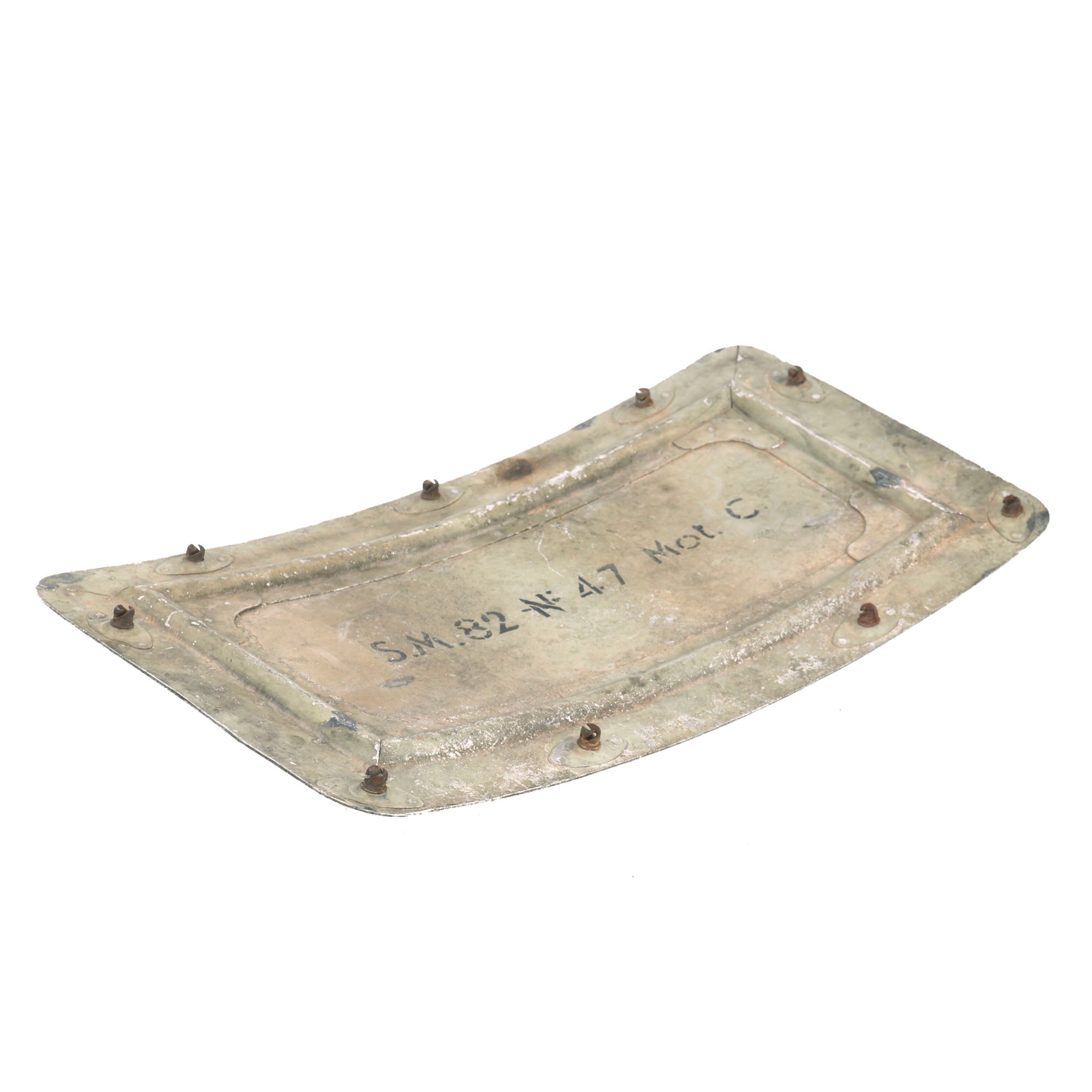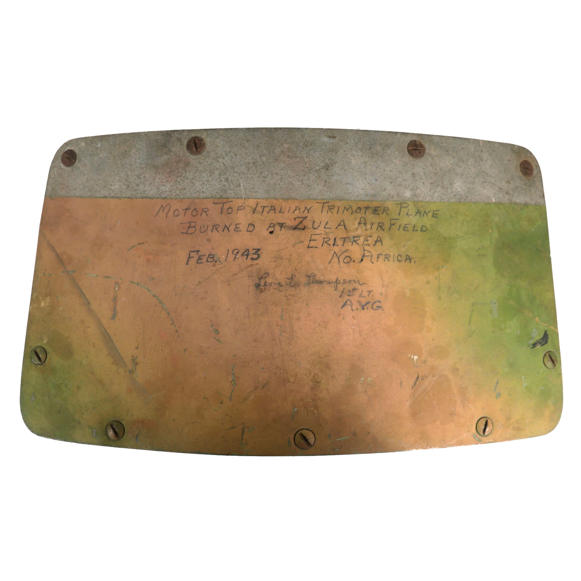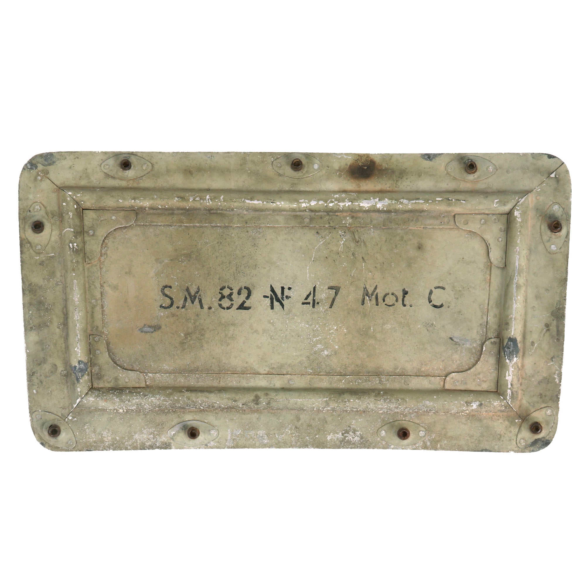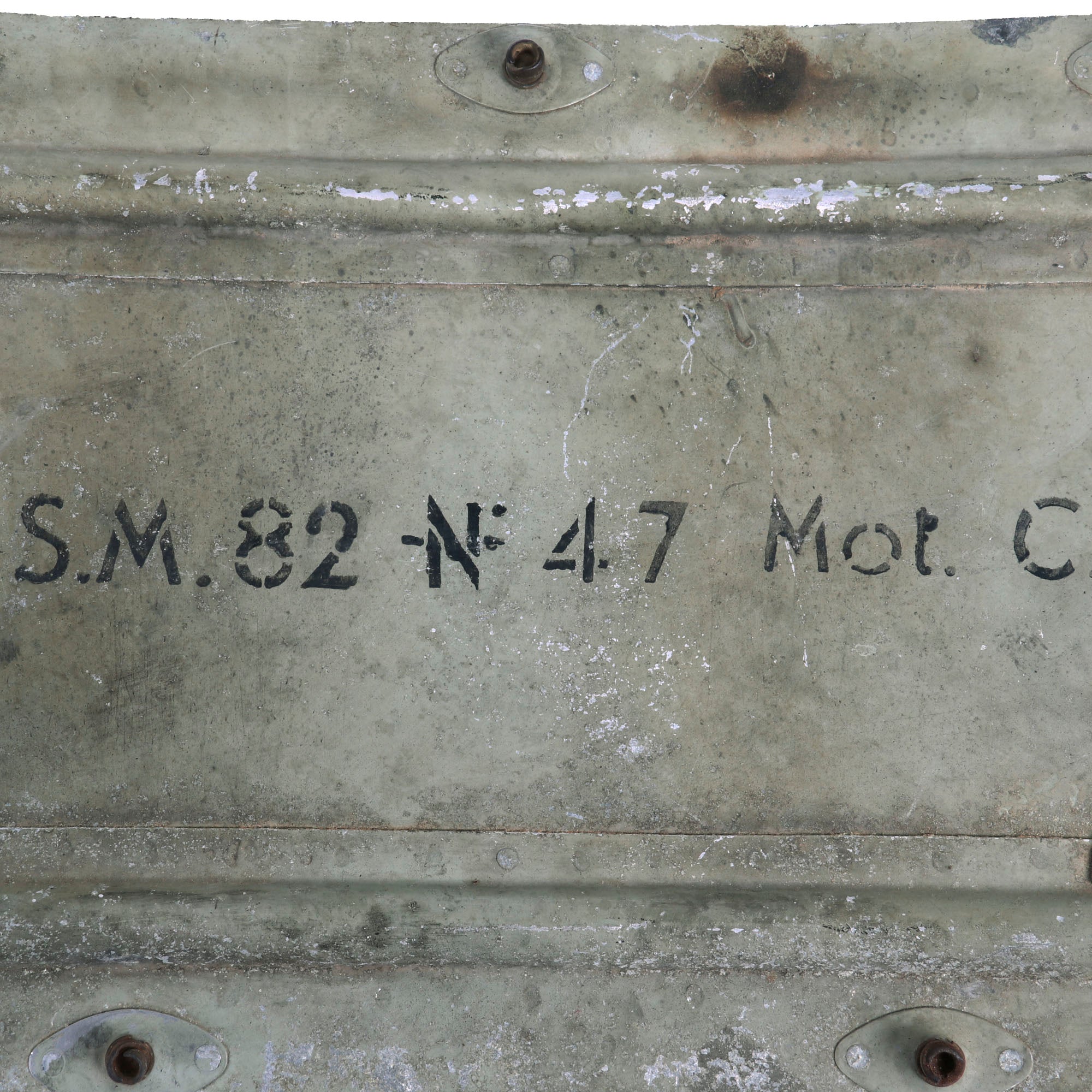 Original Item: One of a Kind. Here we have a fantastic piece of history from the North African Campaign of WWII! This is a wonderful engine cover or cowling section from an Italian WWII Savoia-Marchetti SM.82 Bomber & Transport aircraft, which bears North Africa style camouflage on much of the exterior. It is slightly curved and tapered, and measures approximately 21"W x 11 1/2", with twist lock attachment bolts around the perimeter. The bottom of the aluminum piece has a clear designation added by the manufacturer: