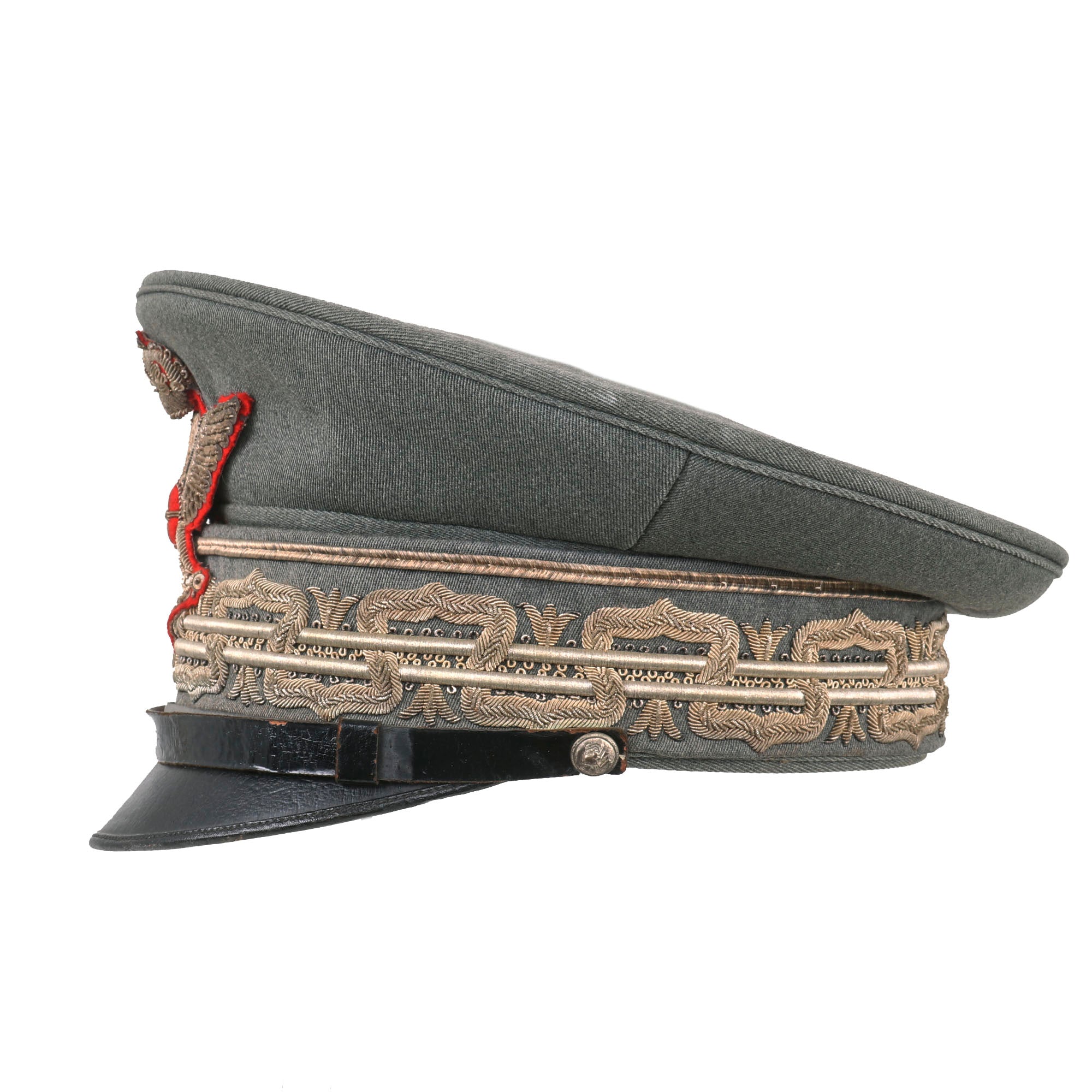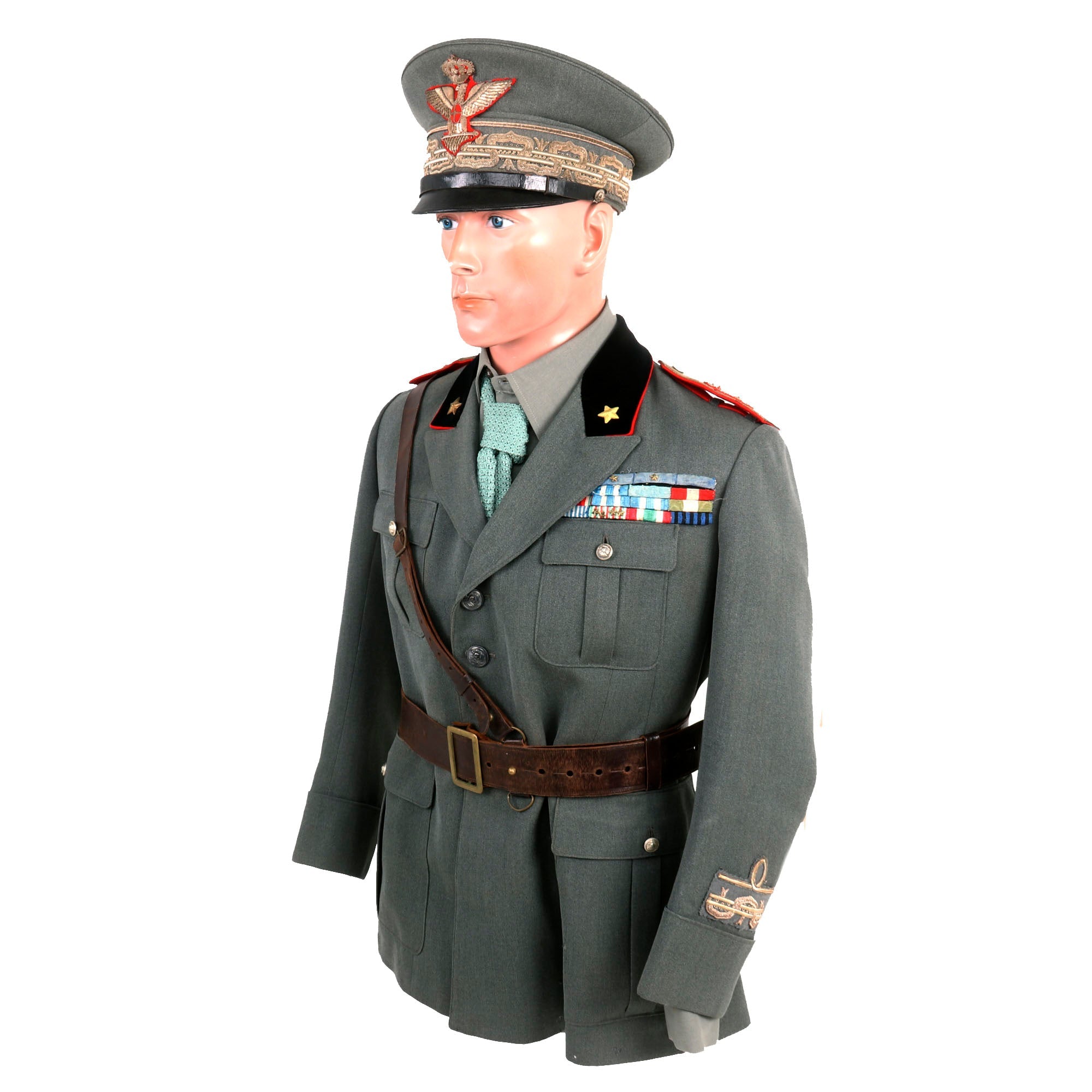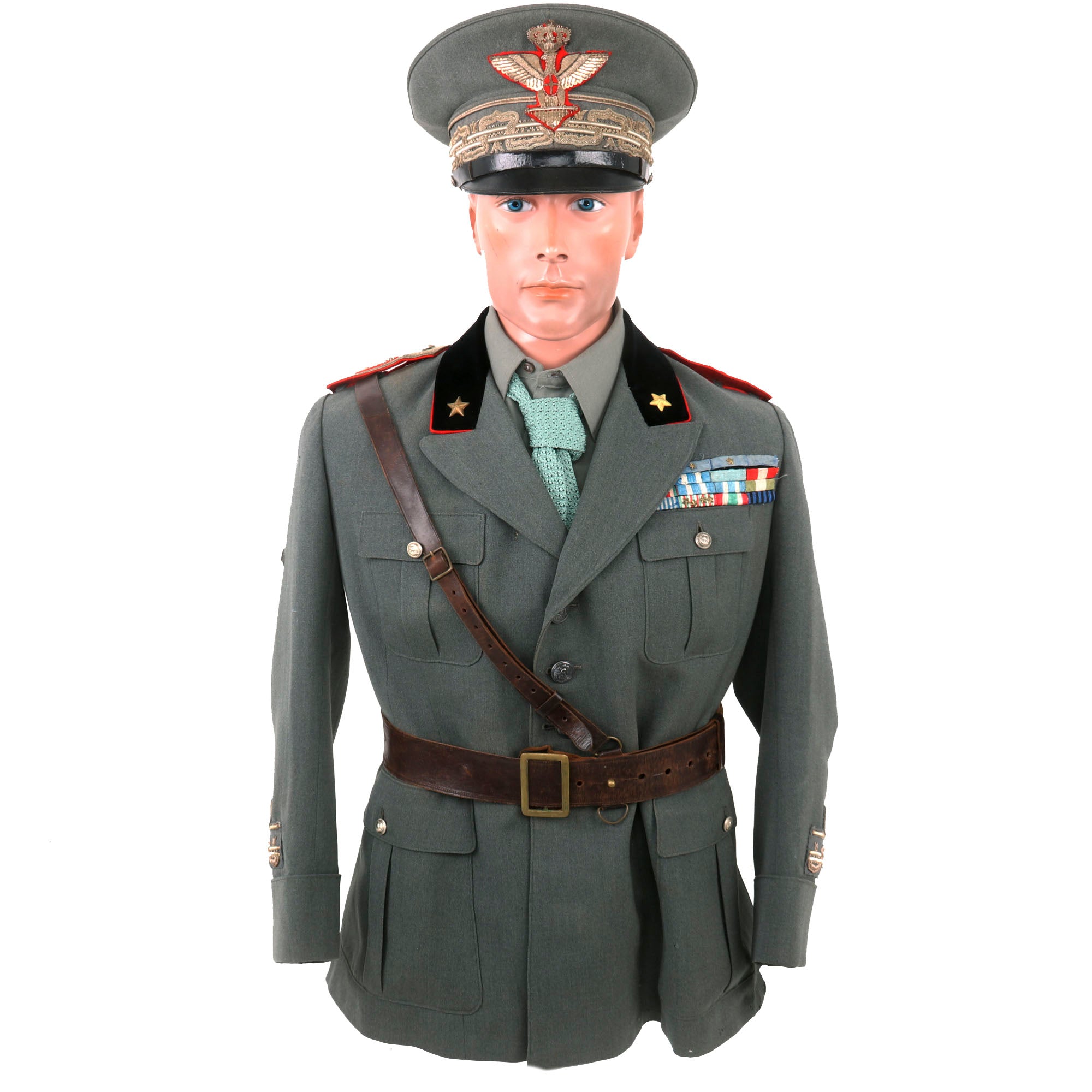 Original Item: Only One Available. World War Two Italian Regio Esercito (Royal Army) General of the Brigade uniform. The uniform is a Model 1934, in excellent condition: detailed bullion wire rank sleeve insignia, epaulets with silver embroidered Savoy Eagle, silver General Officer buttons. The General was well decorated with 4 ribbon bars (15 decorations total). The uniform is made with a high quality gabardine in "grigioverde". Also included is a beautiful peaked cap, service shirt, Sam Browne style cross belt and knit tie.