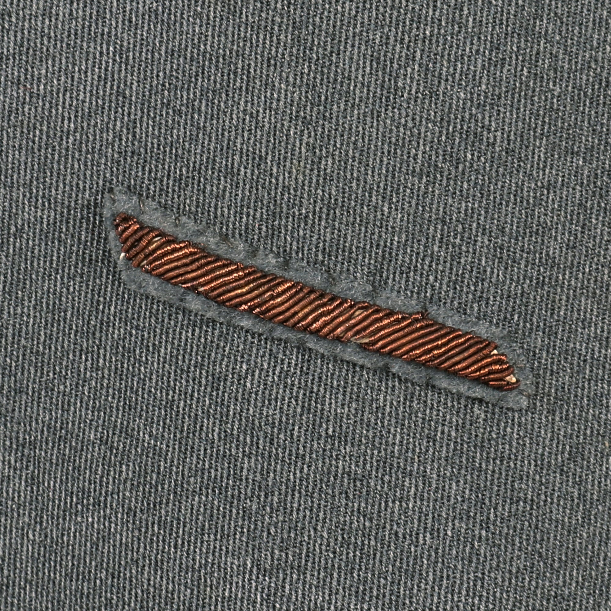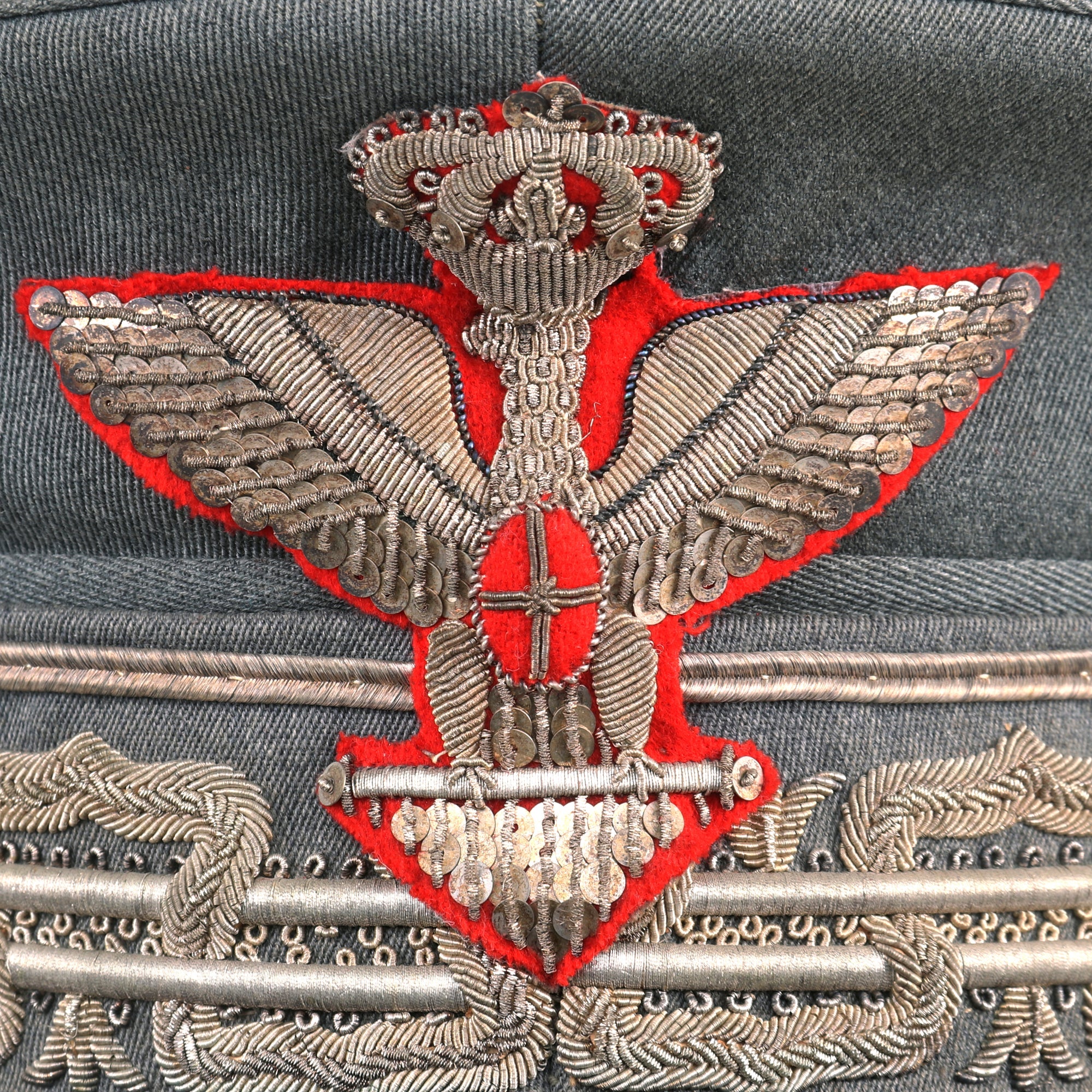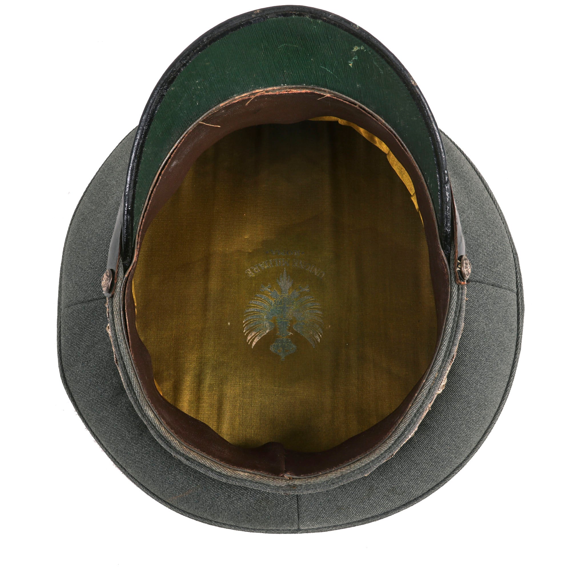 Unfortunately the trousers weren’t received with the uniform set but finding a replacement pair should be easy. The overall condition of the set is just wonderful. Aside from very minor areas of mothing on the uniform and light staining to the ribbons, this uniform displays very well, especially when combined with the included museum sign! The peaked cap has a UNIONE MILITARE ROMA printed label on the top of the mustard yellow polished cotton lining. The sweatband is still present with a great worn color but is unfortunately detached in multiple areas with very fragile thread holding the rest on, so use caution when handling. The bullion embroidered Savoy eagle is still bright and beautiful.