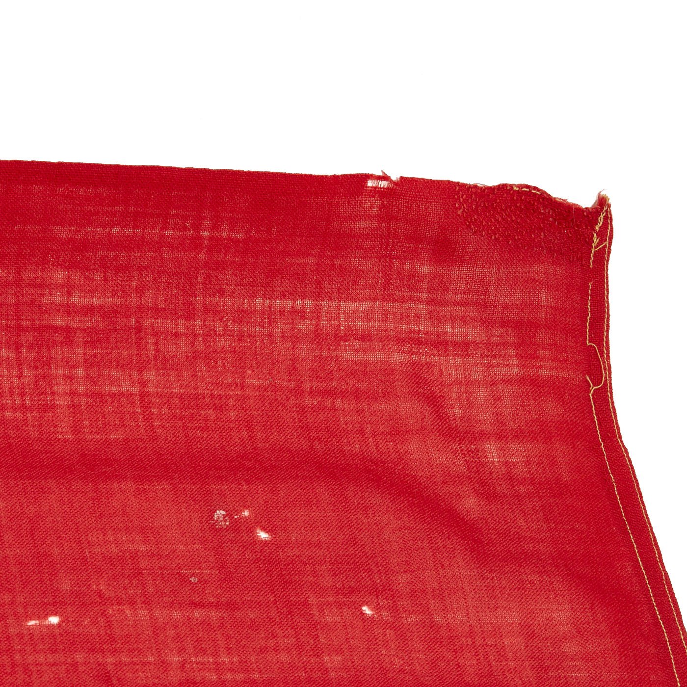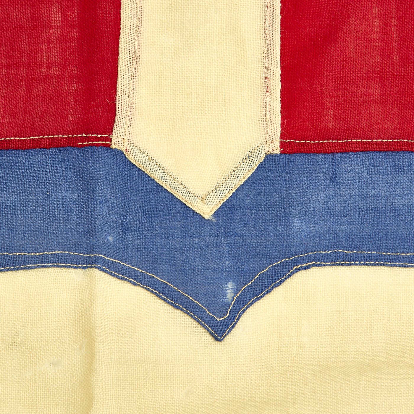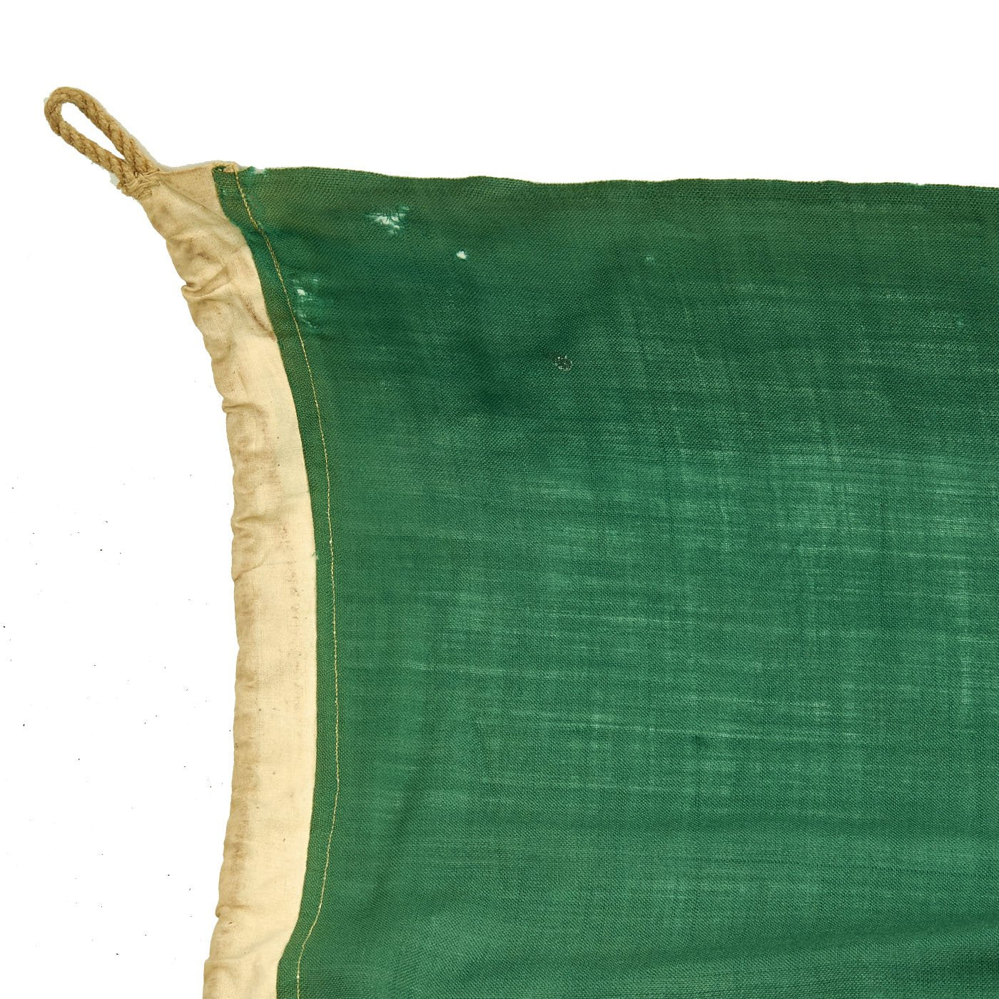 The flag does show light wear, and has a few scattered wear holes as shown. It is constructed of wool, which went out of favor quickly after WWII as superior synthetics were available. The halyard is still present, with a loop at the top, however the bottom extension has been removed.