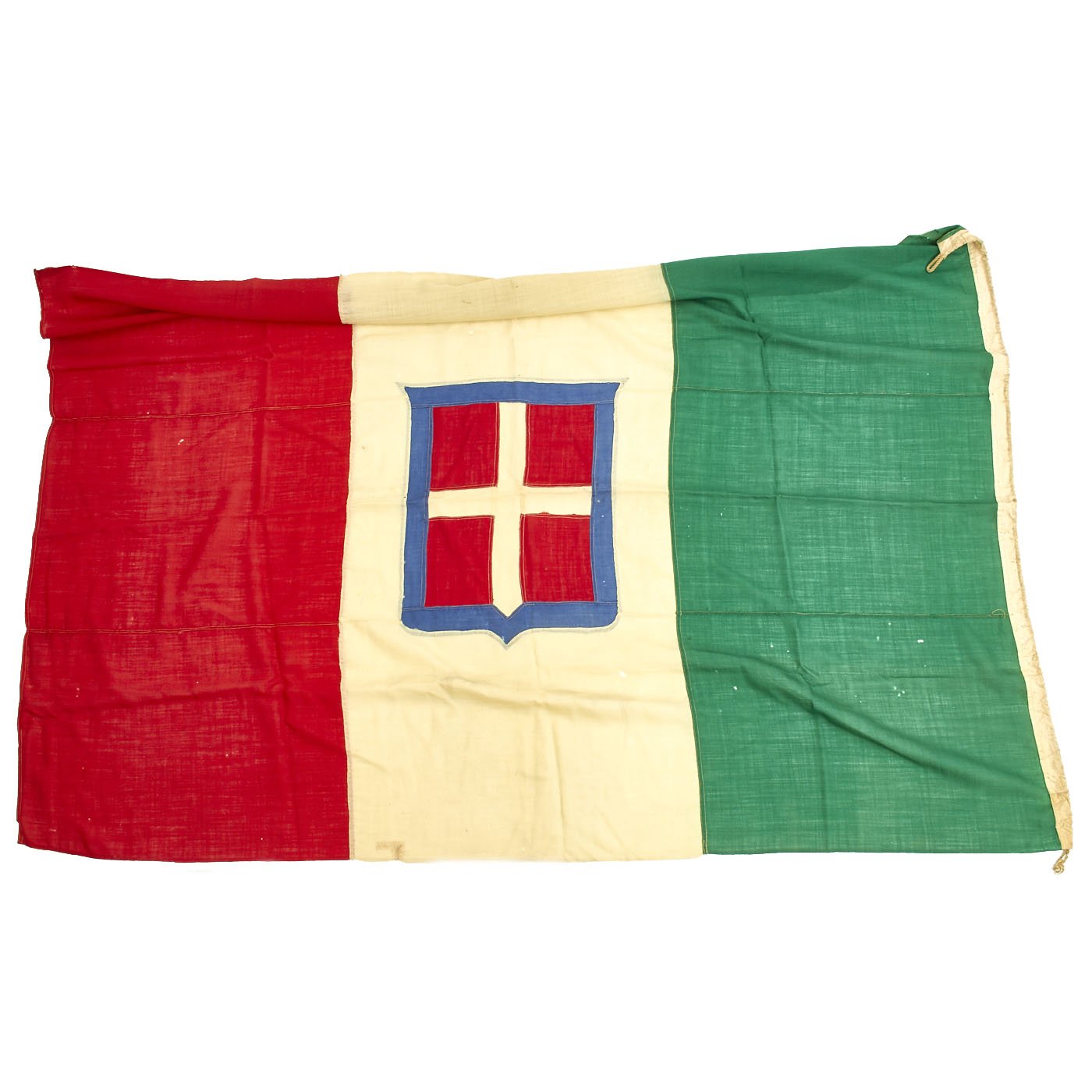 Original Item: Only One Available. Brought back by a USGI after WWII, this is a very good condition Italian National Flag, which measures approximately 57" X 84". The flag header is unmarked, but this flag seems to have seen long service, so it was probably washed several times, which probably removed the markings. This flag design was replaced in 1946 with the current Italian flag.