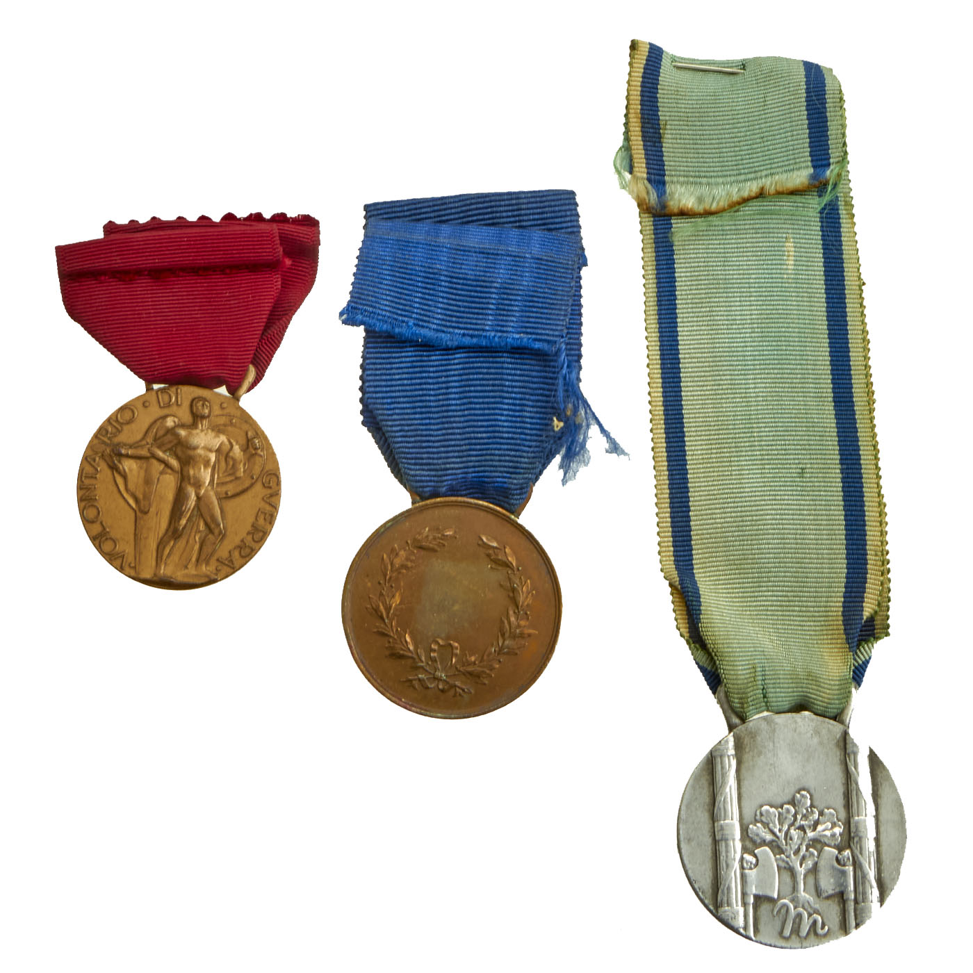 - Medal for the War Volunteer 1915-1918: The medal is circular. The obverse depicts the crowned head of “Italia” and the inscription “PER L’ITALIA” (or “For Italy“). The reverse bears a naked warrior bearing a shield and a veiled woman behind him. Around the rim of the medal is the inscription “VOLONTARIO DI GVERRA” (“War volunteer” and no dates of the war).