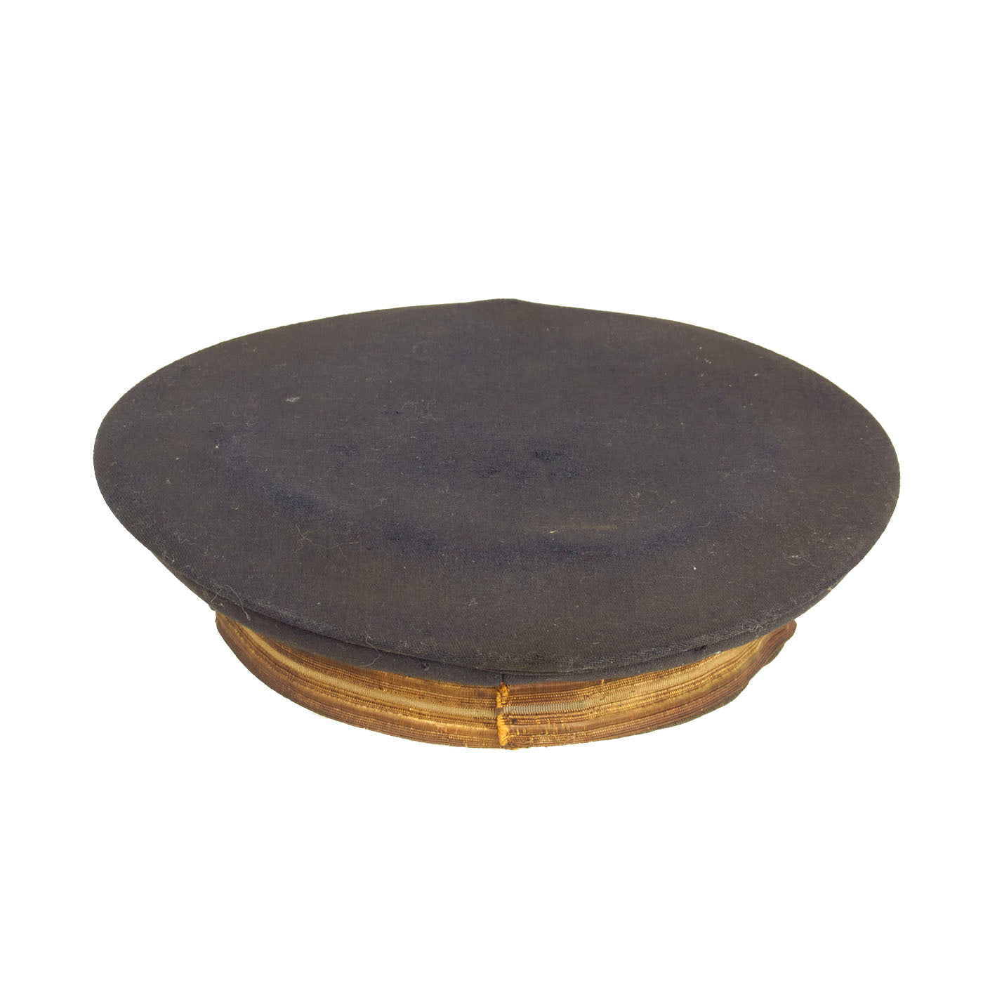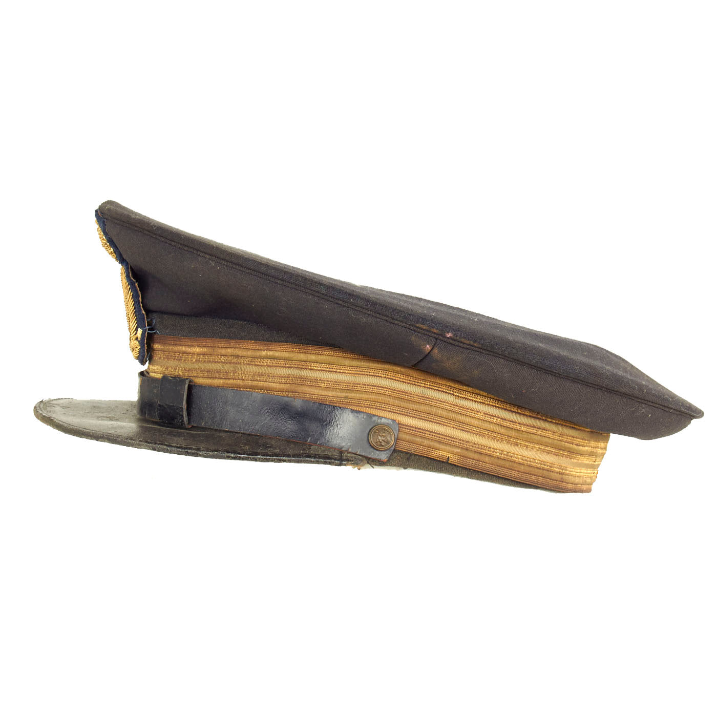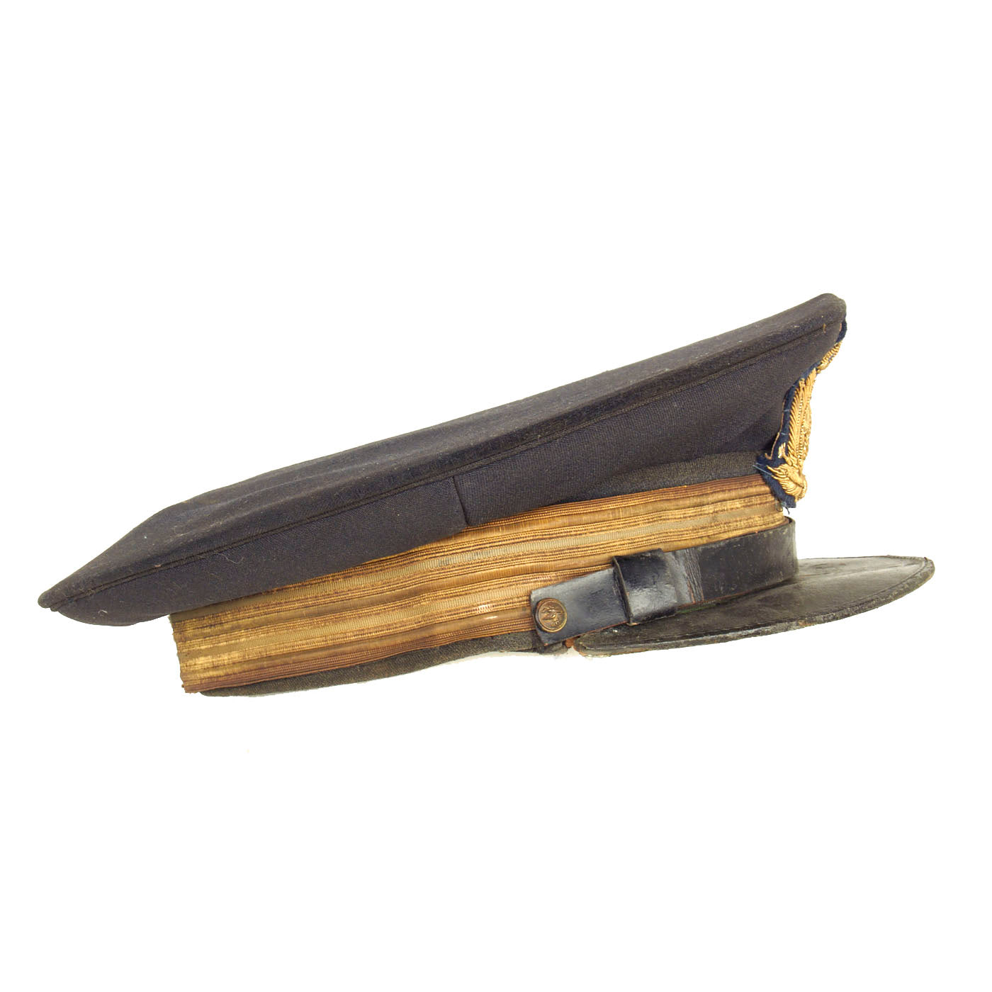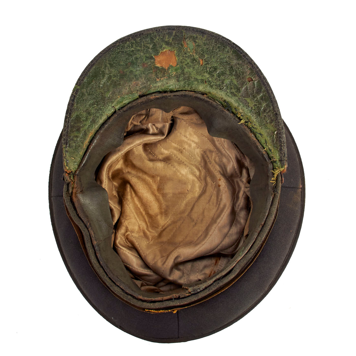 The visor is in good condition with the condition reflecting signs of consistent service wear. The dark wool exterior is in excellent condition with very minor, if any moth nips present but does have staining present. The officers insignia on the front consists of a bullion Air Force insignia with laurels, eagle and crown at the top. The black visor on the front is in fair condition with cracks in the finish and the green pressed paper underside being cracked extensively with sections missing.
