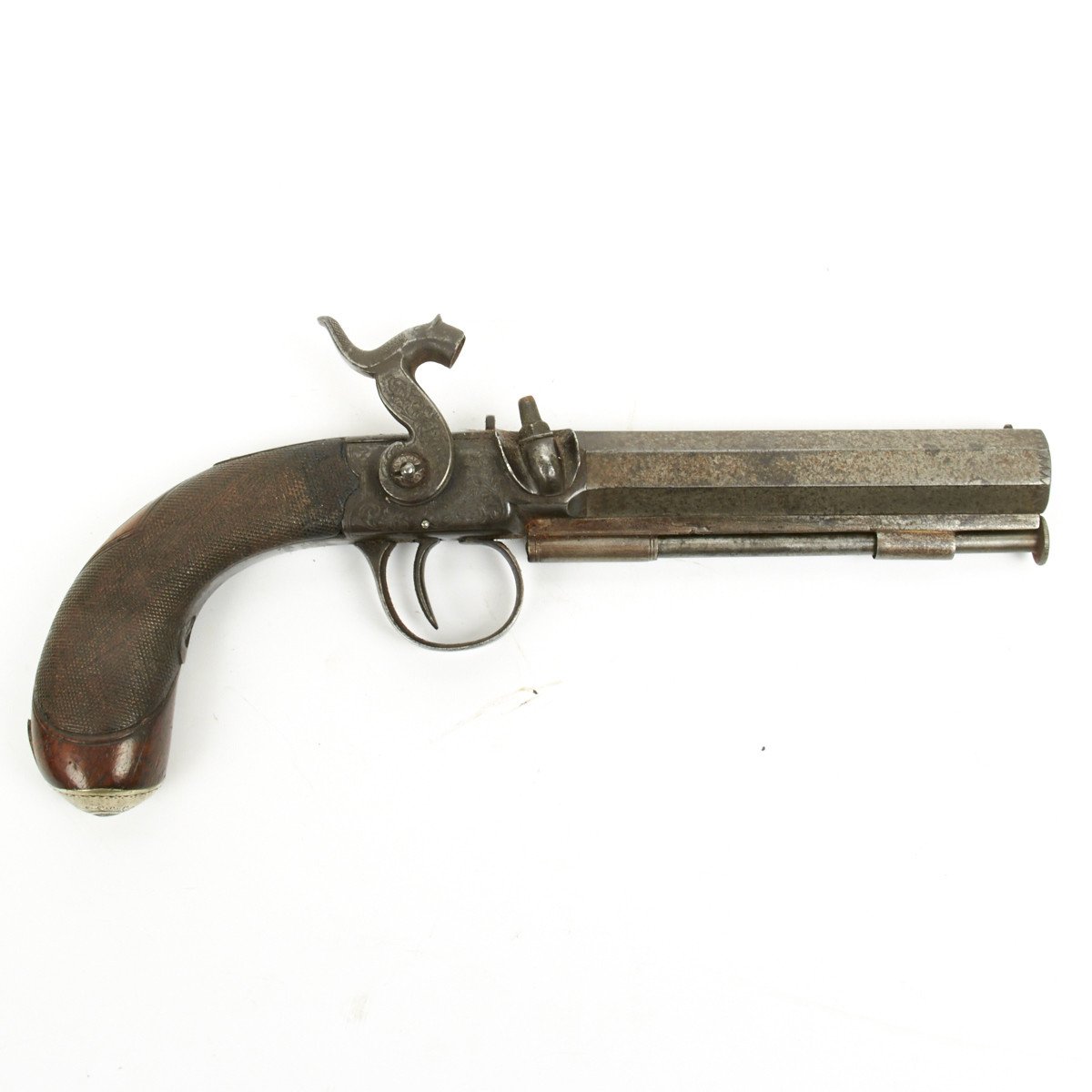 On the lower level of the case there is a single shot percussion pocket pistol circa 1865 made by G.STURMAN of ISLINGTON bearing initials E.R.