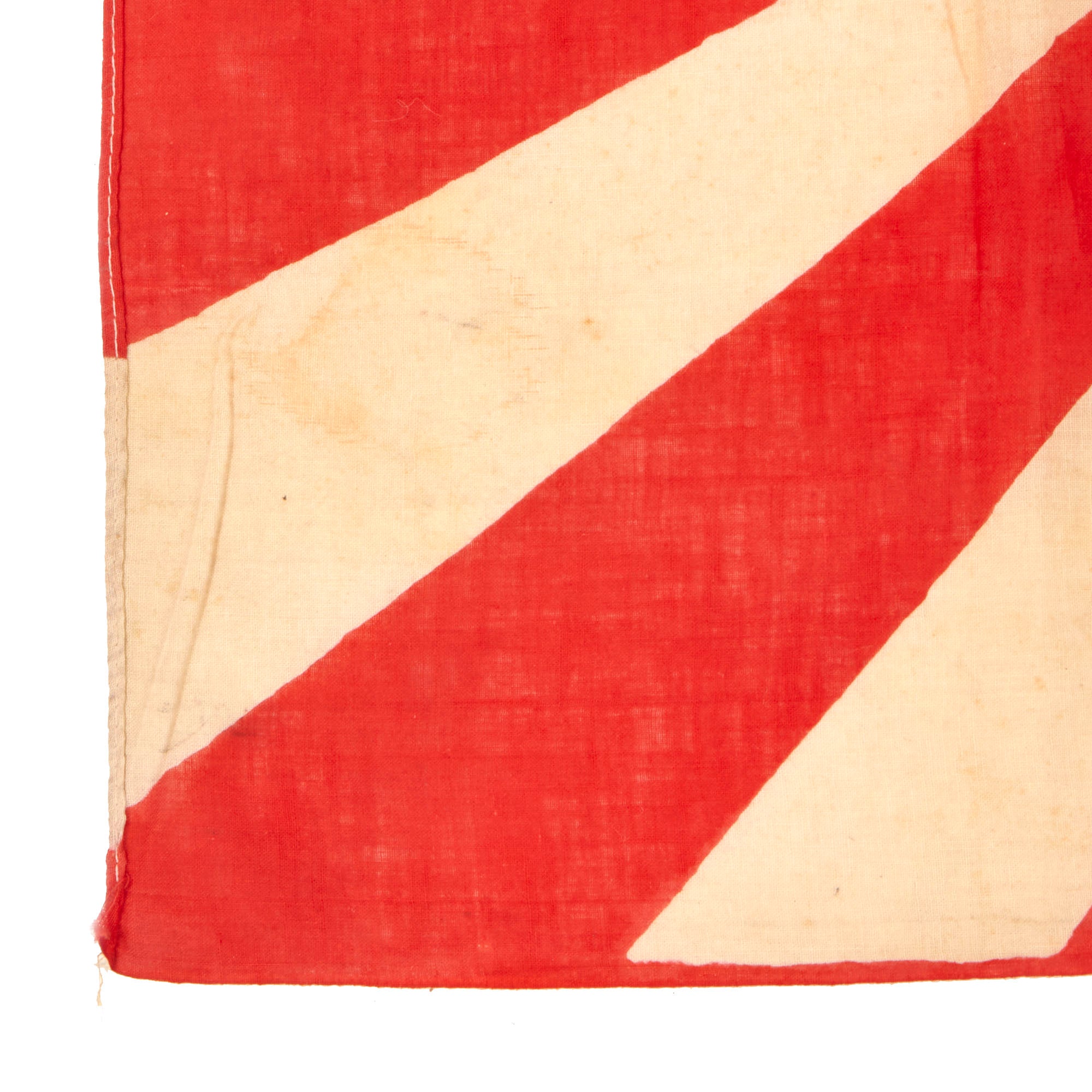 This is a very nice fragile example of a rising sun flag. It is a very nice one piece rising sun flag and is made of very fine silk. It is in very fair condition with some small tears across the fabric, with a dyed red "Sun" in the middle, with rays going out to the edge of the flag. It retains both of its original corner reinforcements, but they are very weak and are close to coming off. The flag measures roughly 26 x 32”.