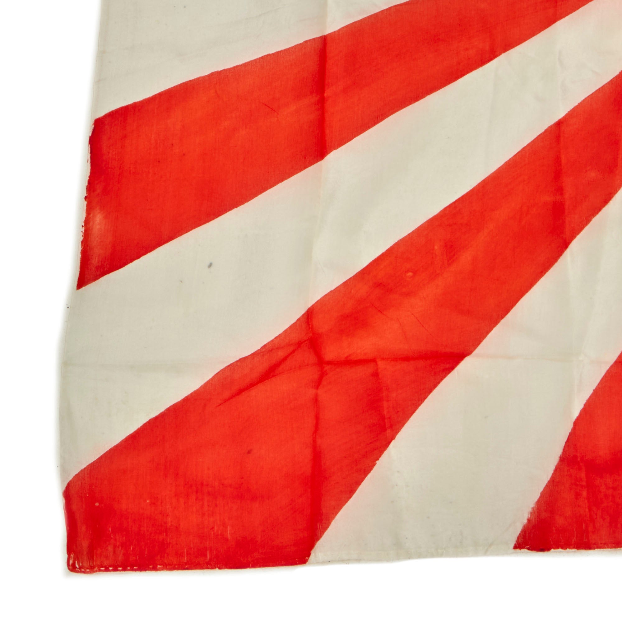 This is a very nice fragile example of a rising sun flag. It is a very nice one piece rising sun flag and is made of very fine silk. It is in very fair condition with some small tears across the fabric, with a dyed red "Sun" in the middle, with rays going out to the edge of the flag. It is missing both of its original corner reinforcements. The flag measures roughly 28 x 36”.