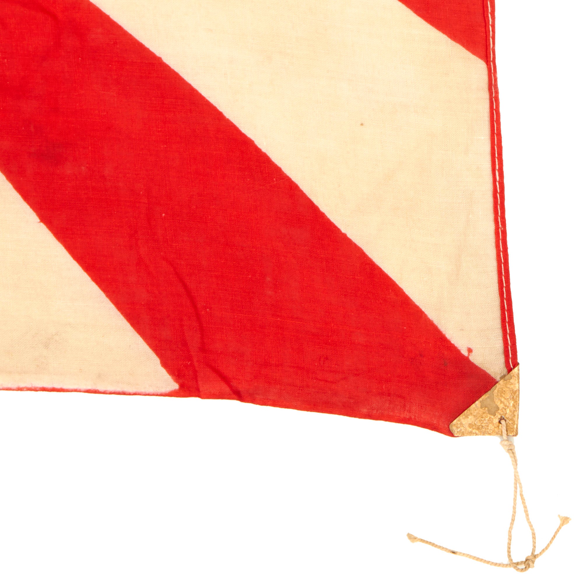 This is a lovely "salty" looking service worn example, which shows signs of real period wear from being flown in the elements. It is a very nice one piece rising sun flag and is made of what feels like muslin or possibly linen, which has held up well during service. It has a dyed red "Sun" in the middle, with rays going out to the edge of the flag. It measures a nice displayable 32”x27”.