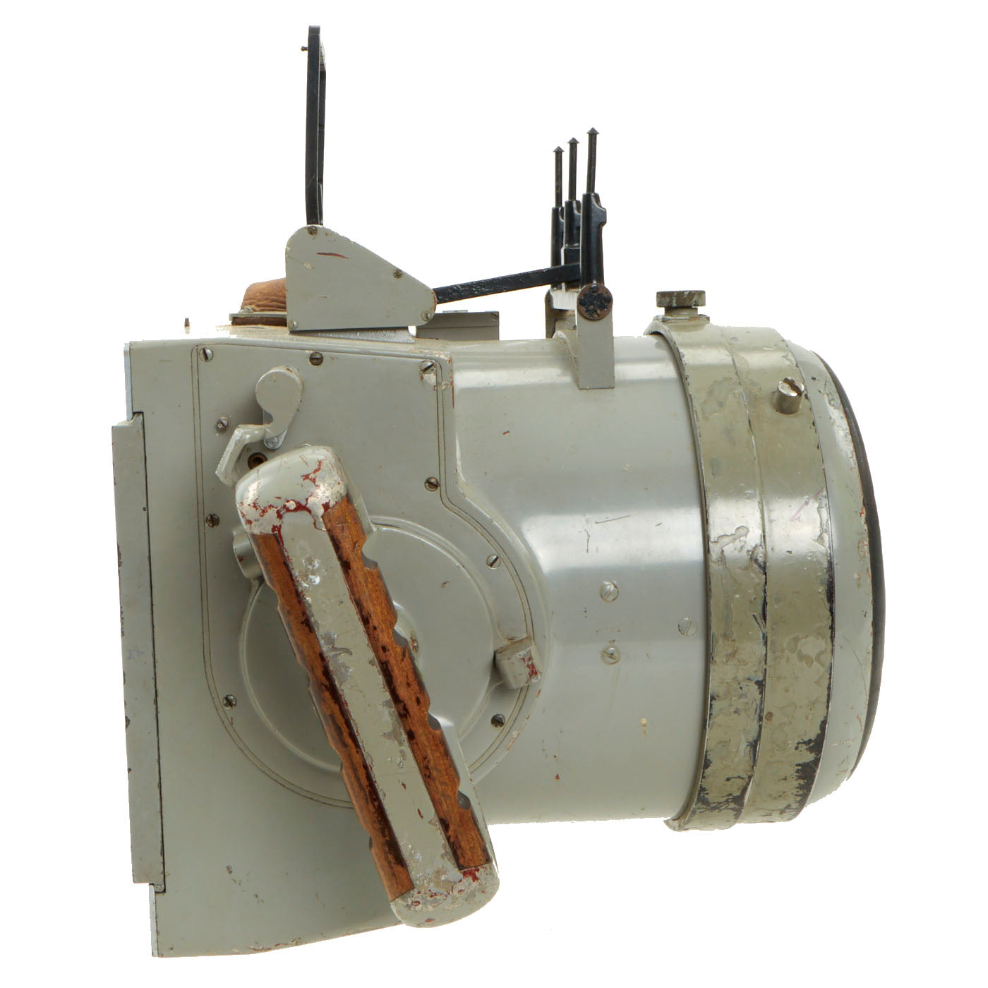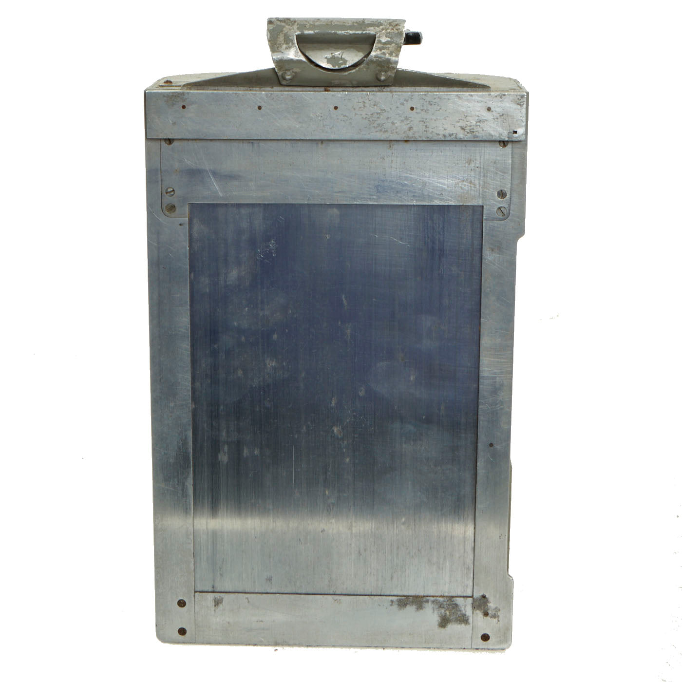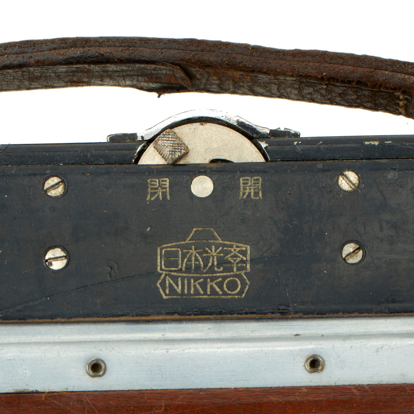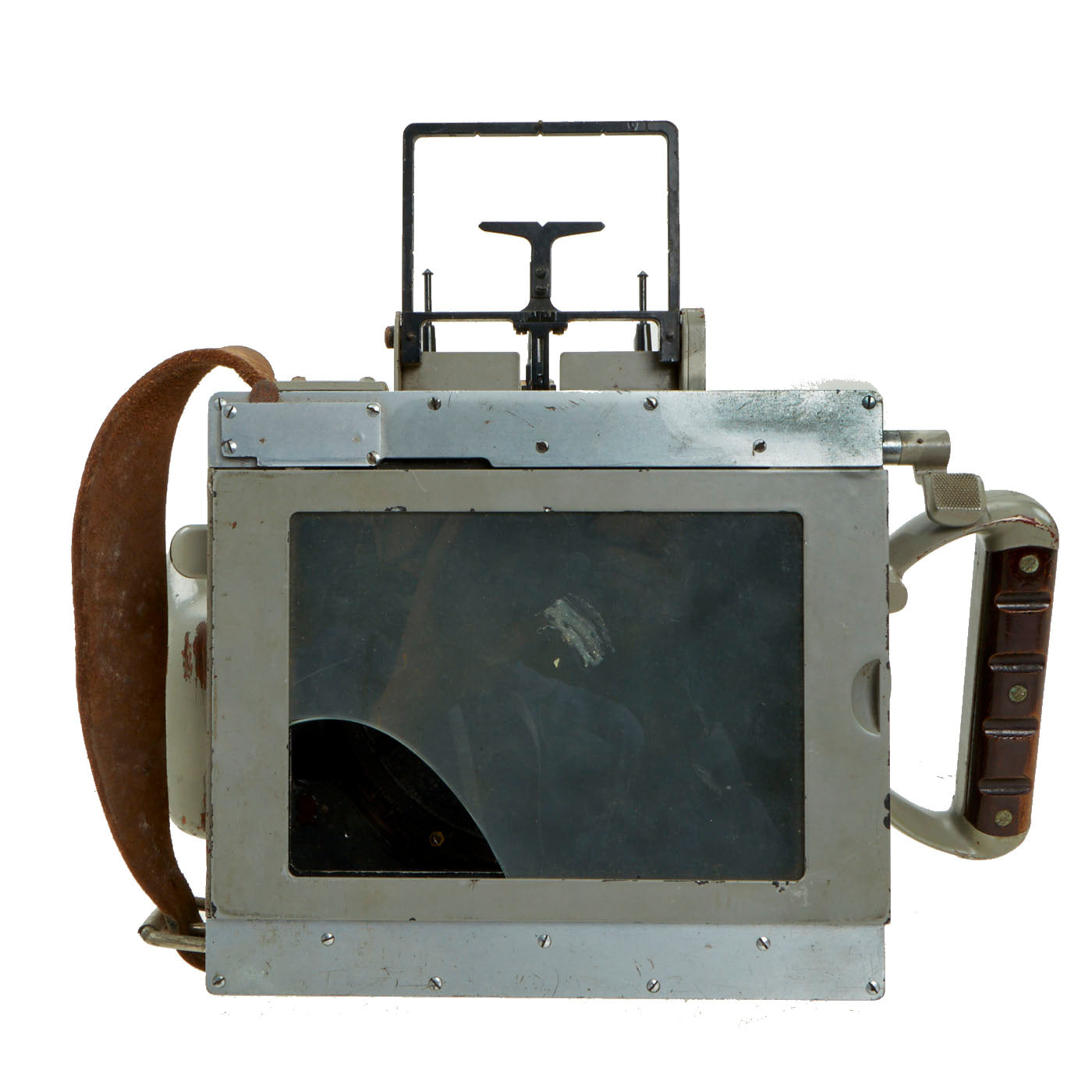 This Type 96 had a short service life and suffered from a variety of reliability issues but was still one of the most sophisticated cameras made for the Japanese Army. It was fitted with heater elements in both the camera body and the lenses. It was equipped with two light projectors to use in recording the tilt of the camera while positioned over the film. It used 18cm Roll Film and was mainly used by the Army Ministry for Cartography. The camera could be mounted in an aircraft as well as operated in “handheld” mode. It was manufactured by Rokuoh-sha and has a Nippon-Kogaku lens (189137). The camera comes in the original wooden box which still has USGI bring-back information written on it, roll fill, glass negatives that contain images and the electric heater camera.