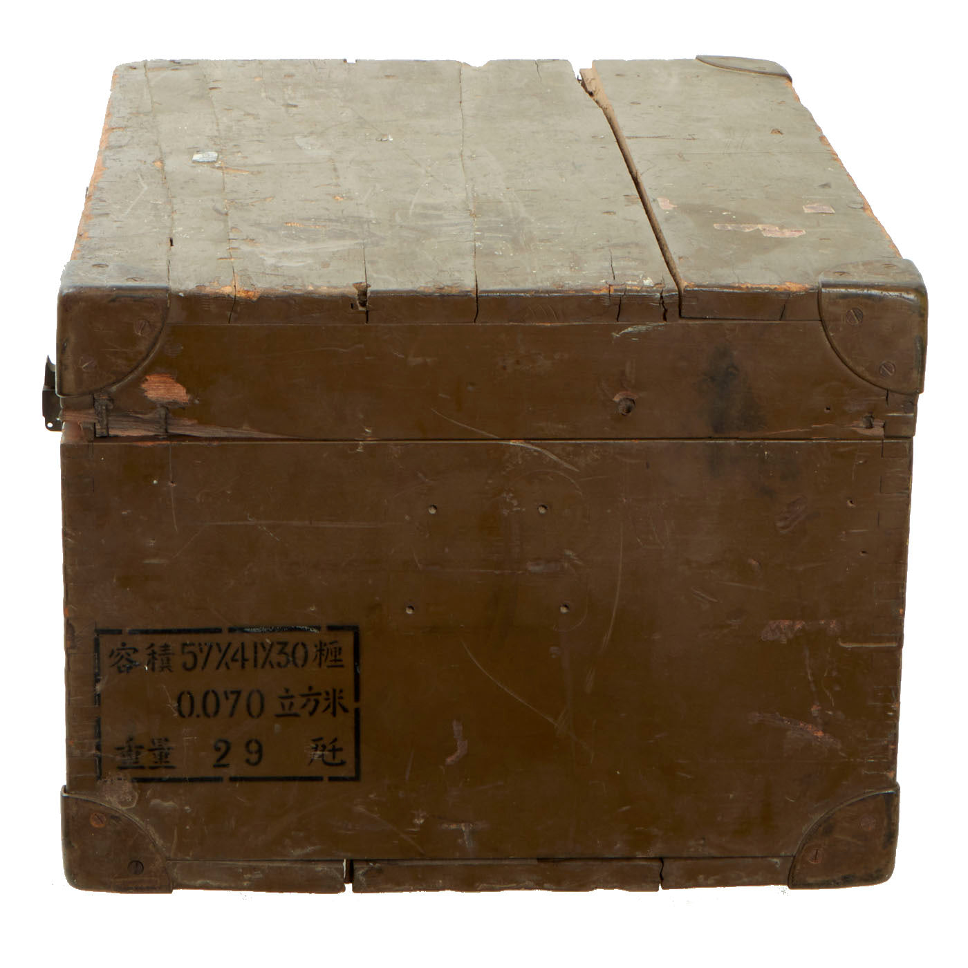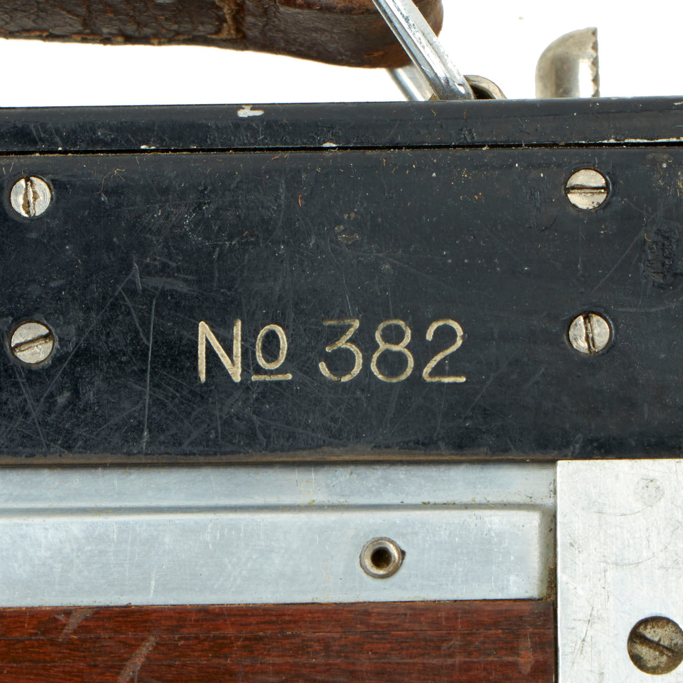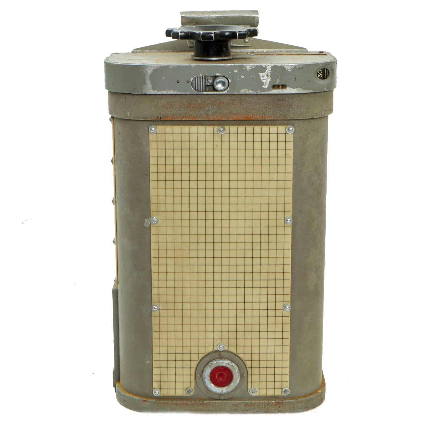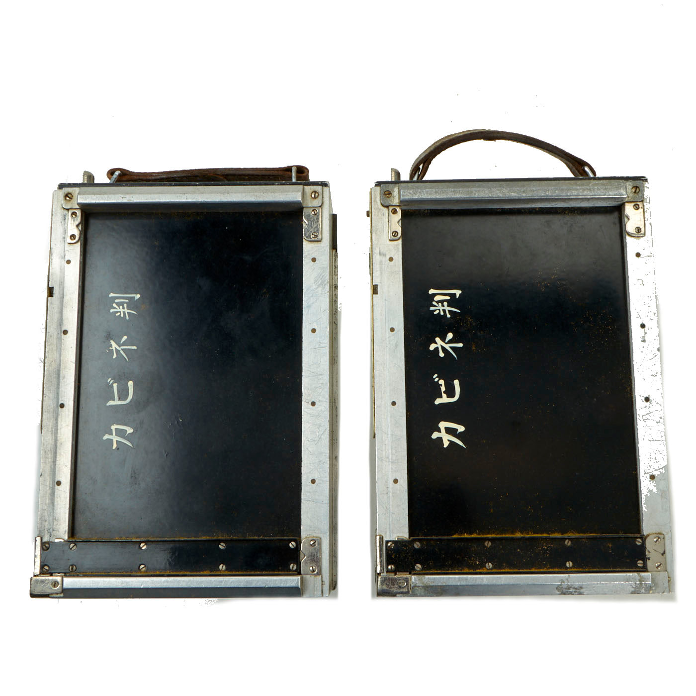 This Type 96 had a short service life and suffered from a variety of reliability issues but was still one of the most sophisticated cameras made for the Japanese Army. It was fitted with heater elements in both the camera body and the lenses. It was equipped with two light projectors to use in recording the tilt of the camera while positioned over the film. It used 18cm Roll Film and was mainly used by the Army Ministry for Cartography. The camera could be mounted in an aircraft as well as operated in “handheld” mode. It was manufactured by Rokuoh-sha and has a Nippon-Kogaku lens (189137). The camera comes in the original wooden box which still has USGI bring-back information written on it, roll fill, glass negatives that contain images and the electric heater camera.