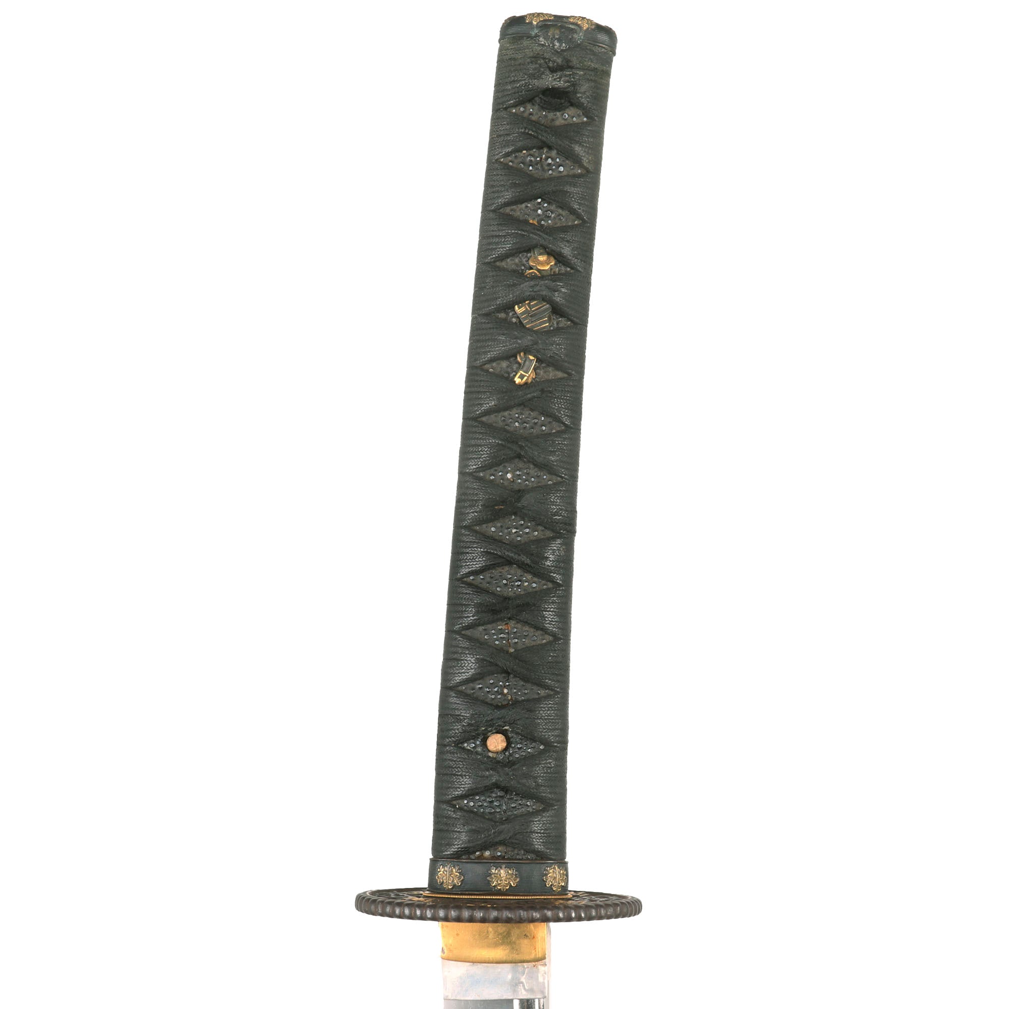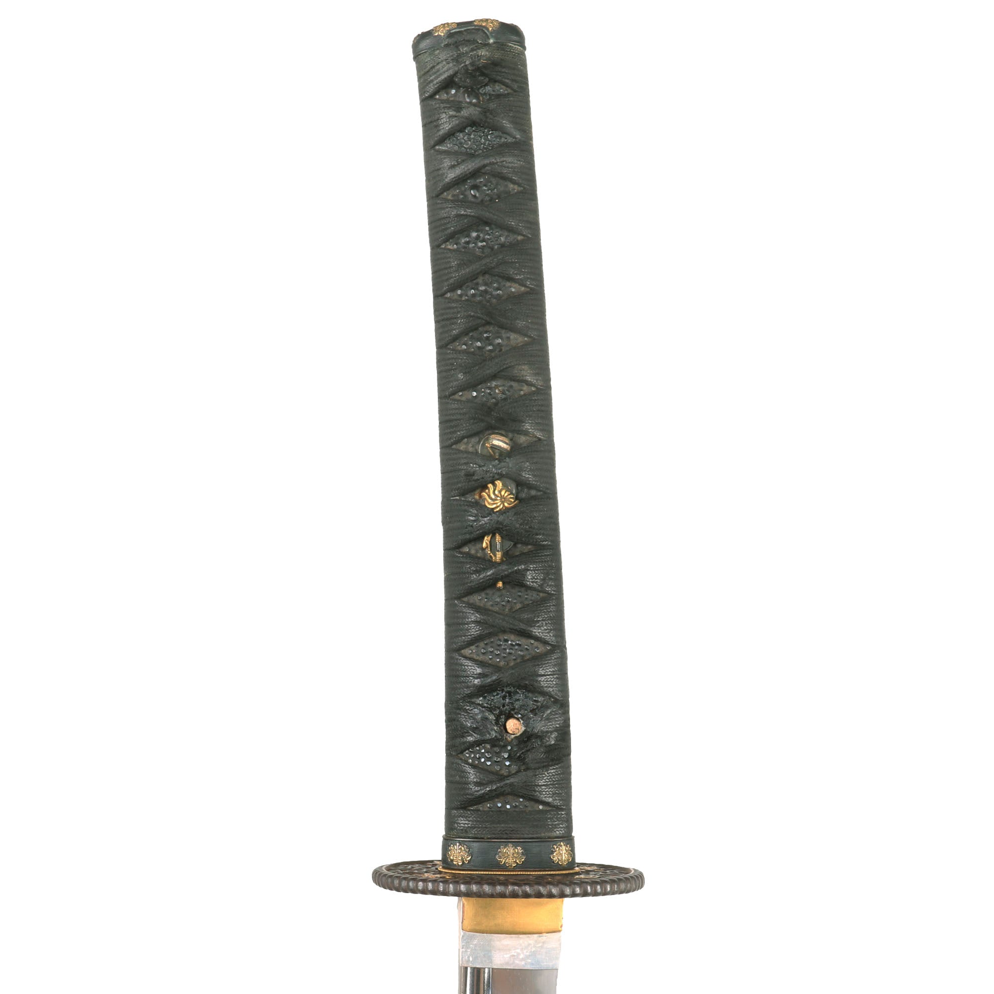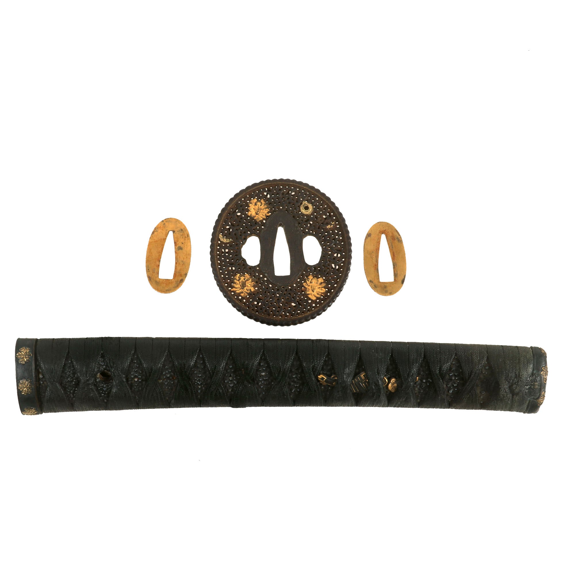 There are two gold highlighted non-magnetic MENUKI grip ornaments, one of which shows a tachi with armor pieces, and the other looks to show a spear with a helmet, so this is a set intended to show the equipment of a samurai of high standing. The stingray (Sa-Me) grip is in very good condition, and definitely looks to be real ray skin, which was coated with black urushi lacquer and sanded down a bit, giving it a great look. The black grip wrapping (ITO) shows wear and staining, and is definitely of great age. There is some fraying as well as a tear around the MEKUGI-ANA peg hole, and the wrapping looks to have been coated to protect it and hold it in place. The single wooden MEKUGI peg looks to be later edo period.