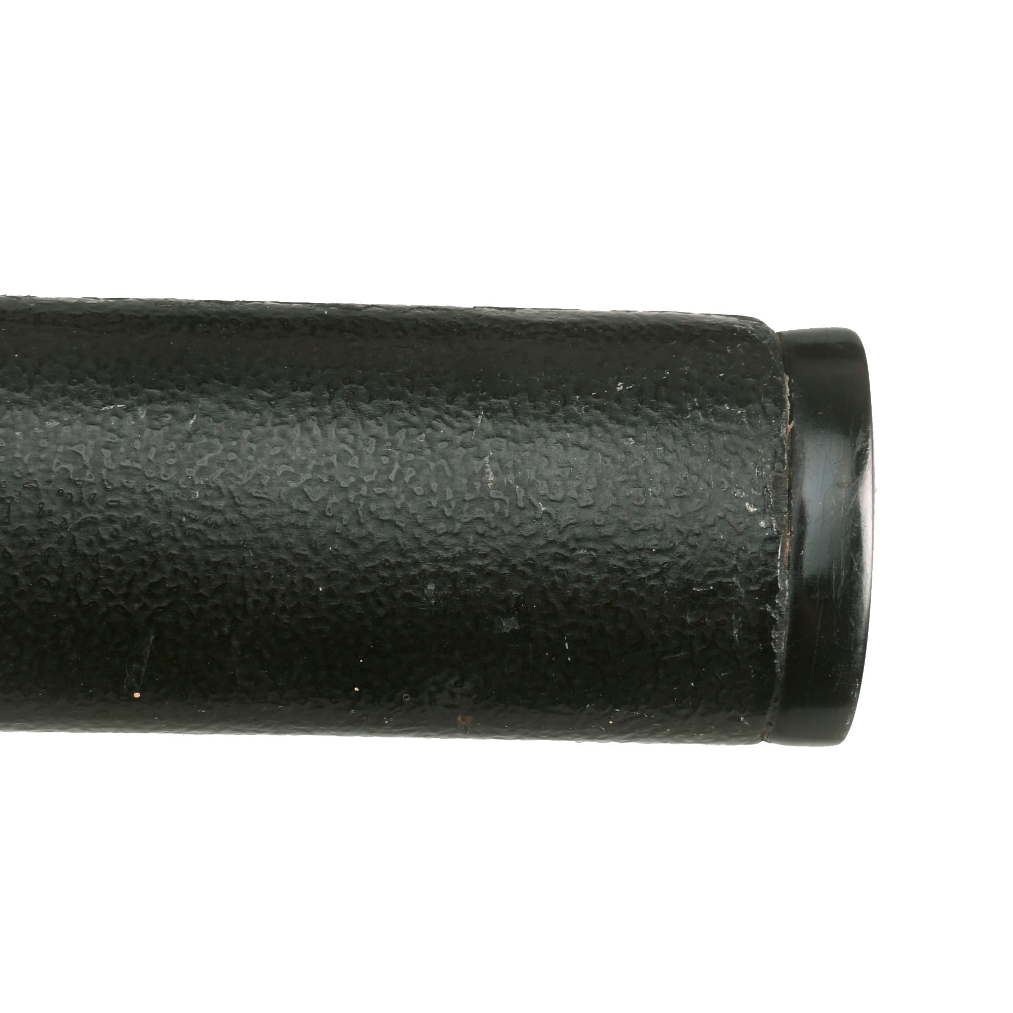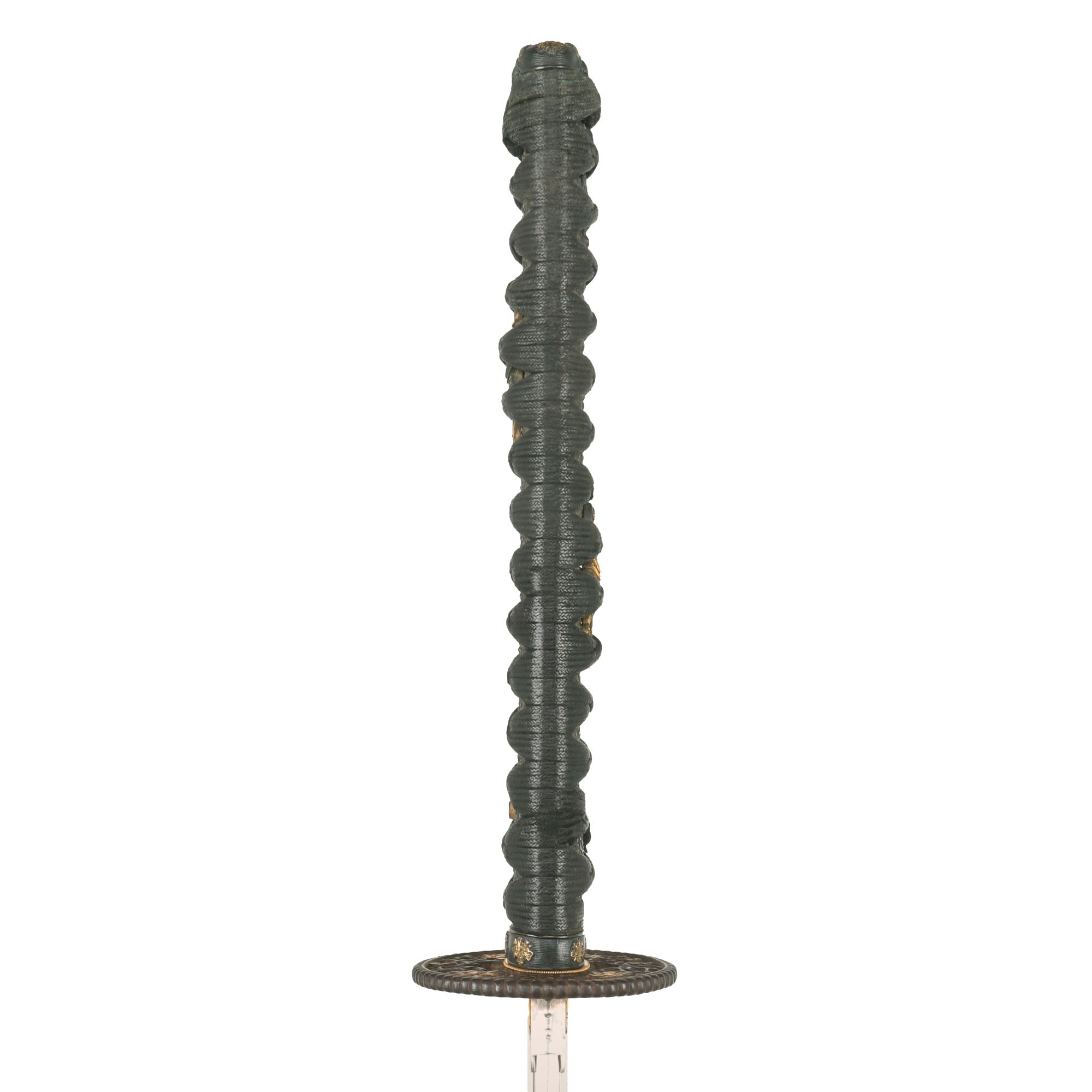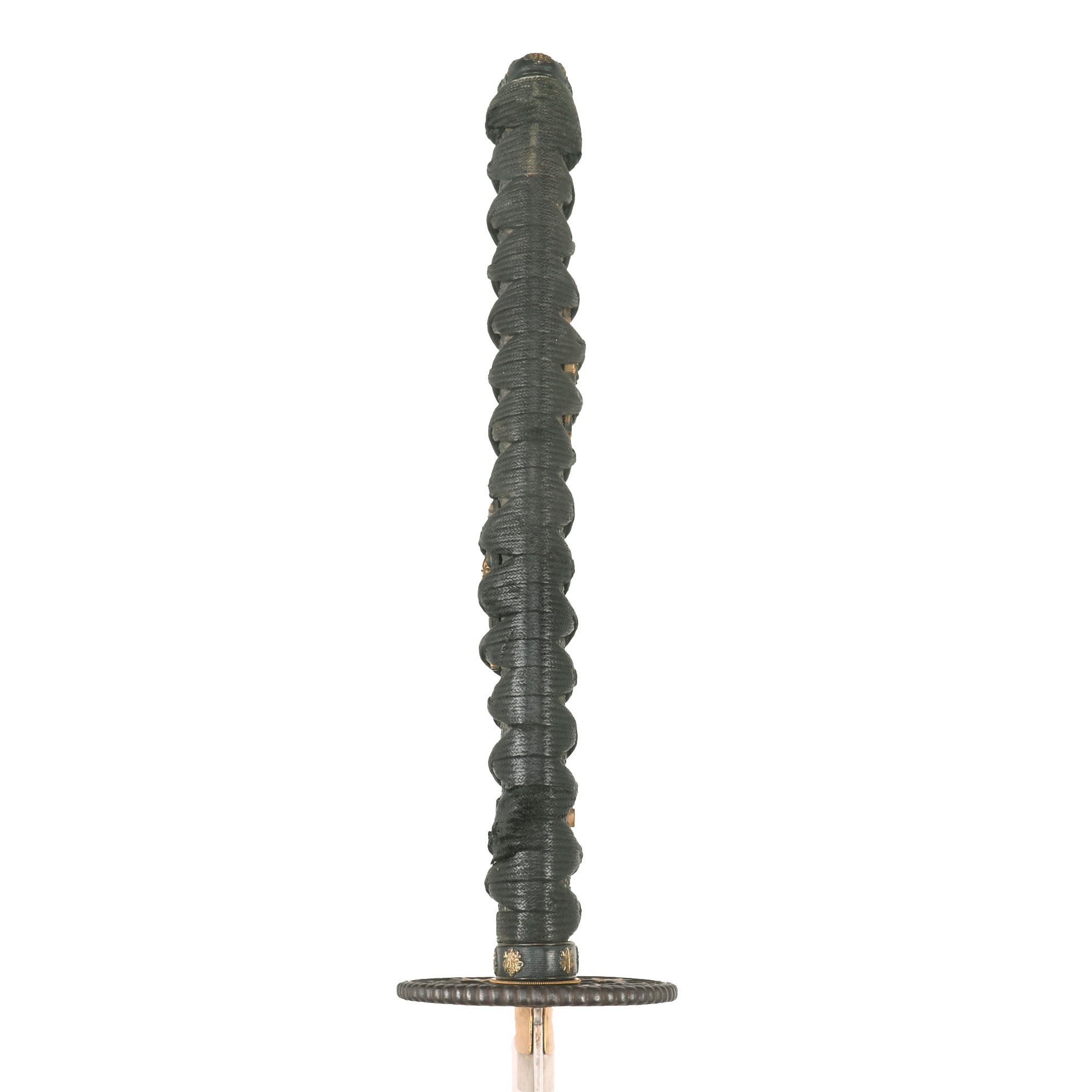There are two gold highlighted non-magnetic MENUKI grip ornaments, one of which shows a tachi with armor pieces, and the other looks to show a spear with a helmet, so this is a set intended to show the equipment of a samurai of high standing. The stingray (Sa-Me) grip is in very good condition, and definitely looks to be real ray skin, which was coated with black urushi lacquer and sanded down a bit, giving it a great look. The black grip wrapping (ITO) shows wear and staining, and is definitely of great age. There is some fraying as well as a tear around the MEKUGI-ANA peg hole, and the wrapping looks to have been coated to protect it and hold it in place. The single wooden MEKUGI peg looks to be later edo period.