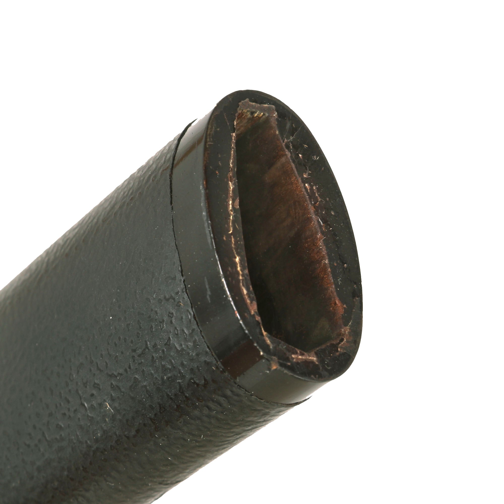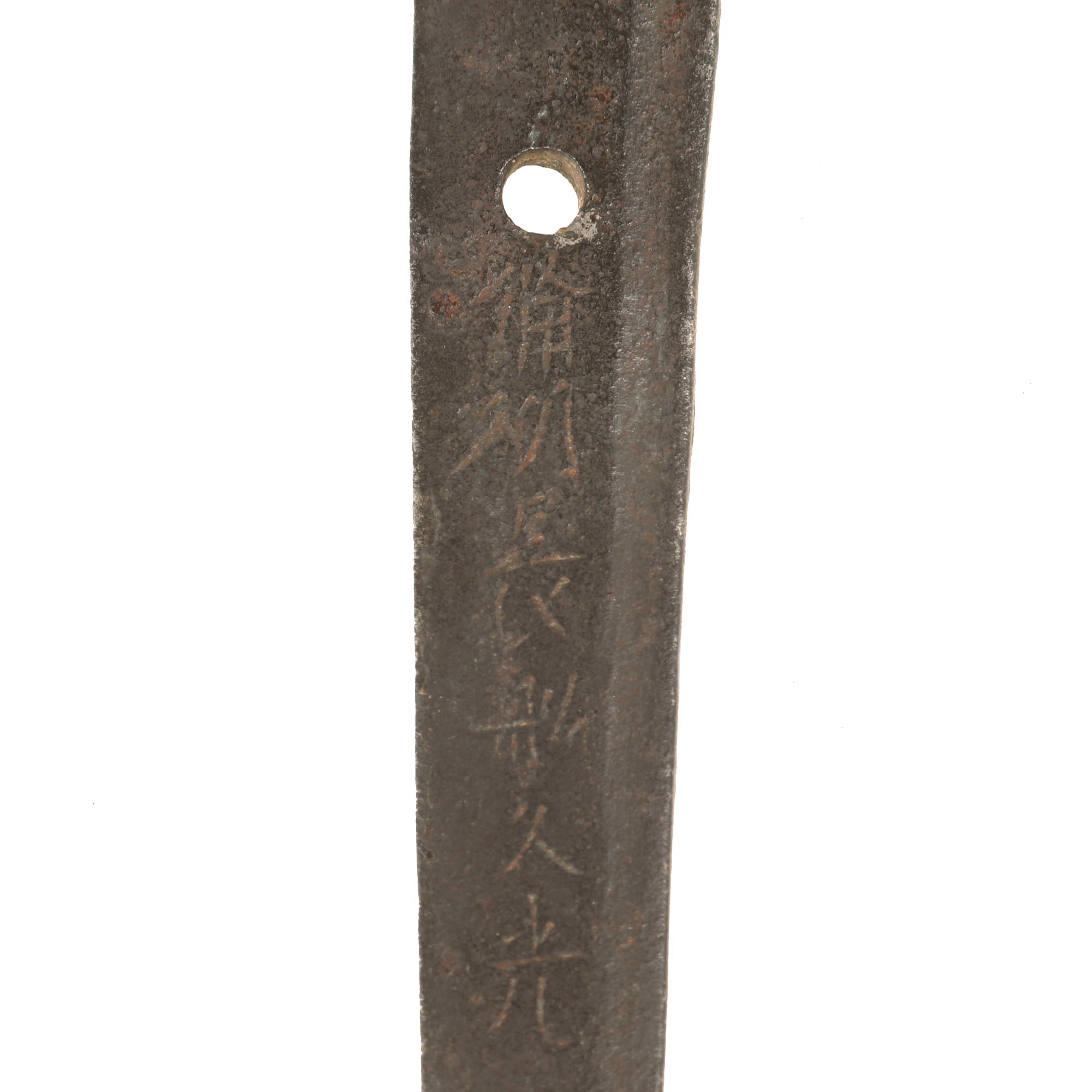 This example has been remounted several times, as was common for Japanese blades. This combined with age and oxidation has made the YASURIME (鑢目 - file marks) on the tang faint, and given it a lovely patina from oxidation and rust scaling. The blade is signed, however the TAGANE (chisel marks) are very faint and the TAGANE MAKURA (raised area around the mei) are completely removed.