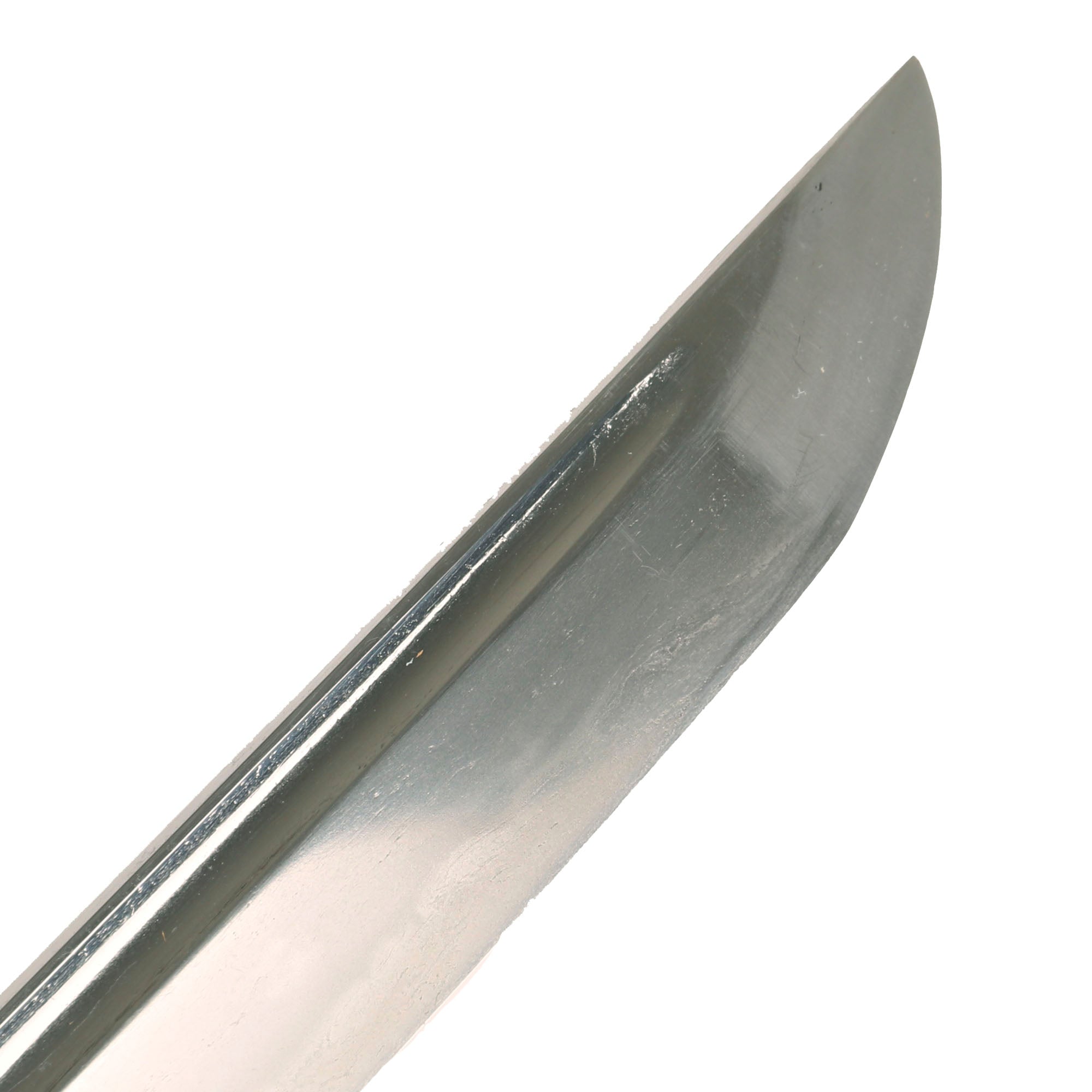 The this example has an overall length of 38 inches, and the blade is 27 ¾ inches long. The polish is in excellent condition, showing no oxidation or staining that we can see. The aspects of the blade are still easily visible in the light, and the blade crystallization has some lovely chatoyancy. The edge is still quite sharp, so it should be handled with care. We checked the edge and there are no dents or other issues we can see. This blade looks to have a FURISODE shaped NAKAGO (tang) with a HAAGARI (asymmetrically rounded) nakago-jiri (Tang tip). This shape has less of a taper and is a bit angled backwards compared to the regular (futsu) type.