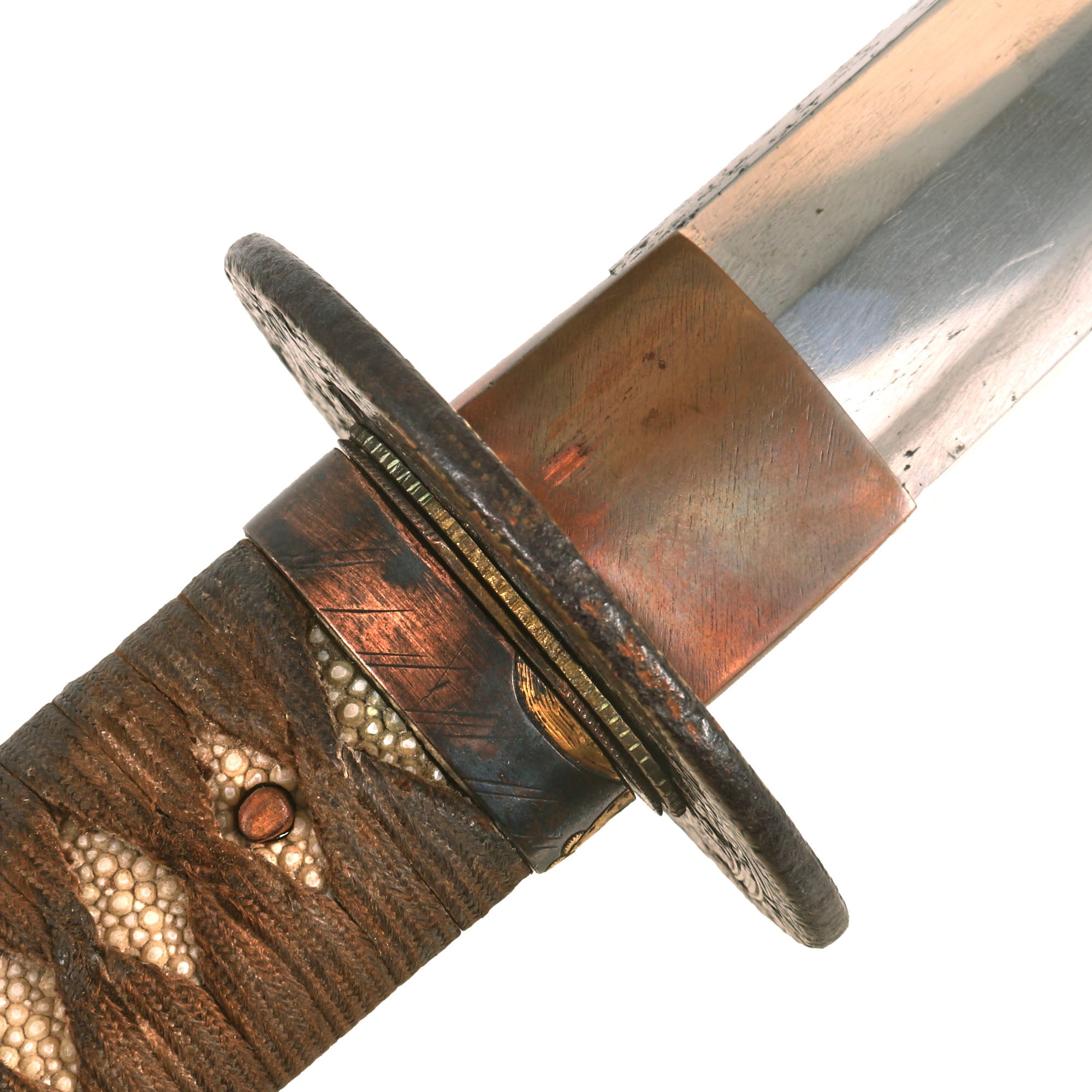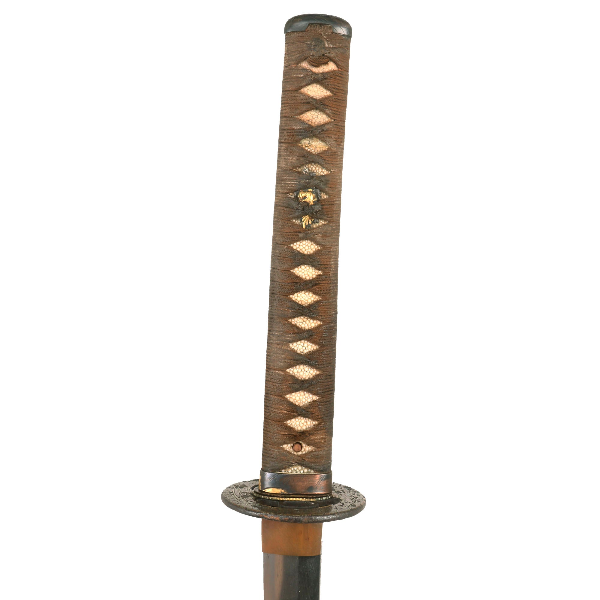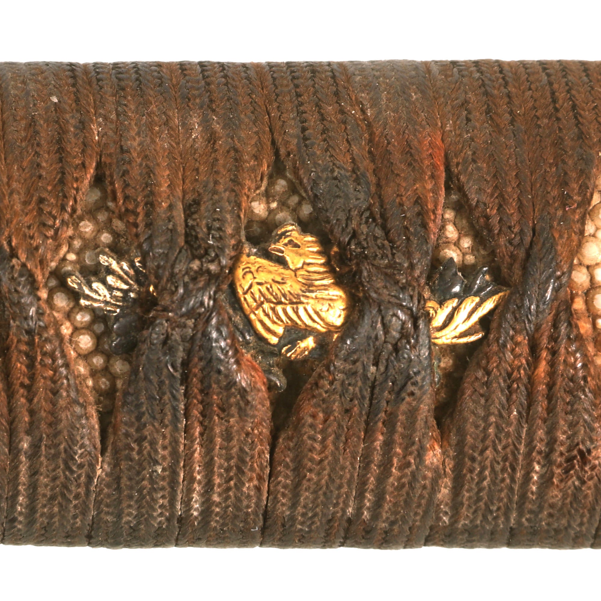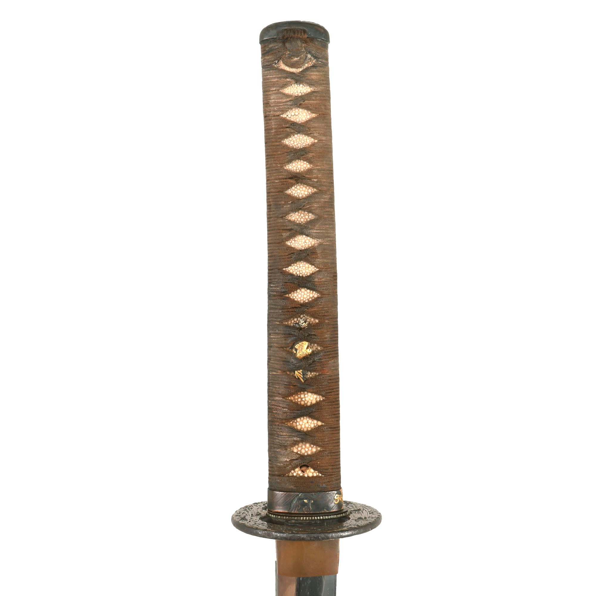 The FUCHI (collar) for the TSUKA (handle) is a fantastic blacked embossed copper exampe, which shows what look to be horses, with some lovely gilt highlights that are nearly impossible to photograph. It is even signed on the top with 政随行齢六十又六, which translates to SHŌZUI GYŌNEN 66. This refers to the maker of the fuchi, Shōzui (Masayuki), who made it when he was 66 years old. The KASHIRA (butt cap) is made from blacked embossed copper as well, and has a matching horse design, so this was made as a set, still together after all this time. There are two gold highlighted non-magnetic MENUKI grip ornaments, which show what look to be chickens or some others birds. The stingray (Sa-Me) grip is in very good condition, and definitely looks to be real ray skin, and not synthetic. The brown grip wrapping (ITO) shows some wear and staining, but no major damage, and looks to definitely be from the Edo period. The single wooden MEKUGI peg looks to be later edo period.