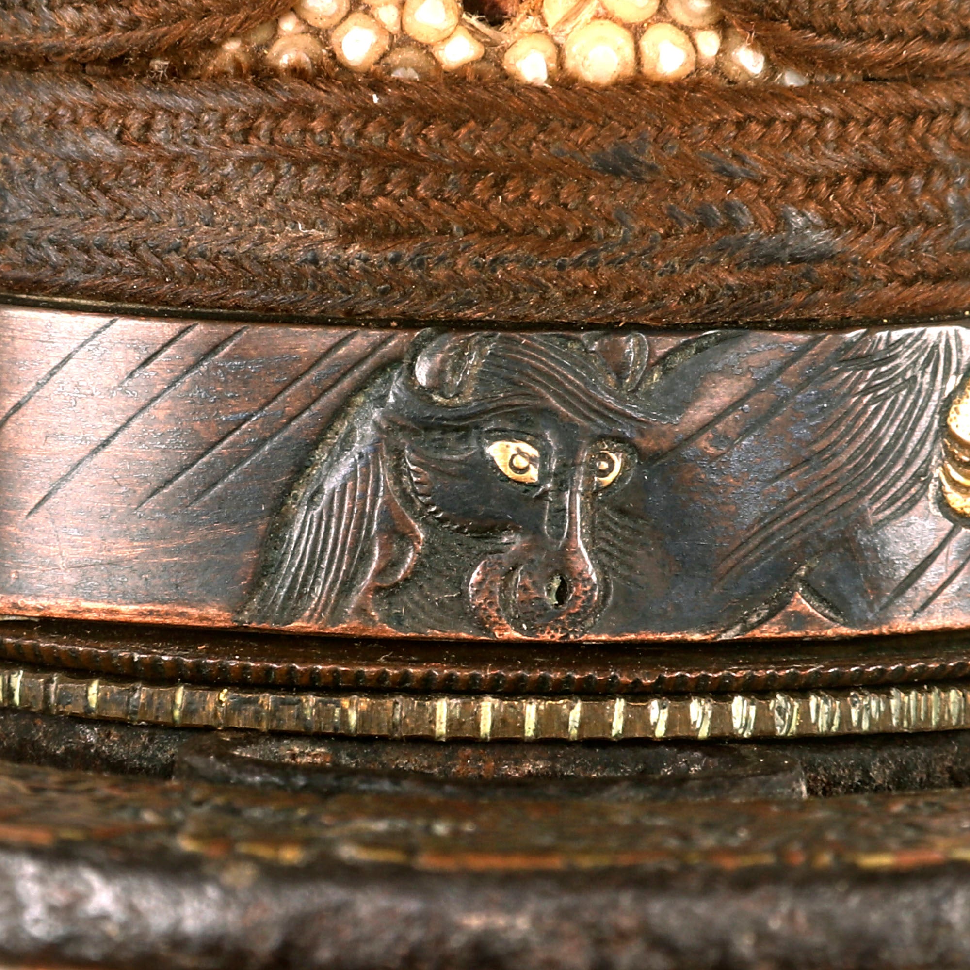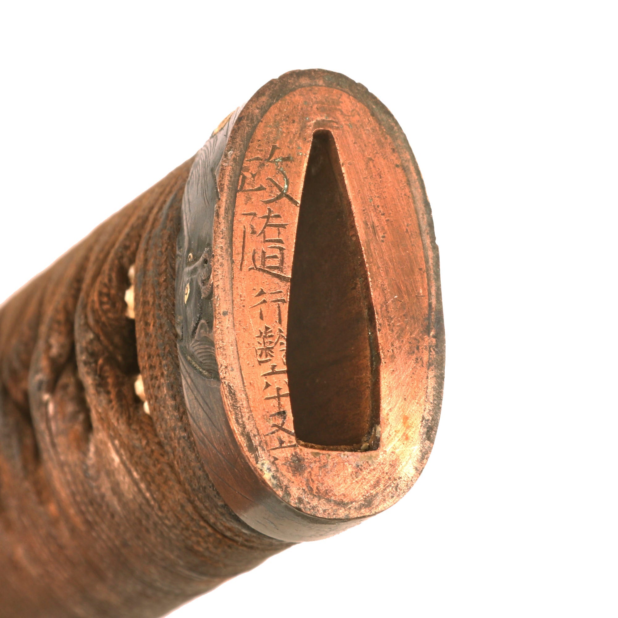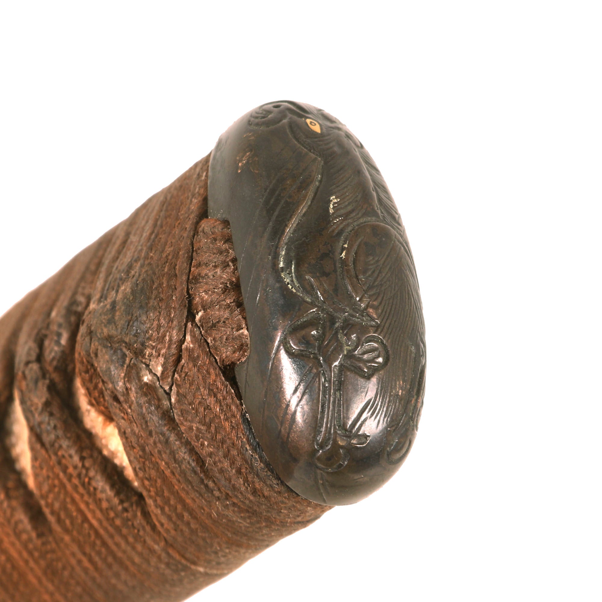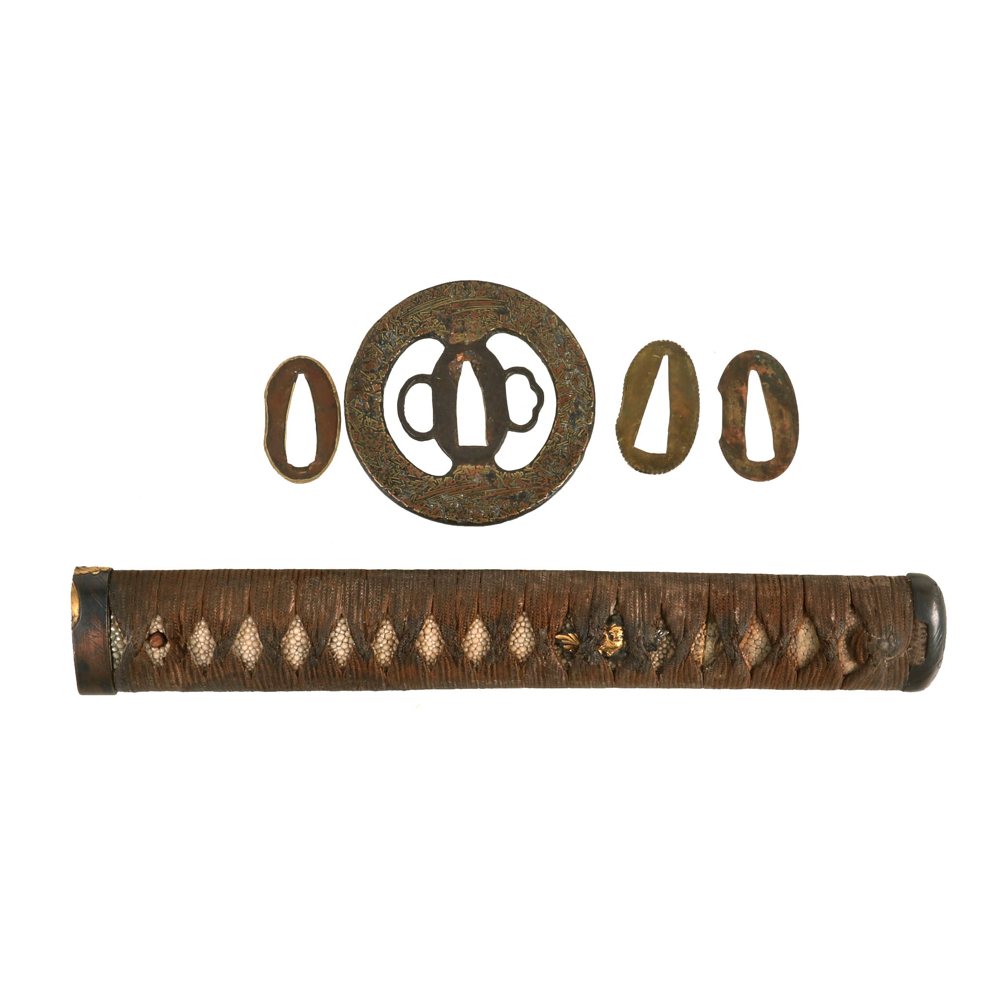 The FUCHI (collar) for the TSUKA (handle) is a fantastic blacked embossed copper exampe, which shows what look to be horses, with some lovely gilt highlights that are nearly impossible to photograph. It is even signed on the top with 政随行齢六十又六, which translates to SHŌZUI GYŌNEN 66. This refers to the maker of the fuchi, Shōzui (Masayuki), who made it when he was 66 years old. The KASHIRA (butt cap) is made from blacked embossed copper as well, and has a matching horse design, so this was made as a set, still together after all this time. There are two gold highlighted non-magnetic MENUKI grip ornaments, which show what look to be chickens or some others birds. The stingray (Sa-Me) grip is in very good condition, and definitely looks to be real ray skin, and not synthetic. The brown grip wrapping (ITO) shows some wear and staining, but no major damage, and looks to definitely be from the Edo period. The single wooden MEKUGI peg looks to be later edo period.