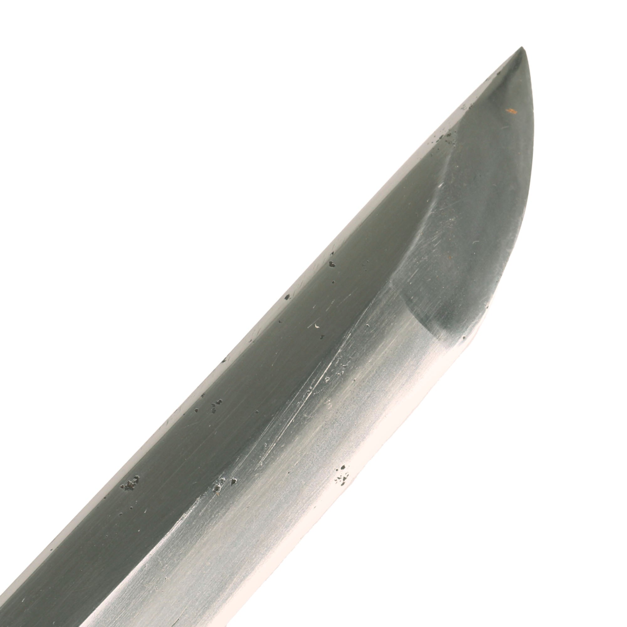 The this example has an overall length of 35 ⅜ inches, and the blade is 24 ¾ inches long. The polish is in very good condition, showing no oxidation or major staining that we can see. The edge of the blade is still relatively sharp, showing just a few small nicks and dents. It does look like the blade has probably been cleaned with UCHIKO powder since the last polishing, but it was not applied excessively. The aspects of the blade are still easily visible in the light. The tang (nakago) is of the futsu 普通 (regular) style, with a KENGYO (symmetrically pointed) nakago-jiri (tang-tip).