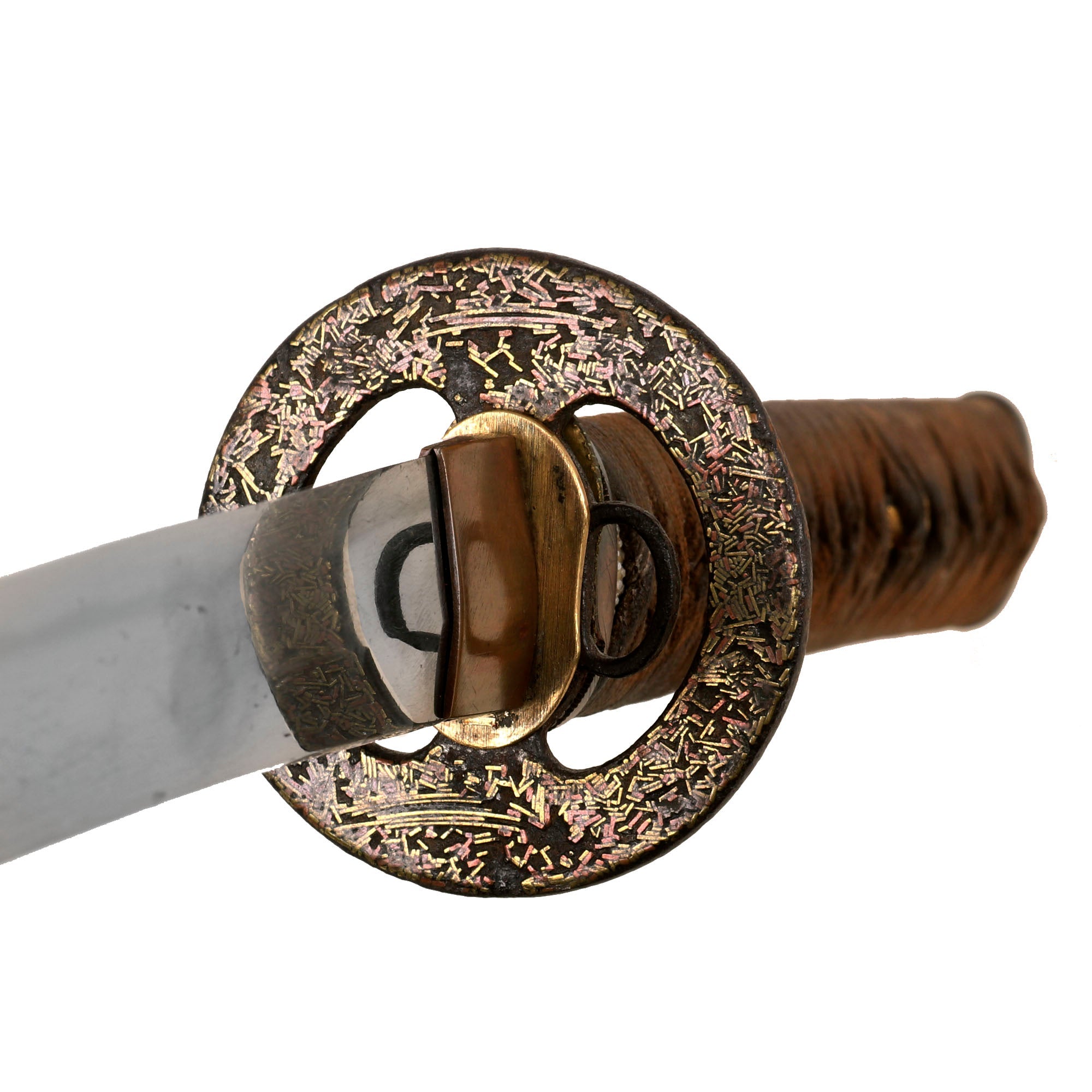 The magnificent perforated TSUBA (cross guard) is made of iron and is of the MARU GATA (round) shape, with two HITSU-ANA accessory slots, one for the kogatana handle (KOZUKA), and the other for the hair ornament (KOGAI). Both sides are COVERED with small brass and copper rod shaped inlays, giving it a fantastic textured look. Definitely a very old TSUBA with some great history to it. There are three brass SEPPA (spacers) around the cross guard to keep the fit tight, though due to the handle shrinking it is still a bit loose even when they are fitted. The HABAKI is made from copper, and is definitely EDO period style.