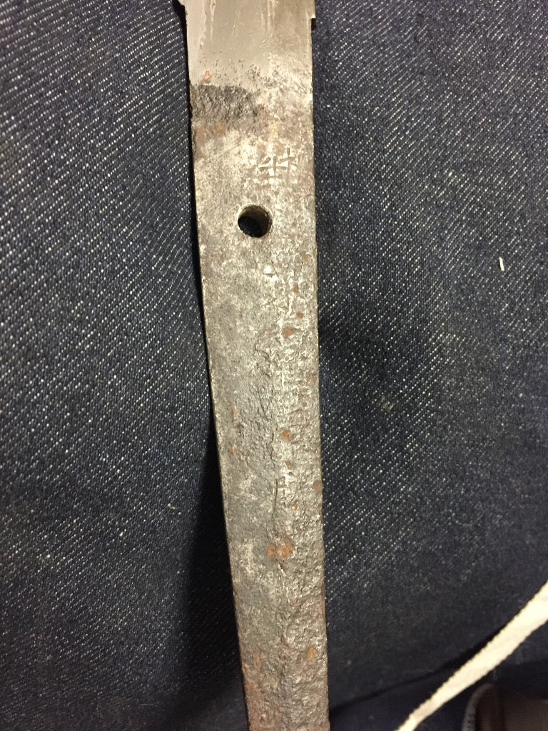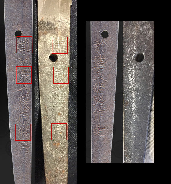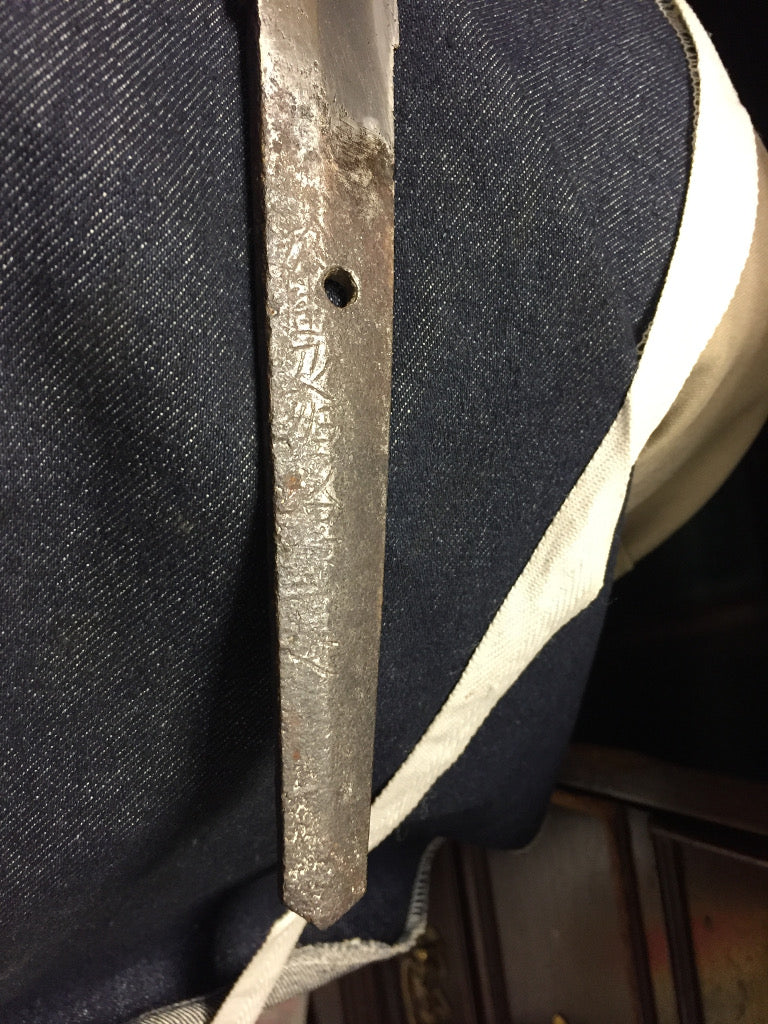 This example has been remounted several times, as was common for Japanese blades. This combined with age and oxidation has made the YASURIME (鑢目 - file marks) on the tang faint, and given it a lovely patina from oxidation and rust scaling. The blade is signed, however the TAGANE (chisel marks) are very faint and the TAGANE MAKURA (raised area around the mei) are completely removed. We were having a lot of trouble, but thankfully the experts at the Nihonto message board were able to give an attribution that we believe is accurate.