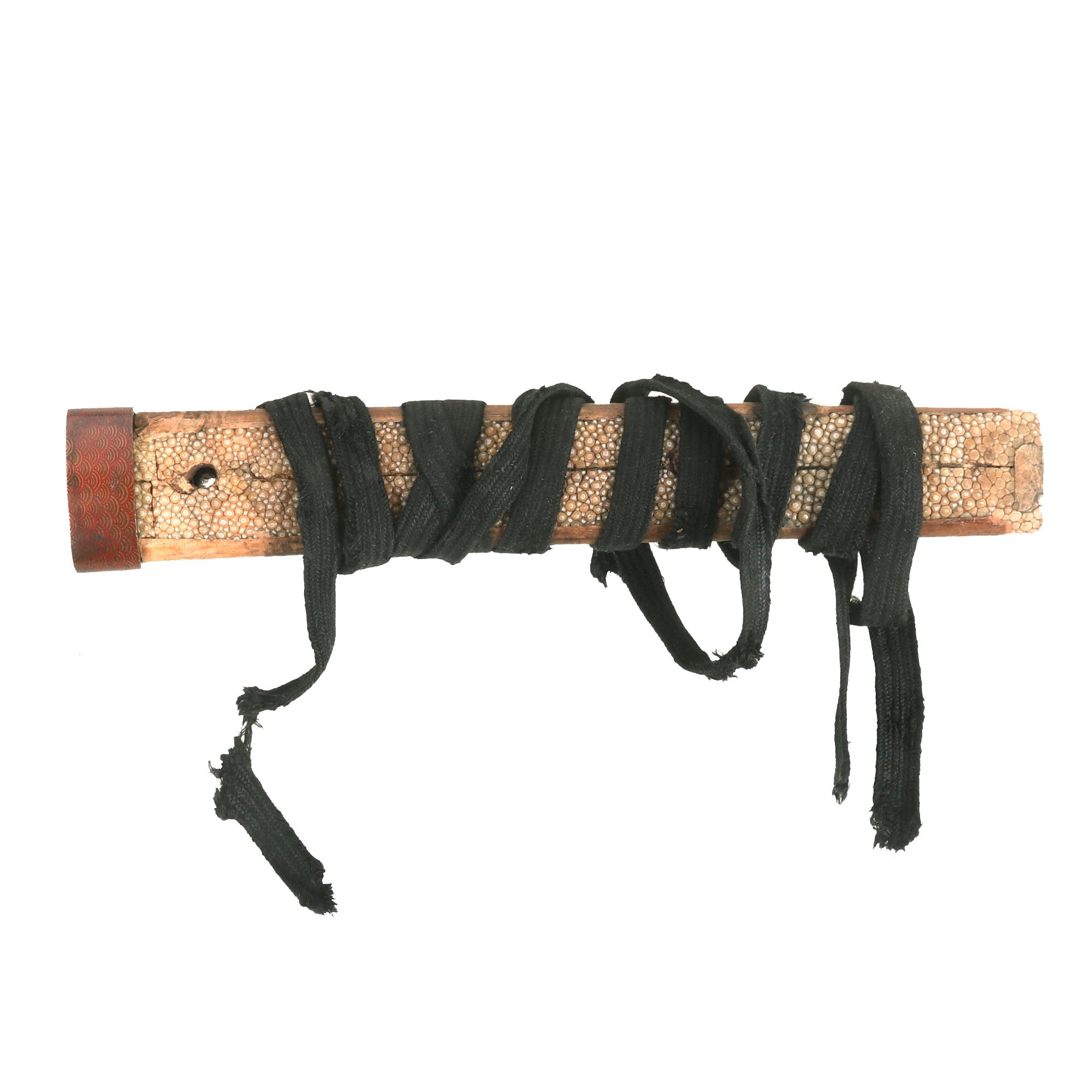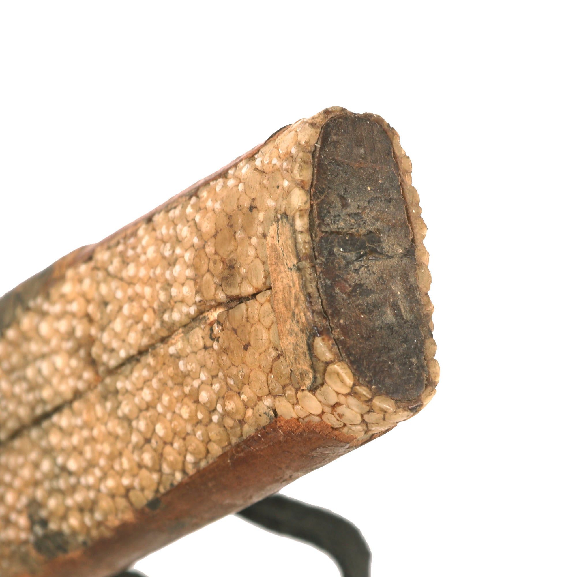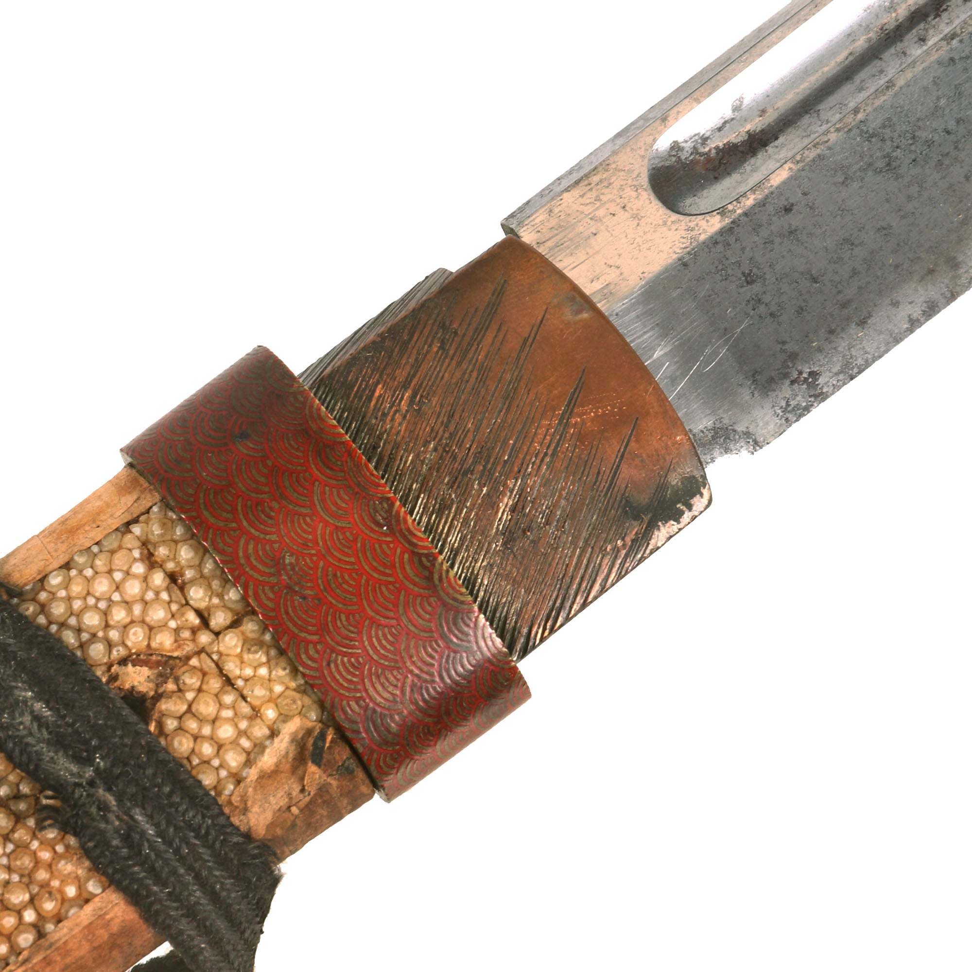The fittings on this example are unfortunately partially missing, and those still included are definitely in need or restoration. There is no TSUBA (cross guard), nor are there any SEPPA (spacers) to keep the tight fit. The TSUKA (handle) is present, with a lovely decorative patterned FUCHI (collar) at the top. It still retains the stingray skin (Sa-Me) grip panels, which definitely look to be real ray skin, and not synthetic. They are however a bit degraded, and the ITO (cloth wrapping) is torn and hanging from the handle. There is also no KASHIRA (end cap) on the handle, and the peg is missing as well. The HABAKI is made from copper with a "rain" pattern on both sides, and is definitely EDO period style.