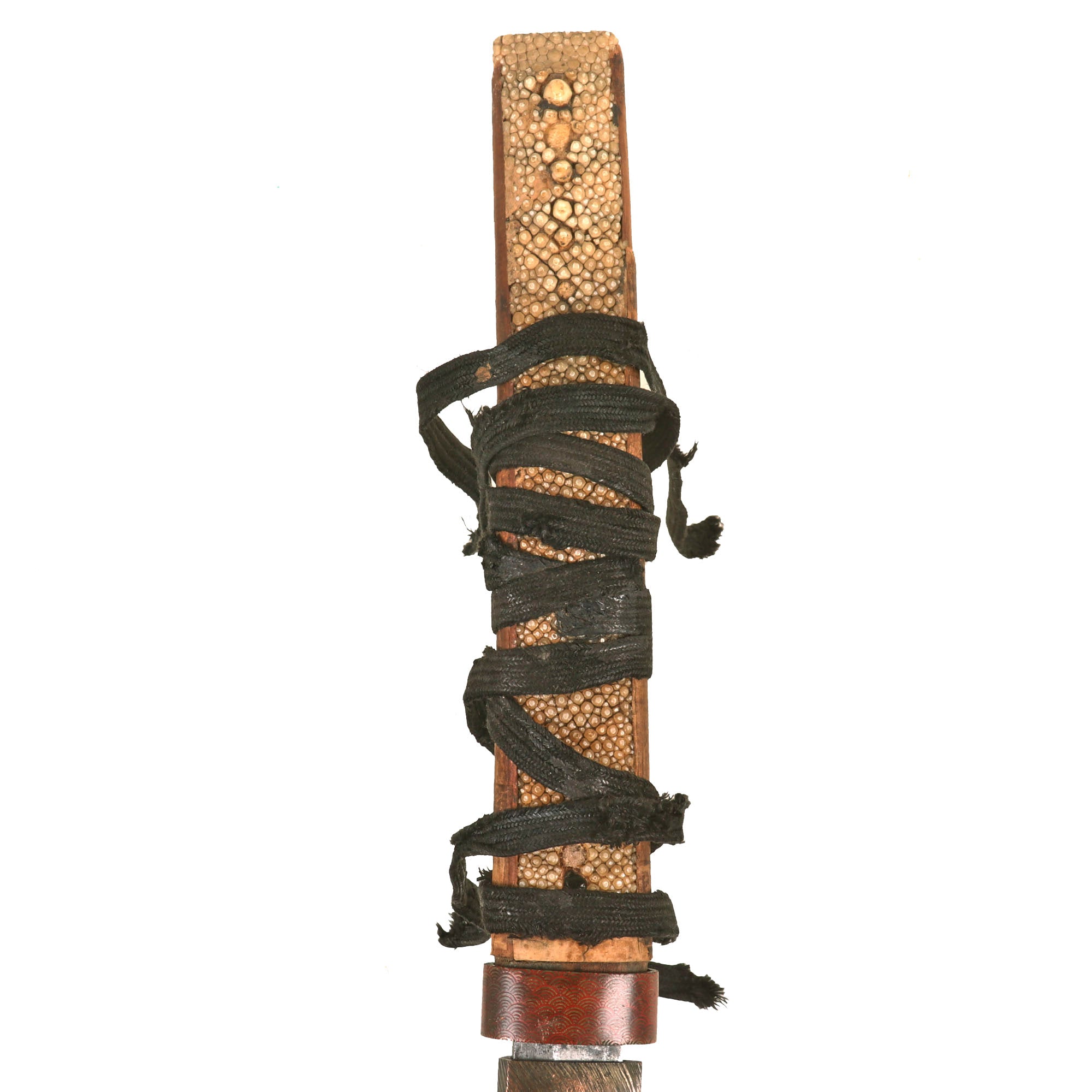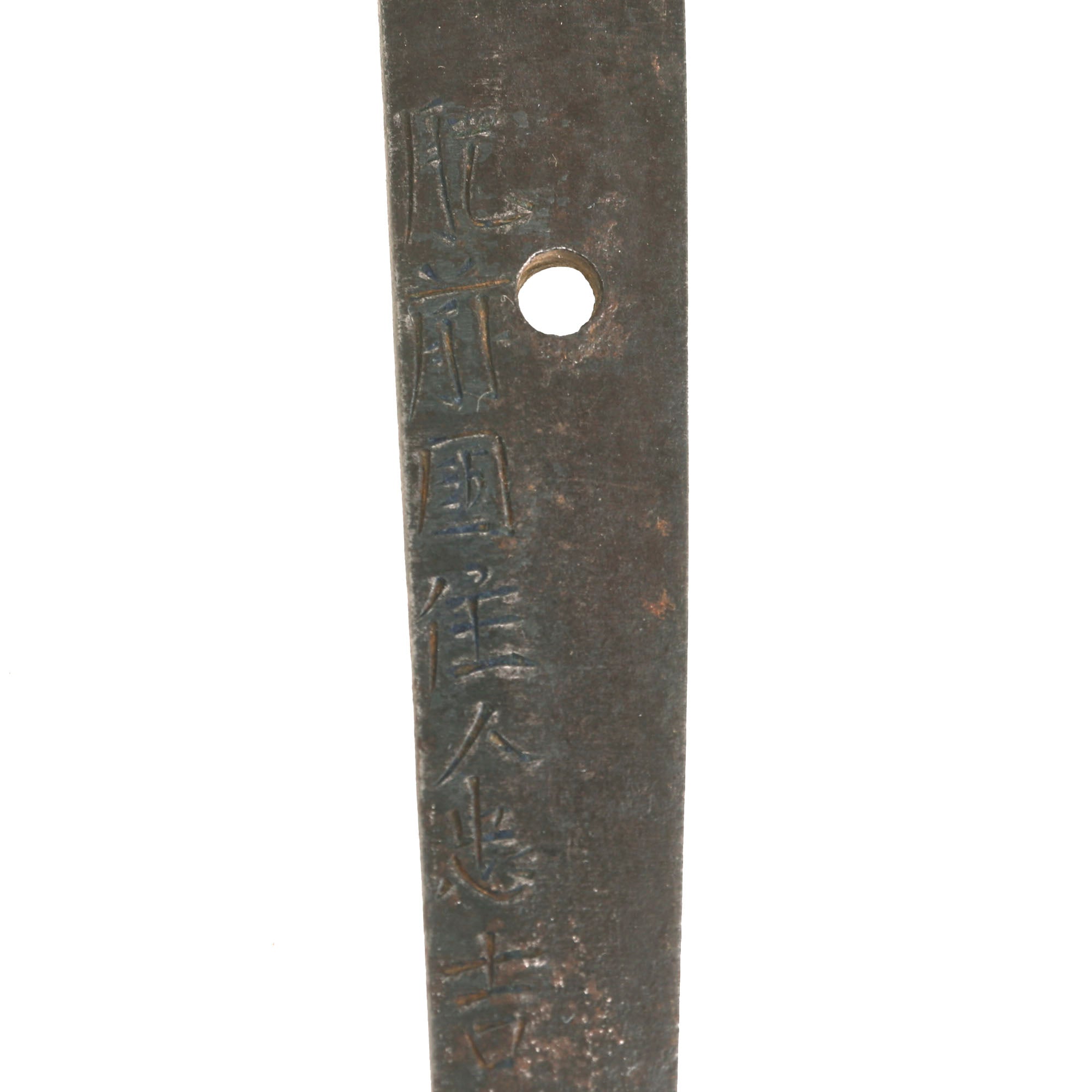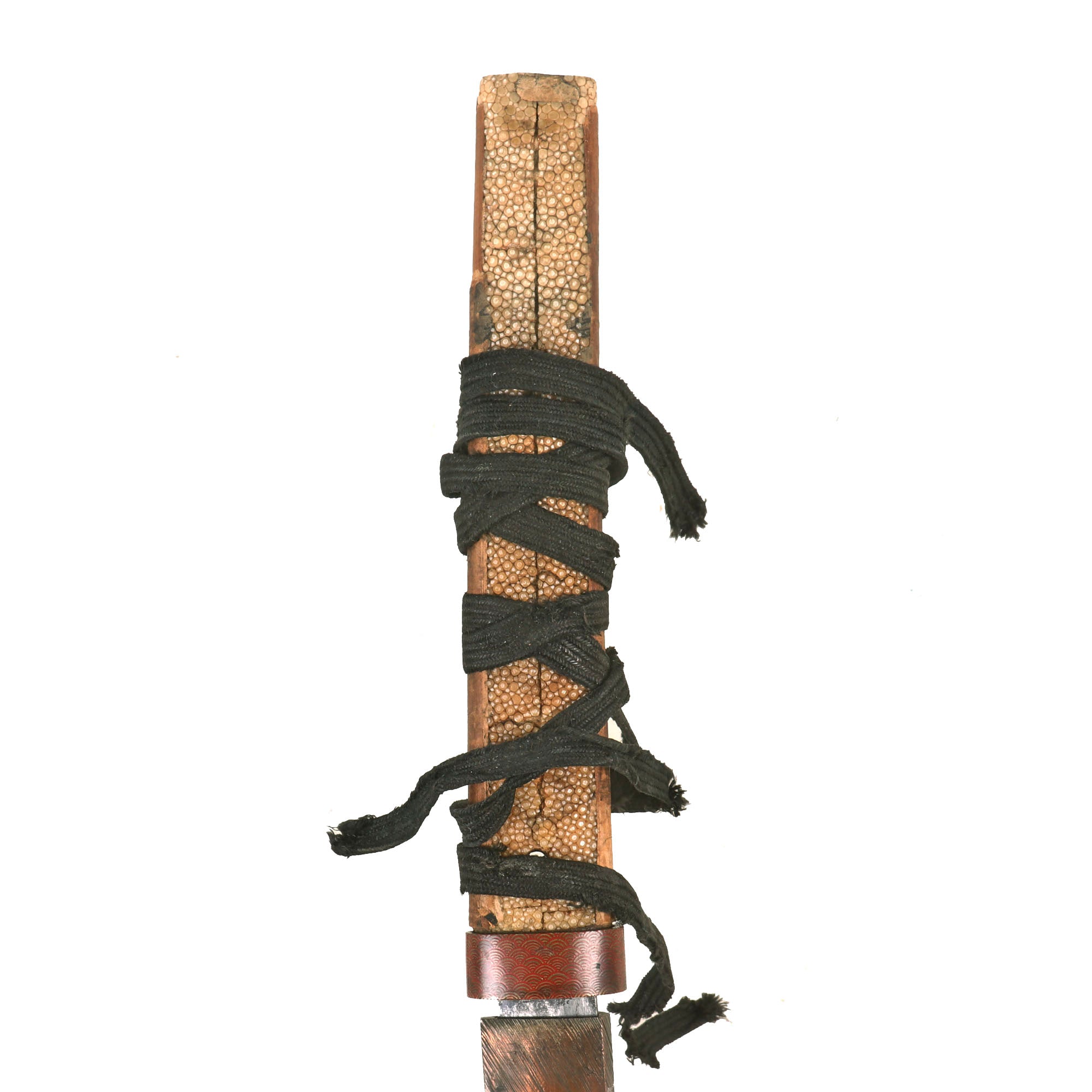 The this example has an overall length of 34 ⅝ inches, and the blade is 25 ⅛ inches long. The polish is unfortunately degraded, showing past staining and oxidation, particularly on the KISSAKI, where there is some scale rust on the surface of the blade. It also looks like in the past unfortunately someone may have used a buffing wheel on portions of the blade in an attempt to "clean" it. The edge however is still relatively sharp with no major dents or chips aside from the issues with the tip. The hamon is also still visible in the light on much of the blade. The tang (nakago) is of the futsu 普通 (regular) style, with a Kuri-jiri (aymmetrically rounded) nakago-jiri (tang-tip).
