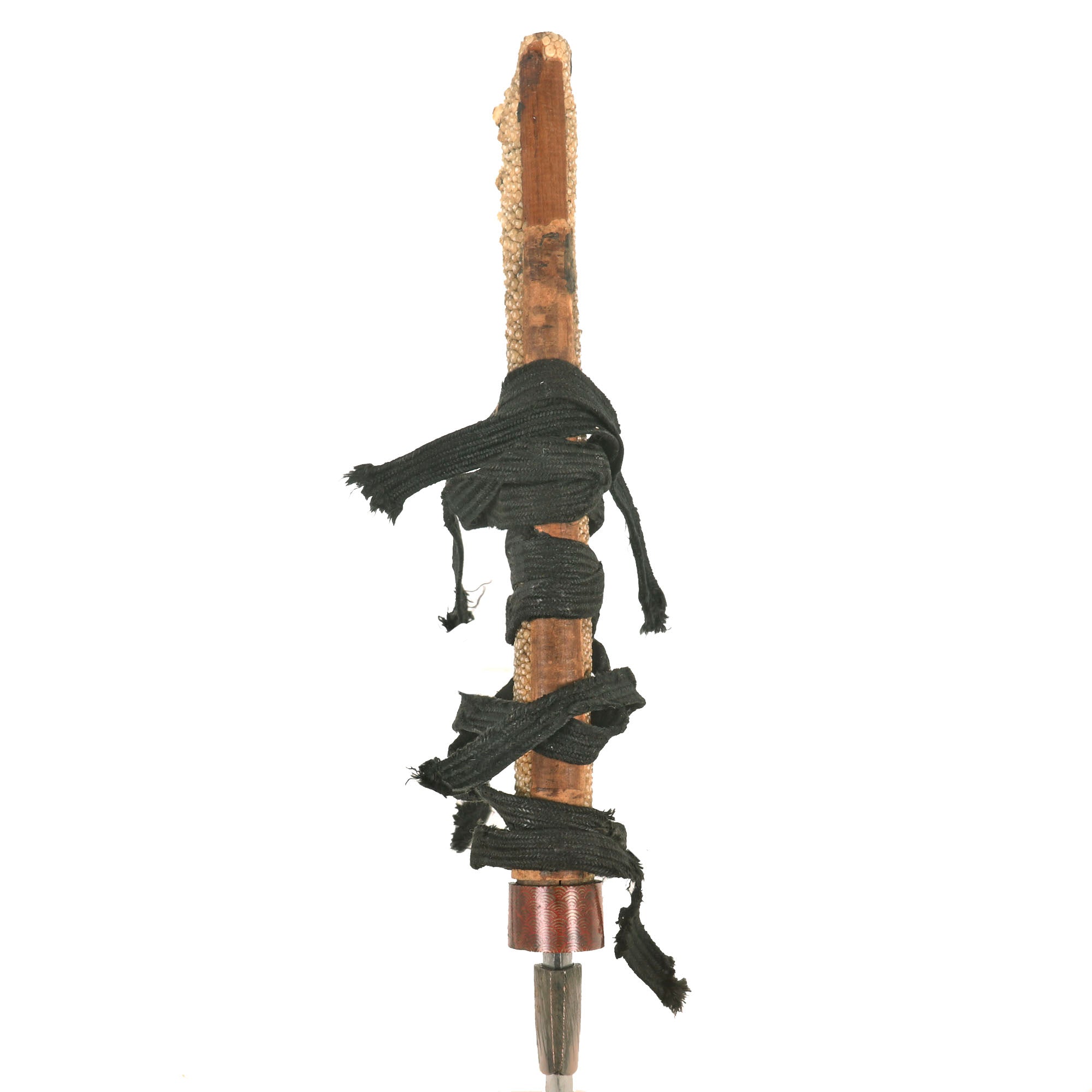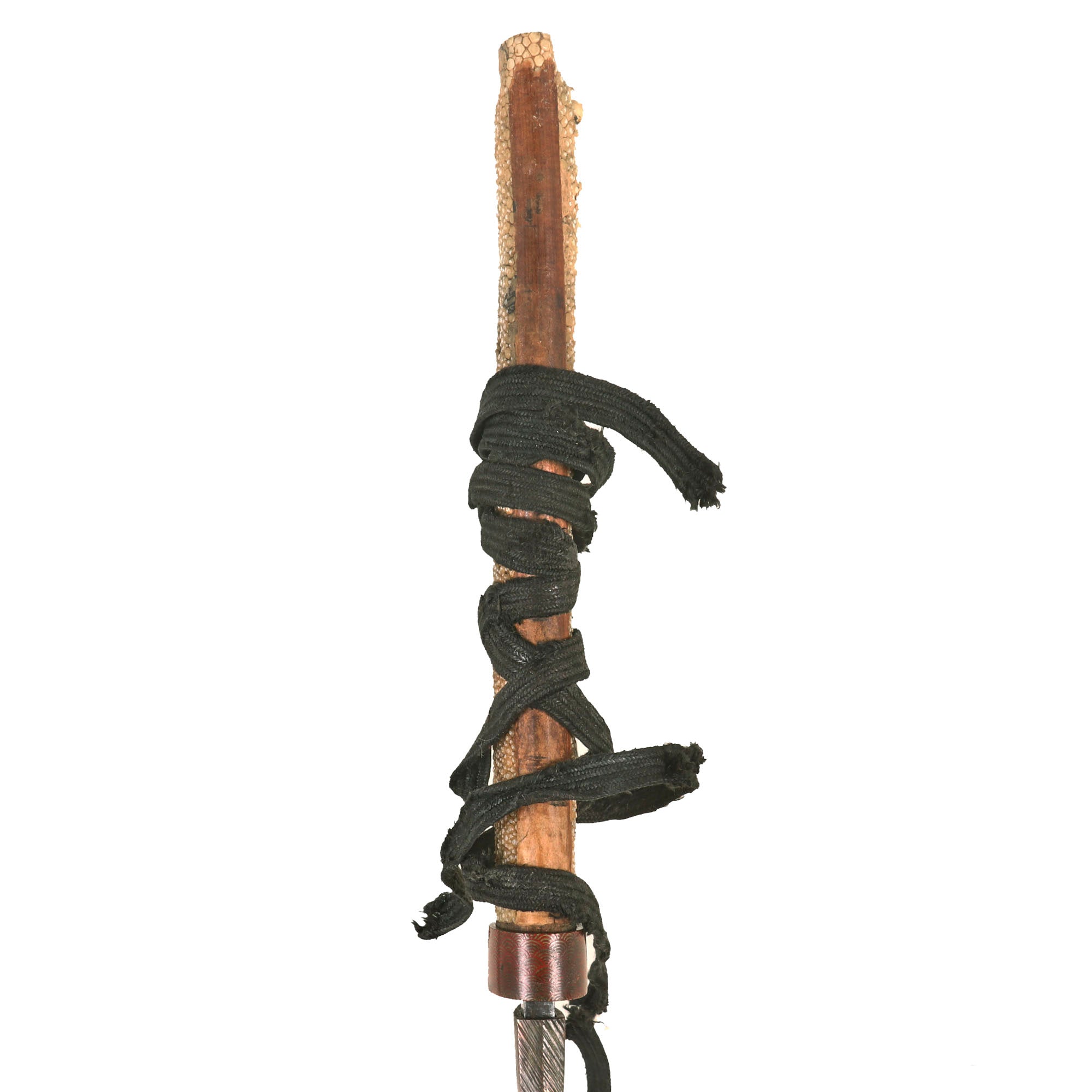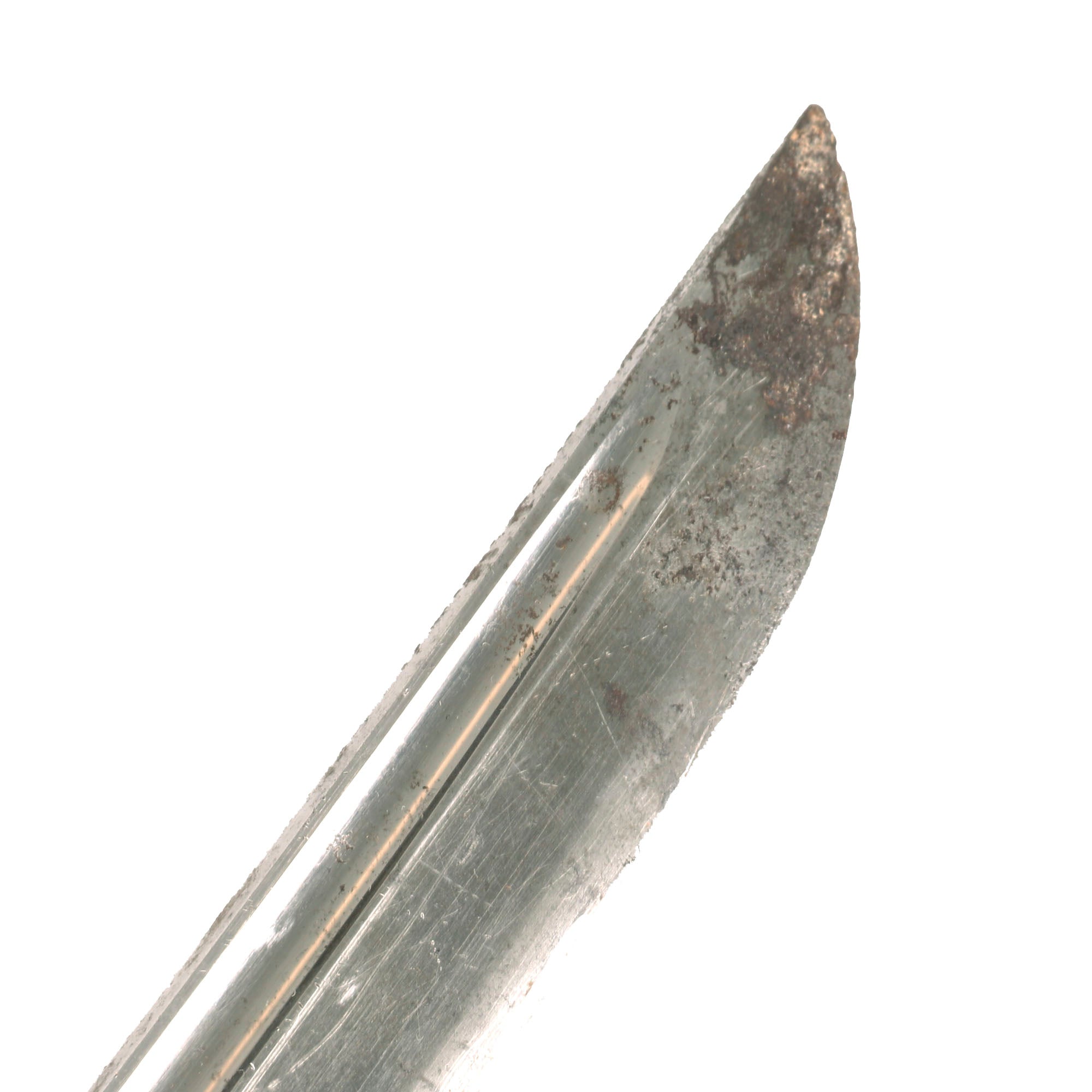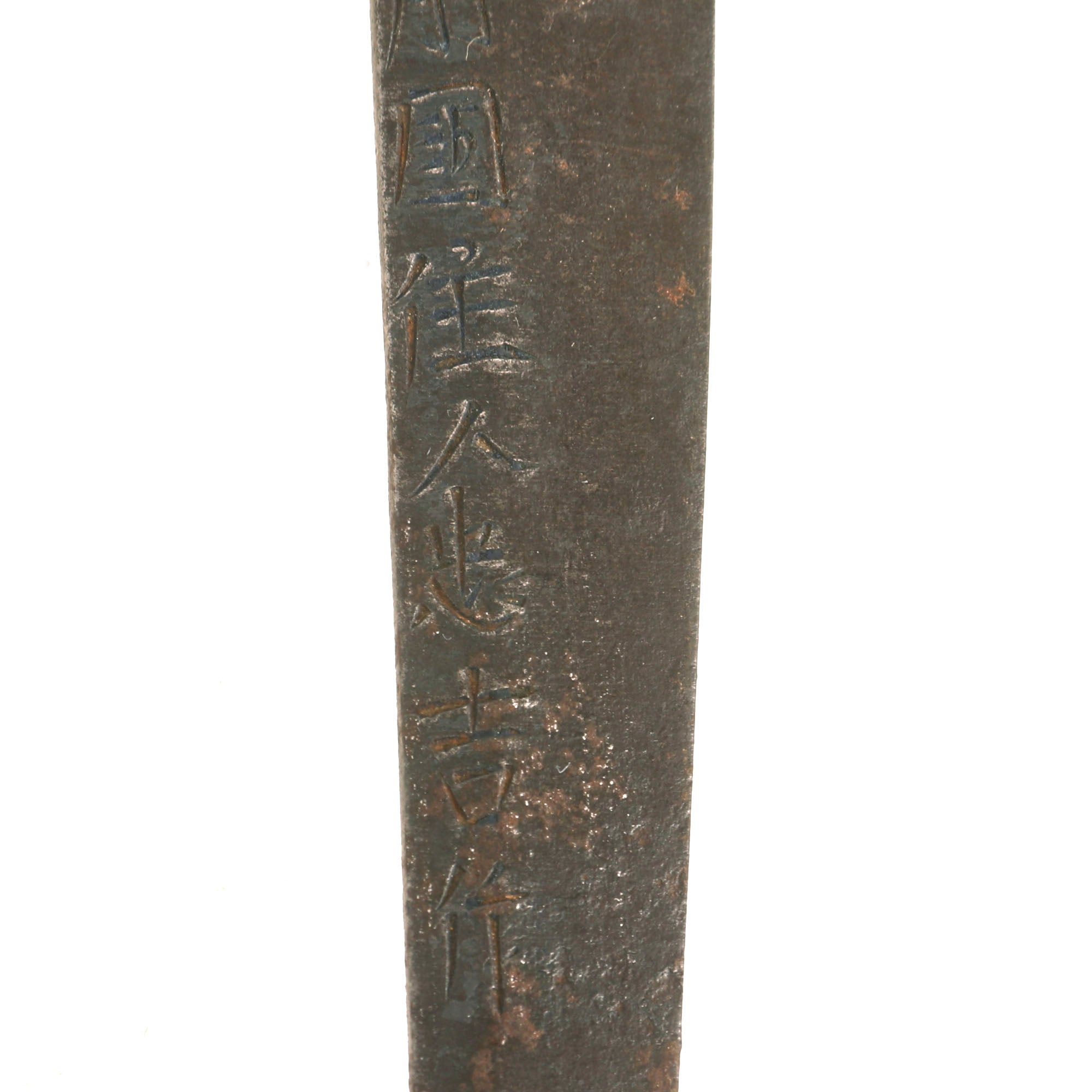 The this example has an overall length of 34 ⅝ inches, and the blade is 25 ⅛ inches long. The polish is unfortunately degraded, showing past staining and oxidation, particularly on the KISSAKI, where there is some scale rust on the surface of the blade. It also looks like in the past unfortunately someone may have used a buffing wheel on portions of the blade in an attempt to "clean" it. The edge however is still relatively sharp with no major dents or chips aside from the issues with the tip. The hamon is also still visible in the light on much of the blade. The tang (nakago) is of the futsu 普通 (regular) style, with a Kuri-jiri (aymmetrically rounded) nakago-jiri (tang-tip).