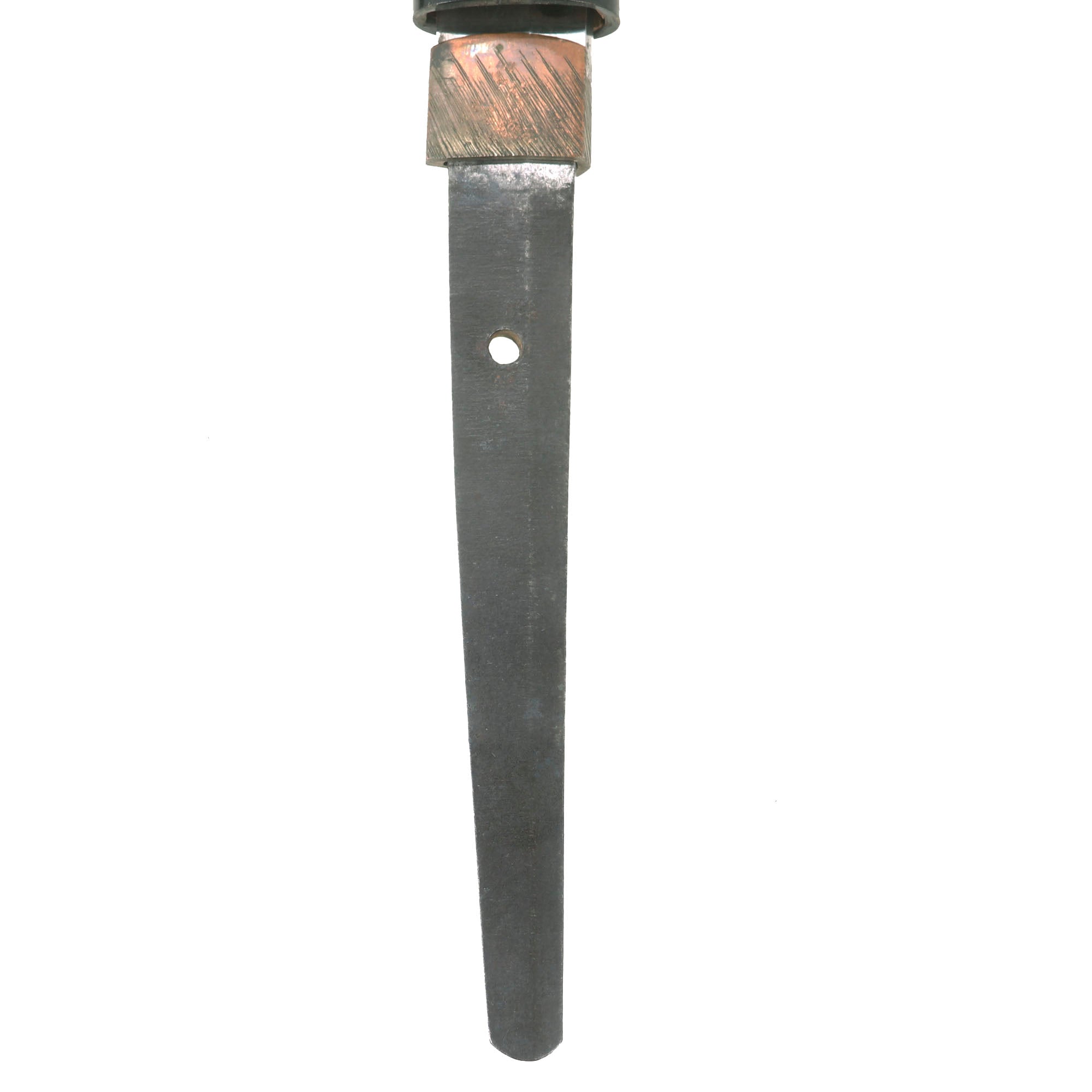 This example has been remounted several times, as was common for Japanese blades, as indicated by the multiple holes in the tang. This combined with age has made the YASURIME (鑢目 - file marks) on the tang faint, and given it a lovely patina from oxidation and rust scaling. The blade is signed, however the TAGANE (chisel marks) are faint and the TAGANE MAKURA (raised area around the mei) is worn down, indicating great age.