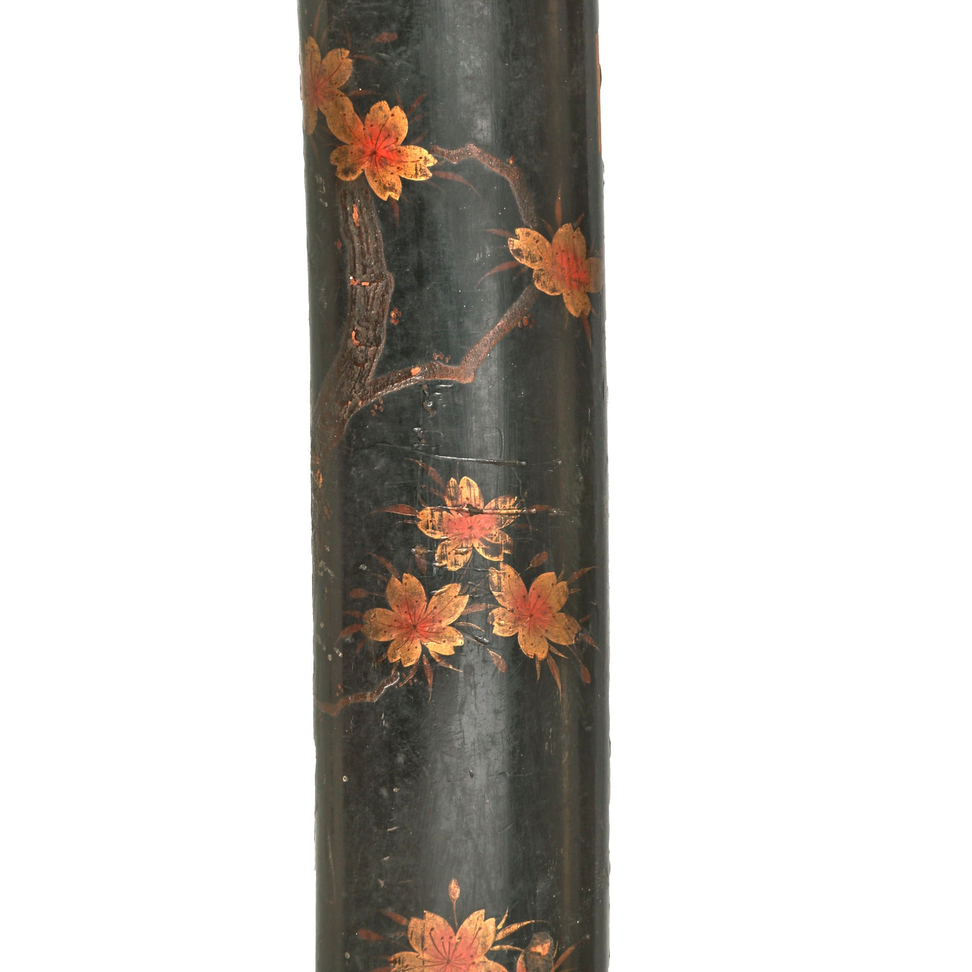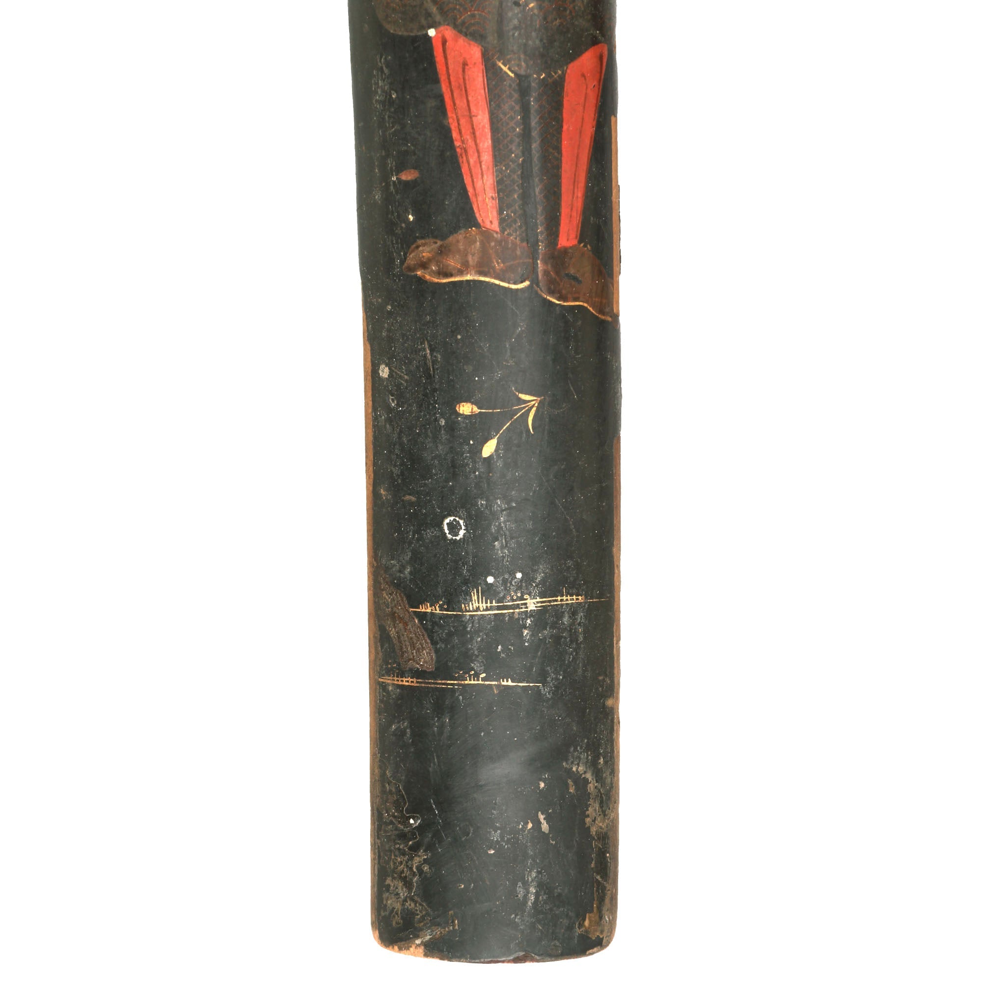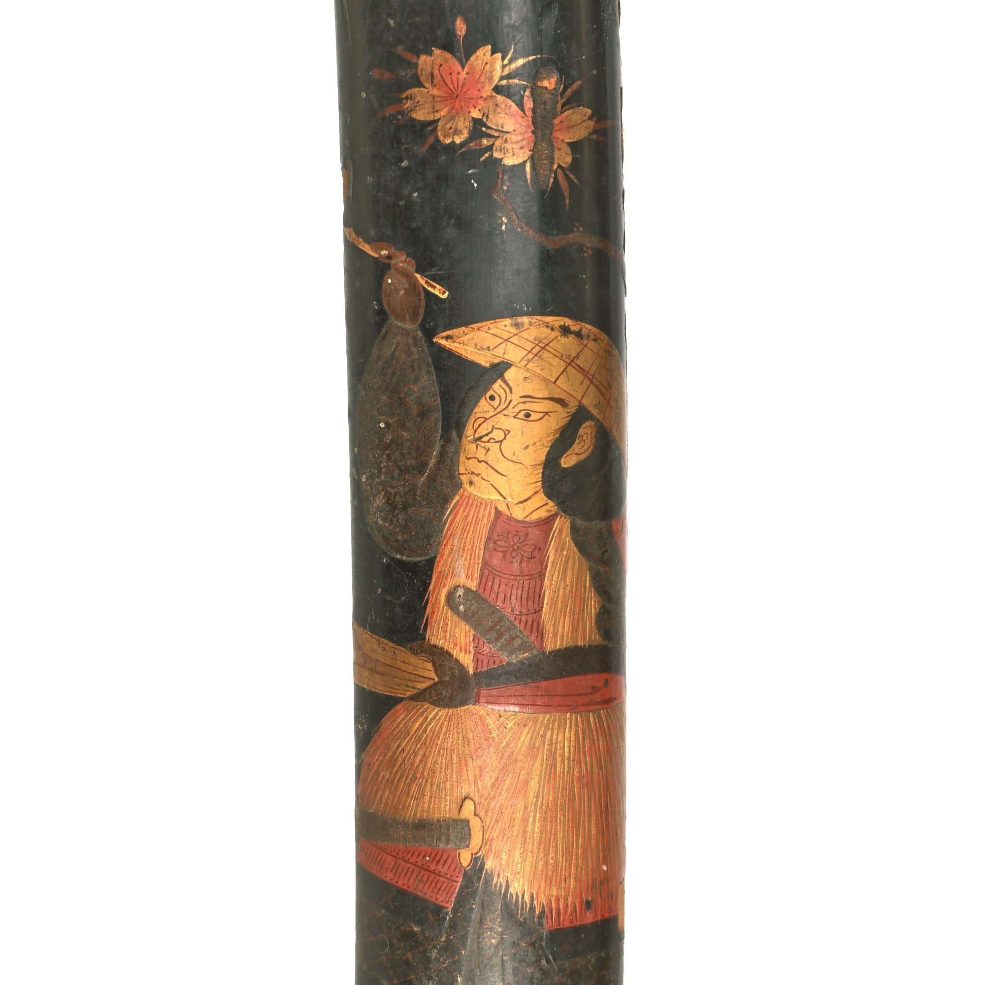 The sword comes in lovely wooden scabbard (saya), which has a very black URUSHI lacquer finish, with some fantastic artwork on both sides. It shows a cherry tree with a samurai next to it, who looks to be writing something while looking at the tree. It is executed in gold, brown, and red textured lacquer, and looks great, in spite of the chipping to the finish. The scabbard has unfortunately had the side seams split on much of the length of the blade, so the tip of the blade can stick out the bottom. THe scabbard does have a KURIKATA knob with a SHITODOME fitting inside, where a SAGEO sword cord might be attached, though there is none included with this example.
