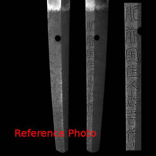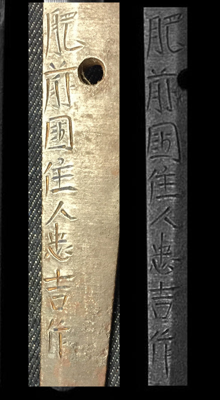 We can however still relatively easily read the characters on the blade: 肥 前 國 住 人 忠 吉 作 - HIZEN NO KUNI JUNIN TADAYOSHI SAKU, which translates to “Made by Tadayoshi in Hizen Province”. The 前 (ZEN) character used on this blade is the correct modified version used by many members of the Hizen school. "Tadayoshi" is a famous lineage of smiths in the Hizen school, which also was a teacher for many other famous members of the school. We have researched this signature, and comparison to other known examples indicates that it was forged by 初代 忠吉 (SHODAI TADAYOSHI), or the first generation TADAYOSHI in Hizen province, a GRAND MASTER level smith. It is correctly signed on the opposite side of the blade from the usual, which is also typical for this smith. They were later known by the name 橋本 新左衛門尉 忠吉 - HASHIMOTO SHINSAEMONJO TADAYOSHI, which includes titles of great importance. For more information, as well as pictures of the reference oshigata we compared this sword to, please see this page at the Nihonto Club: TADAYOSHI.