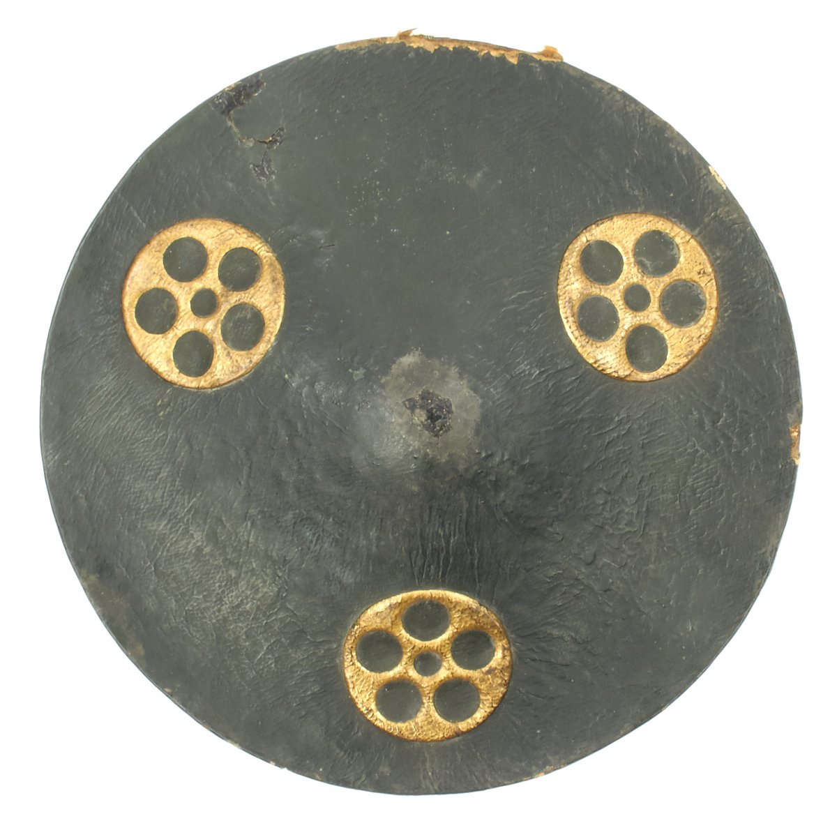 There is slight damage to the lacquer on the left exterior of the skull which is very minor. A very interesting Original Japanese Foot Soldier's JINGASA helmet, which we are told from its shape was used by an Archer circa 1850.