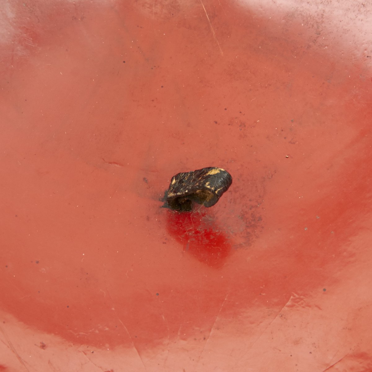 Our example bears a family MON or crest, in triplicate, in gold to the front which identified with ease the wearer's affiliation. Originally used with a minimal hemp padded cushion liner secured by ribbons this is now absent. Black finish on the exterior with the three matte gold Mon, the interior is finished in bright red lacquer.