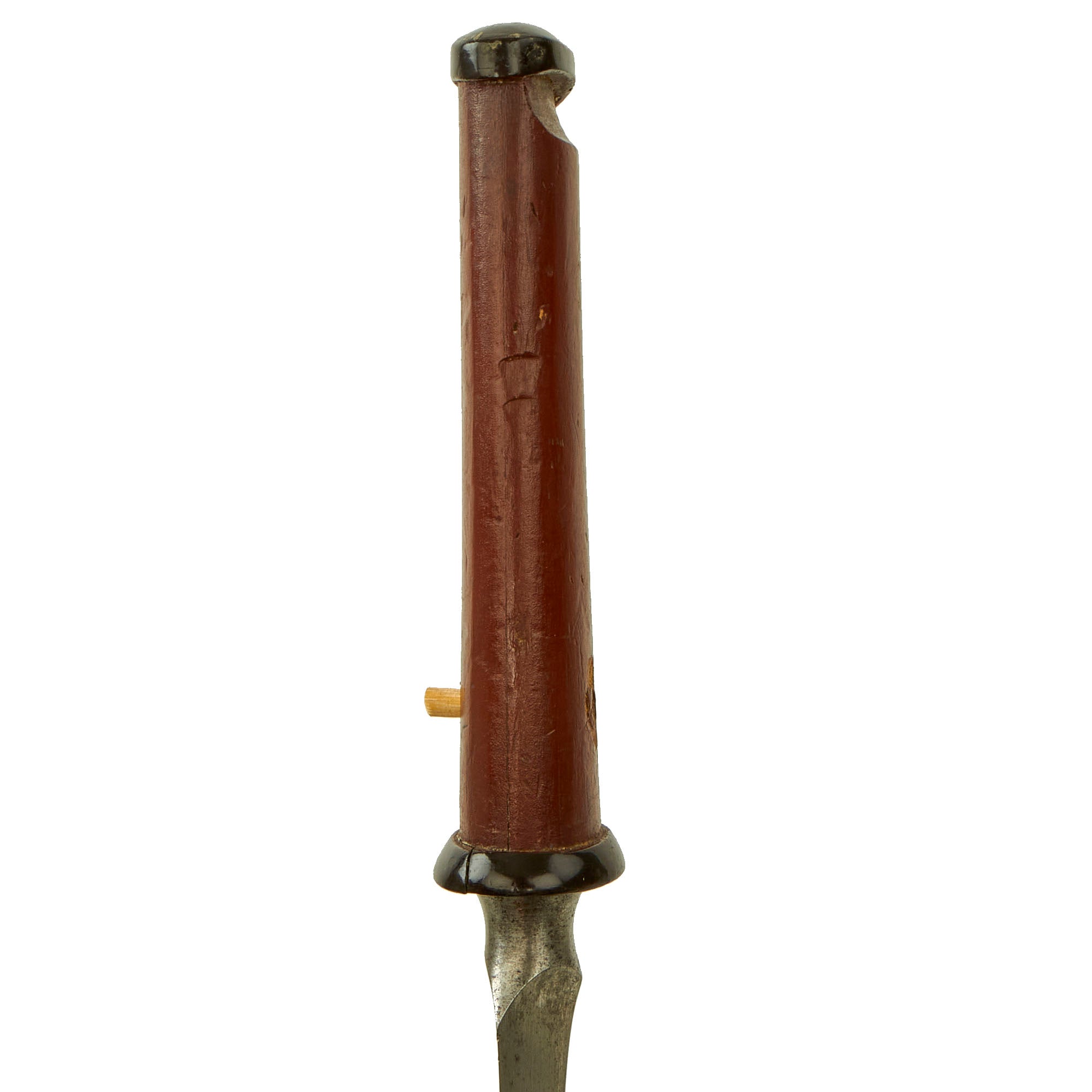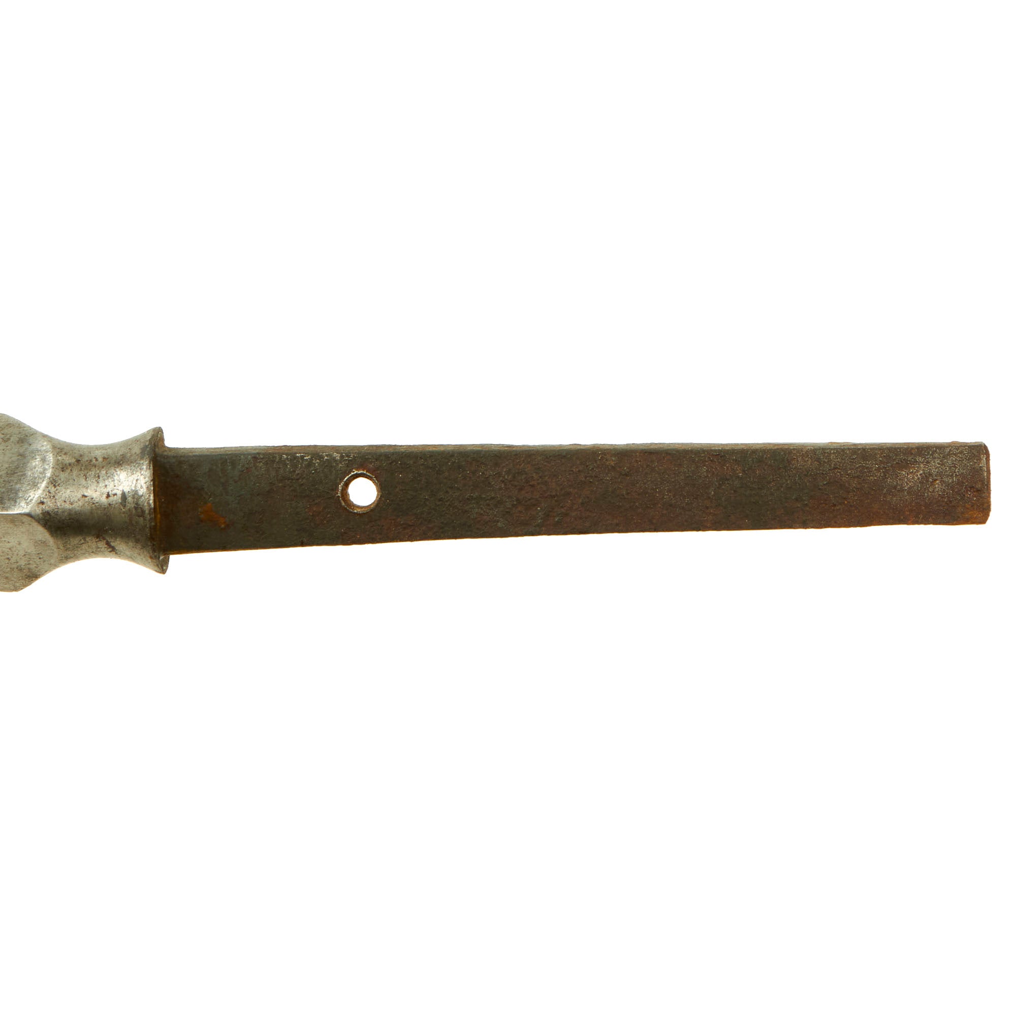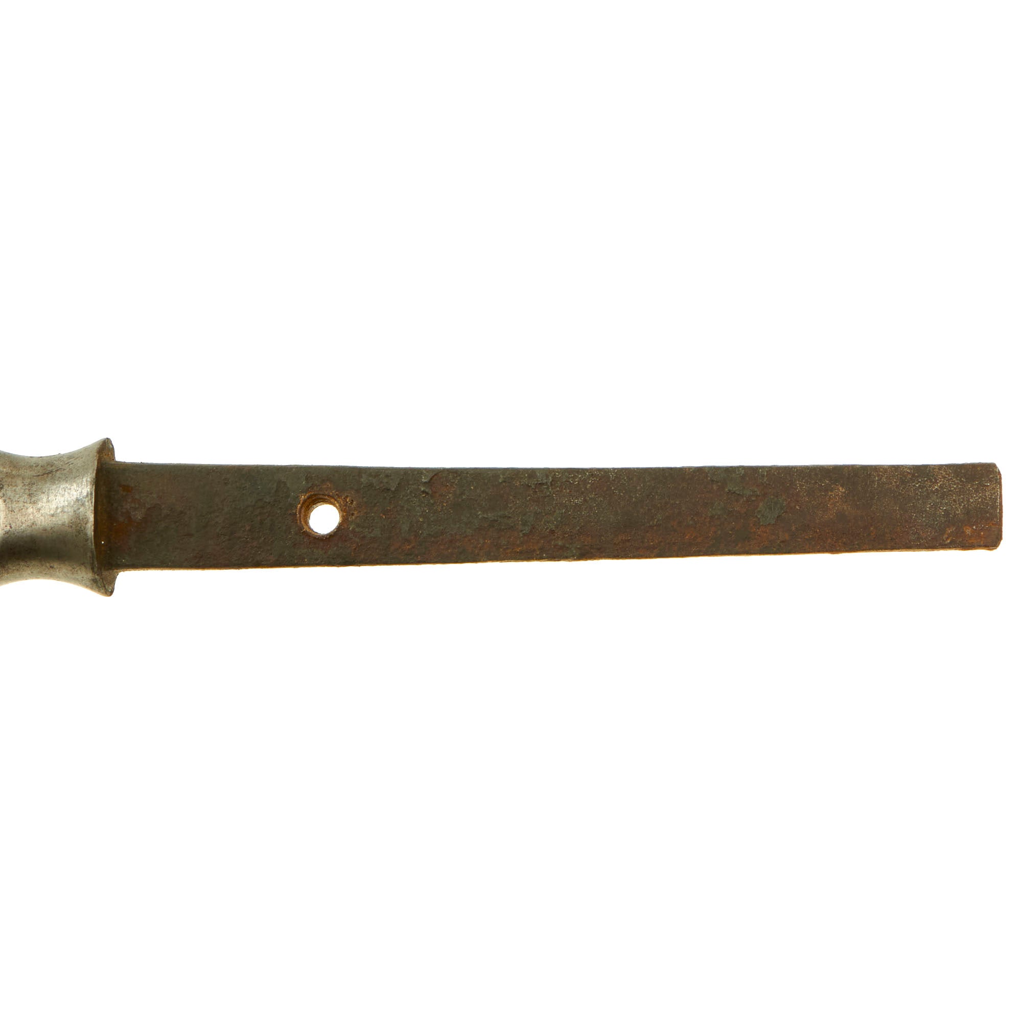 Original Item: Only One Available. Purchased at a recent military show, this is a very nice Japanese Tanto (短刀), which literally means short sword. These could be in any number of different shapes, depending on the requests of the person who ordered it. The blade length of a tanto is typically between 15 and 30 cm (5.9 to 11.8 inches), or 1 Japanese shaku, an ancient measurement. This example is a bit different from what we normally see, as the blade is actually taken from a yari (槍), a traditionally-made Japanese blade (nihonto) in the form of a spear, or more specifically, the straight-headed spear. We have seen these called both "Tanto Yari" as well as "Yari Tanto", and there does not appear to be any consensus on an "official" designation.