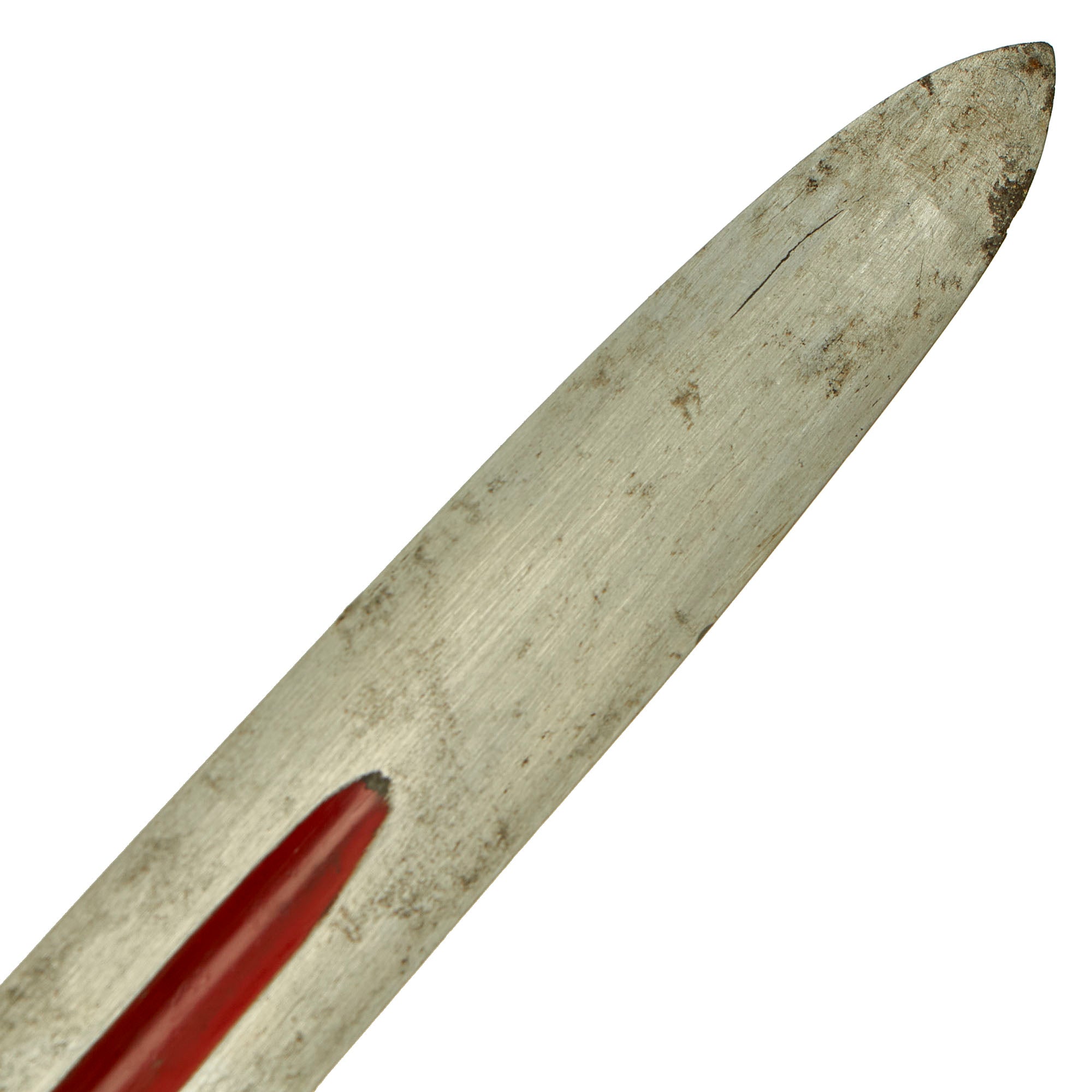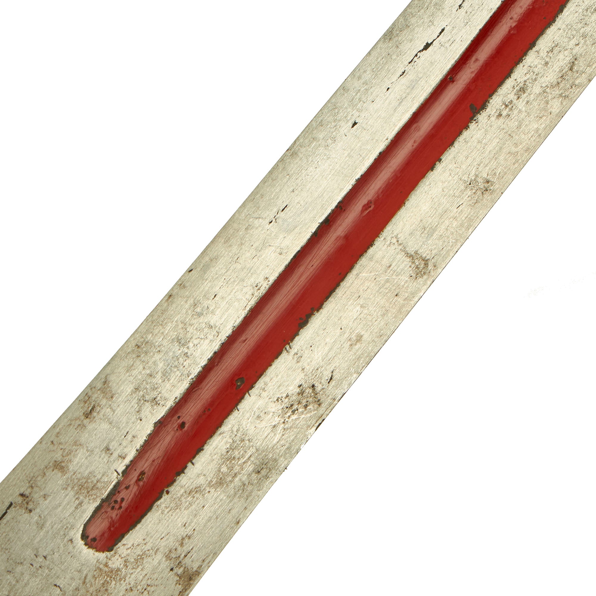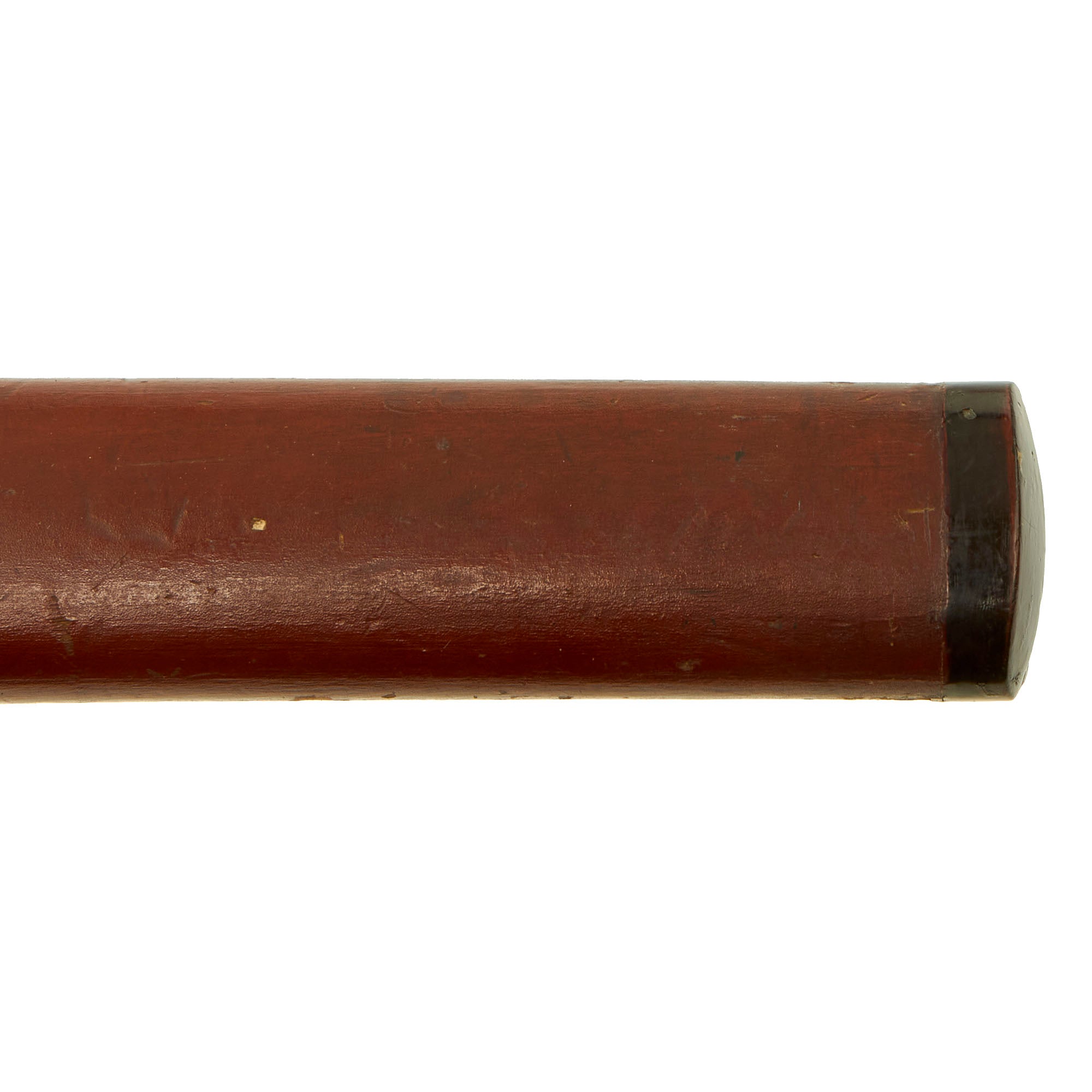 Offered in very good condition, the blade of this example is in very nice condition, though it has definitely seen use and cleaning since its last polishing. There are also some areas of light staining oxidation. This has resulted in the aspects of the blade being quite faint, and we can no longer make out a temper line. There are some edge bends and dents as well, so this definitely looks to have seen real use. The BO'HI (棒樋 - large or wide groove) fuller has been painted with red URUSHI lacquer, very common on polearm blades such as this. Blade length is approximately 11 7/8" and overall length 18 1/8". It has a futsu 普通 (regular) Nakago with a KIRI (cut) nakago-jiri (tang tip). The blade on this example is definitely handmade, as it features WARE (lamination lines), and FUKURE (carbon pits) only possible on traditionally made blades.