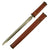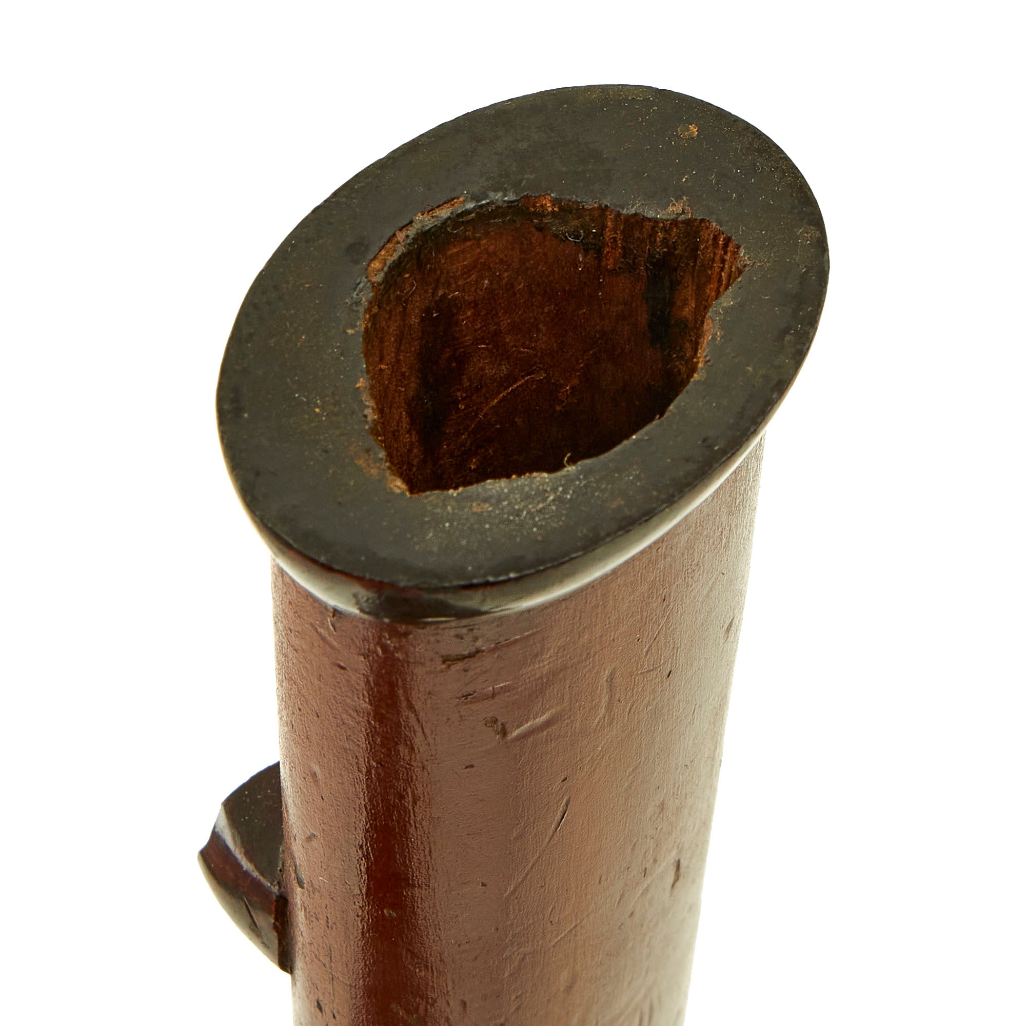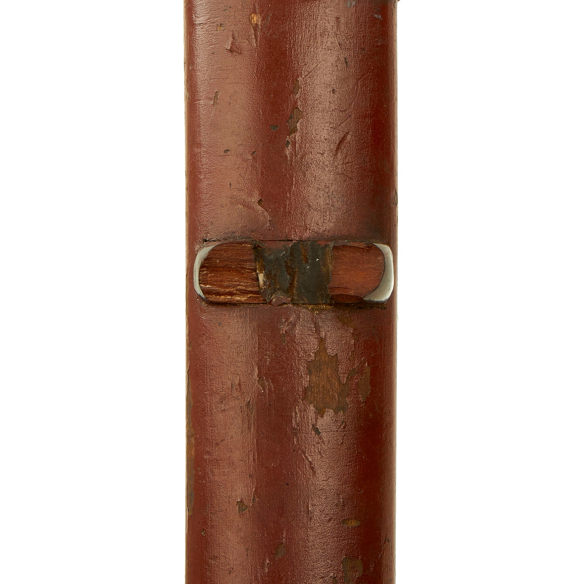 The fittings on this "Tanto Yari" are quite simple, similar to a resting scabbard, but painted with ochre-colored urishi lacquer, with some composite or horn fittings on the ends. Both the TSUKA (handle) and SAYA (scabbard) are in very good condition, showing some wear from age, and fit the blade well. The handle is held on by a replacement MEKUGI (peg), made from bamboo.