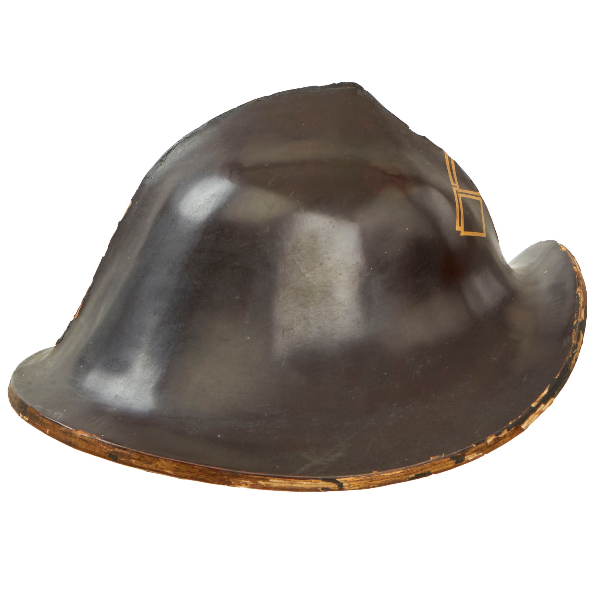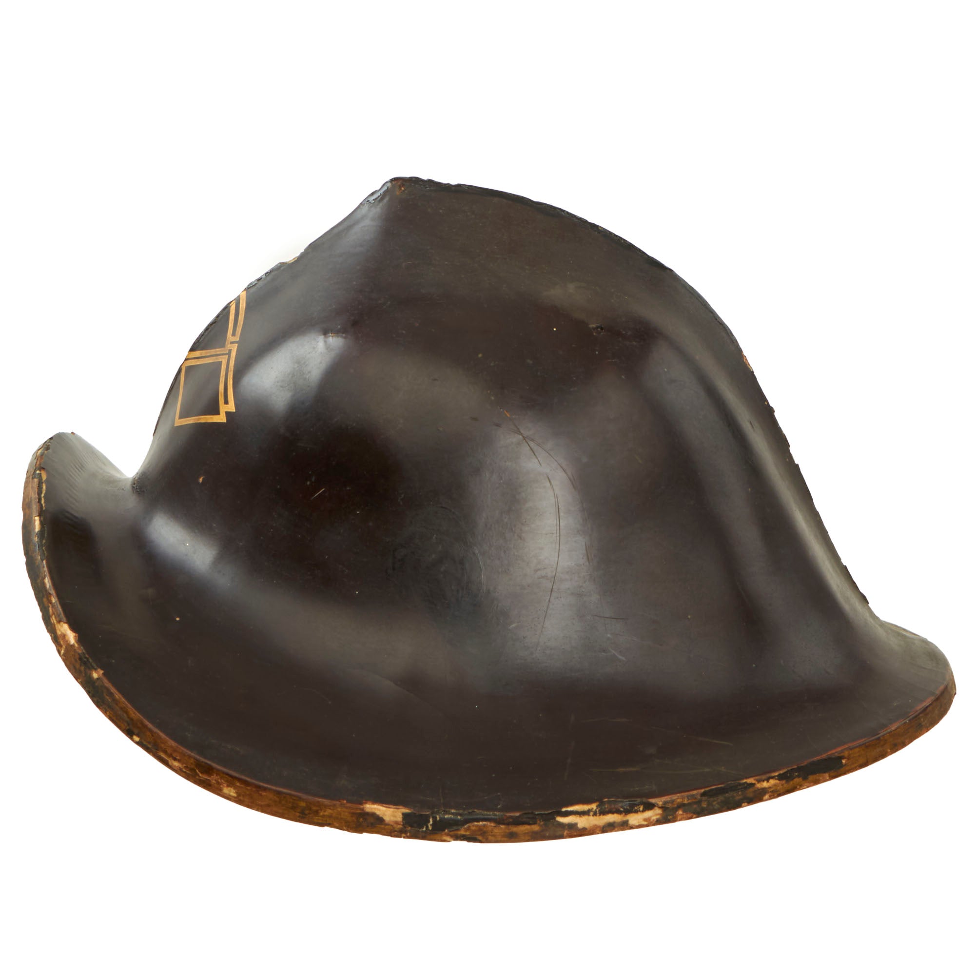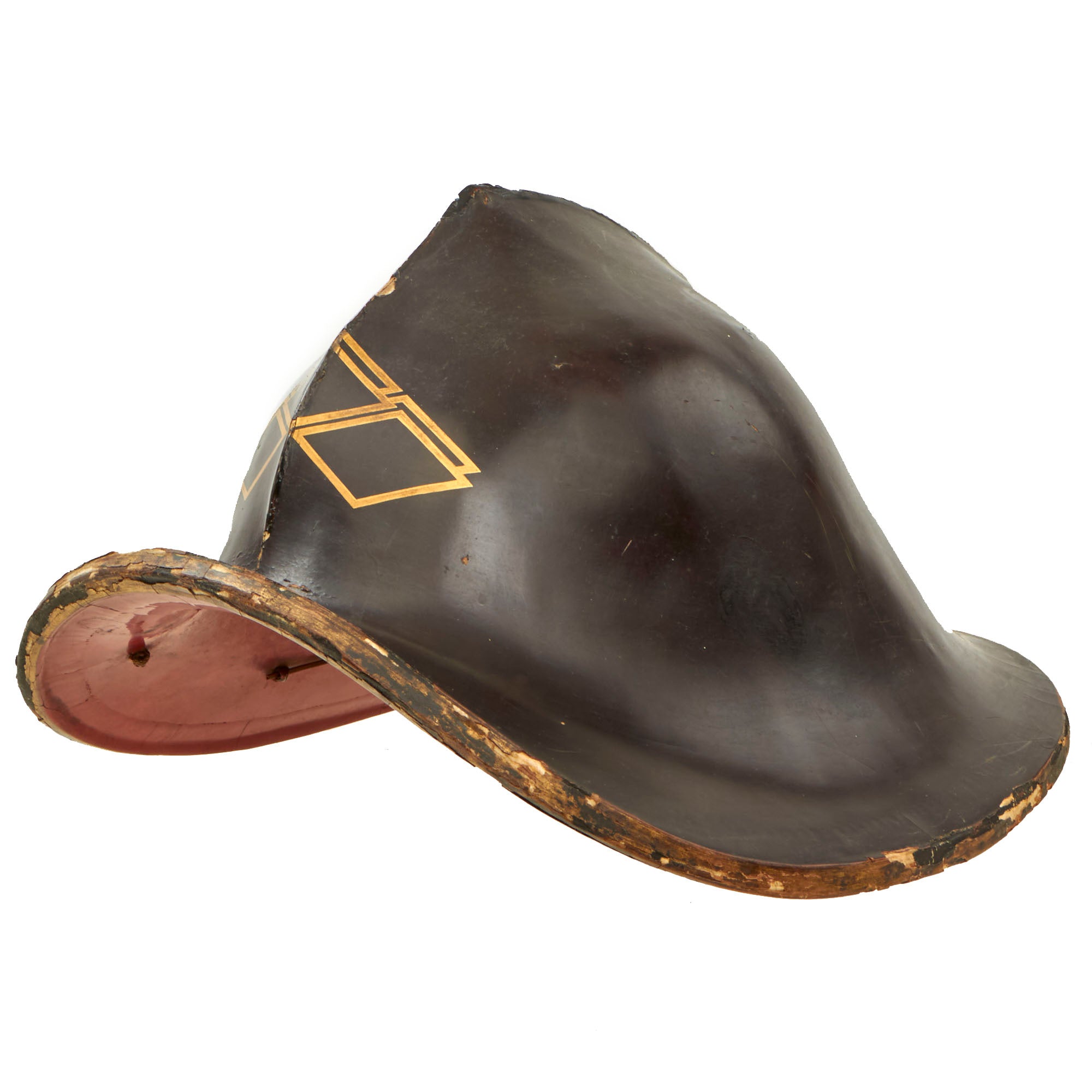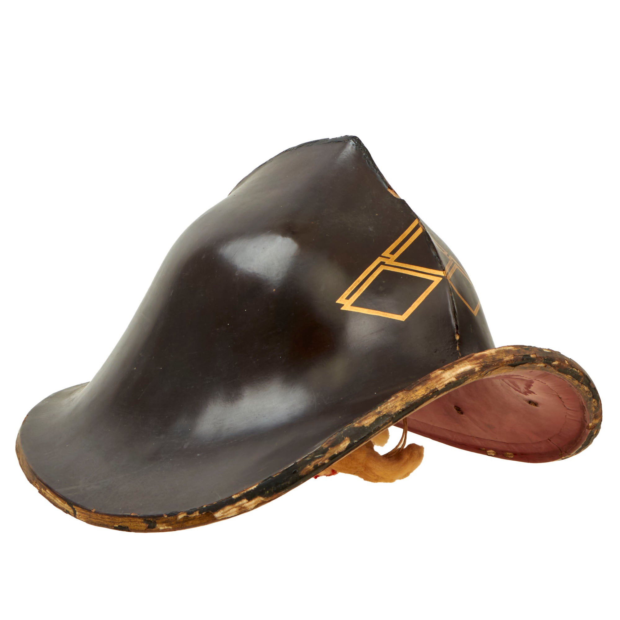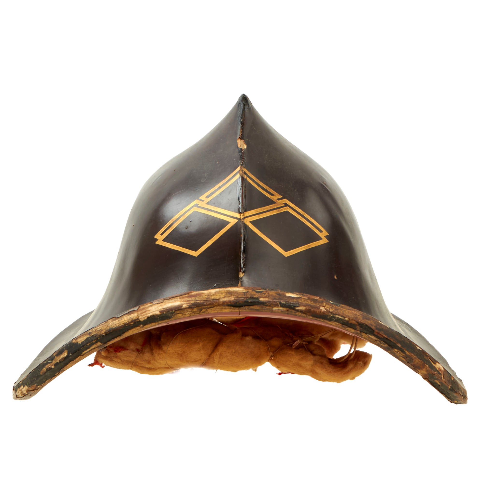 This is an original Japanese Lacquered Jingasa head covering or helmet. They were constructed usually from pressed fabric and paper, and in fact provided exceptional protection from attack with a blade from a horseman. This example is high domed, and would have provided protection from all sides except the front. We looked to see if we could find a name for this specific style, but were unfortunately unsuccessful. It is finished with black urushi lacquer on the exterior, with red on the inside, the classic color pattern. The interior still retains the head pillow and fabric liner ring which is not fully connected to the helmet at both sides, so some of it hangs out. The helmet measures roughly 13½ x 13 x 9”.