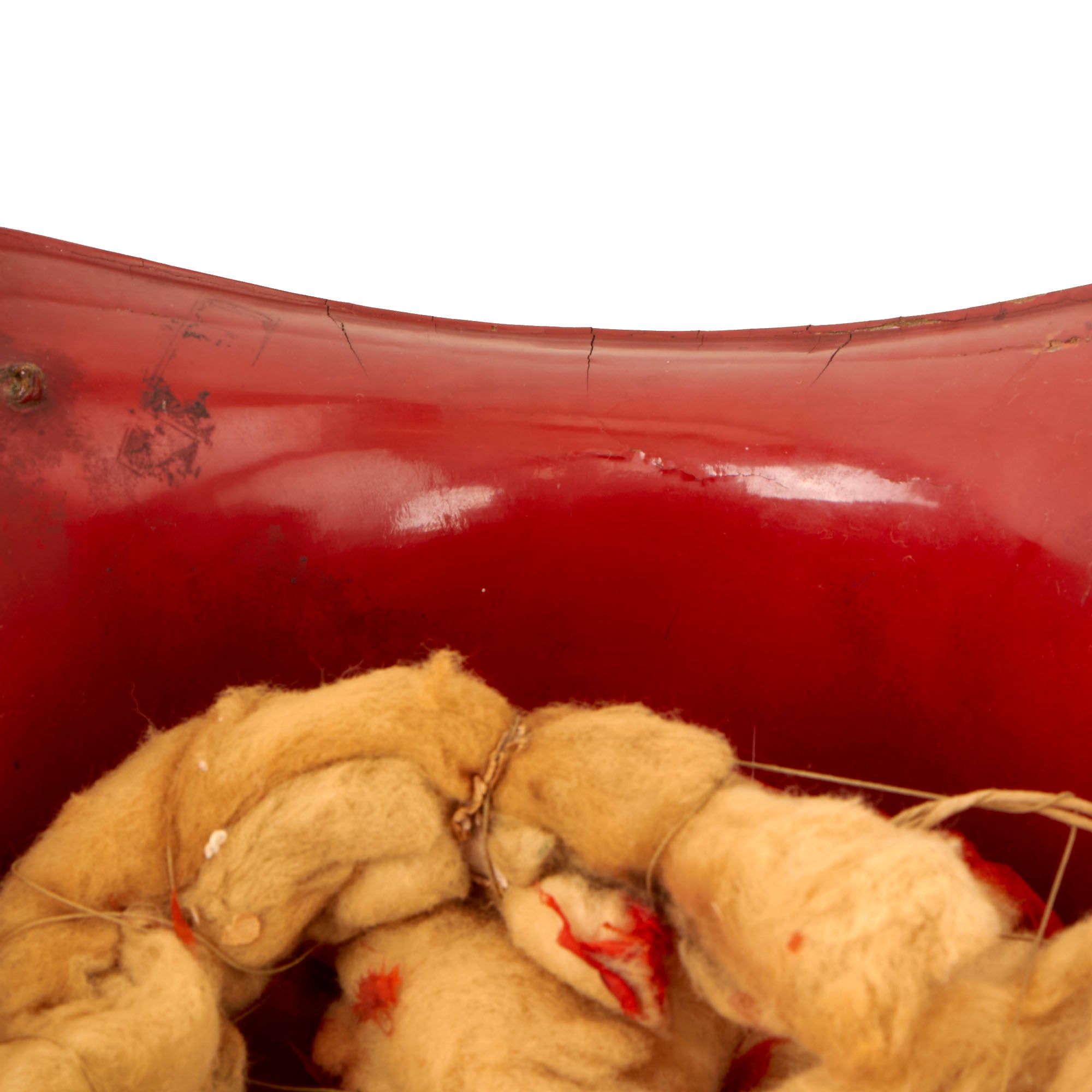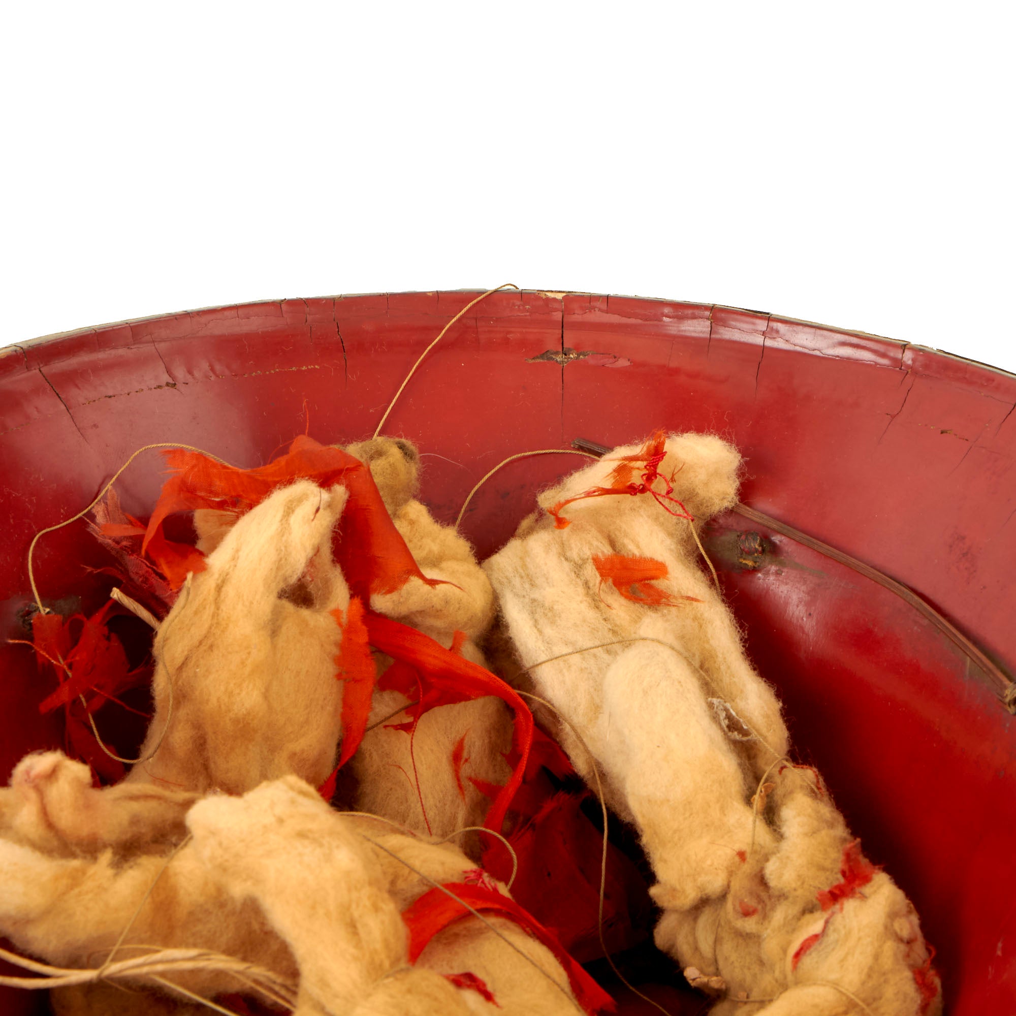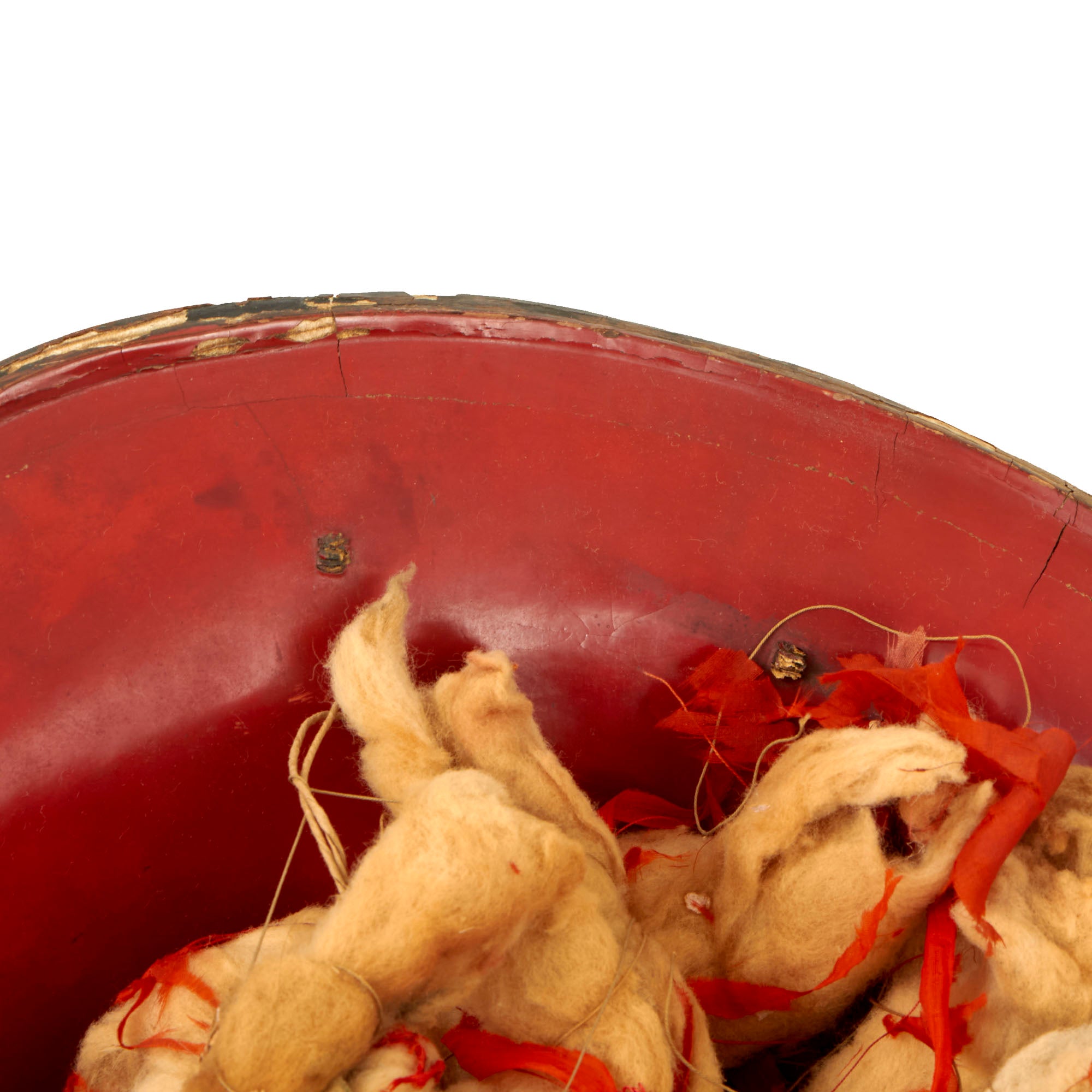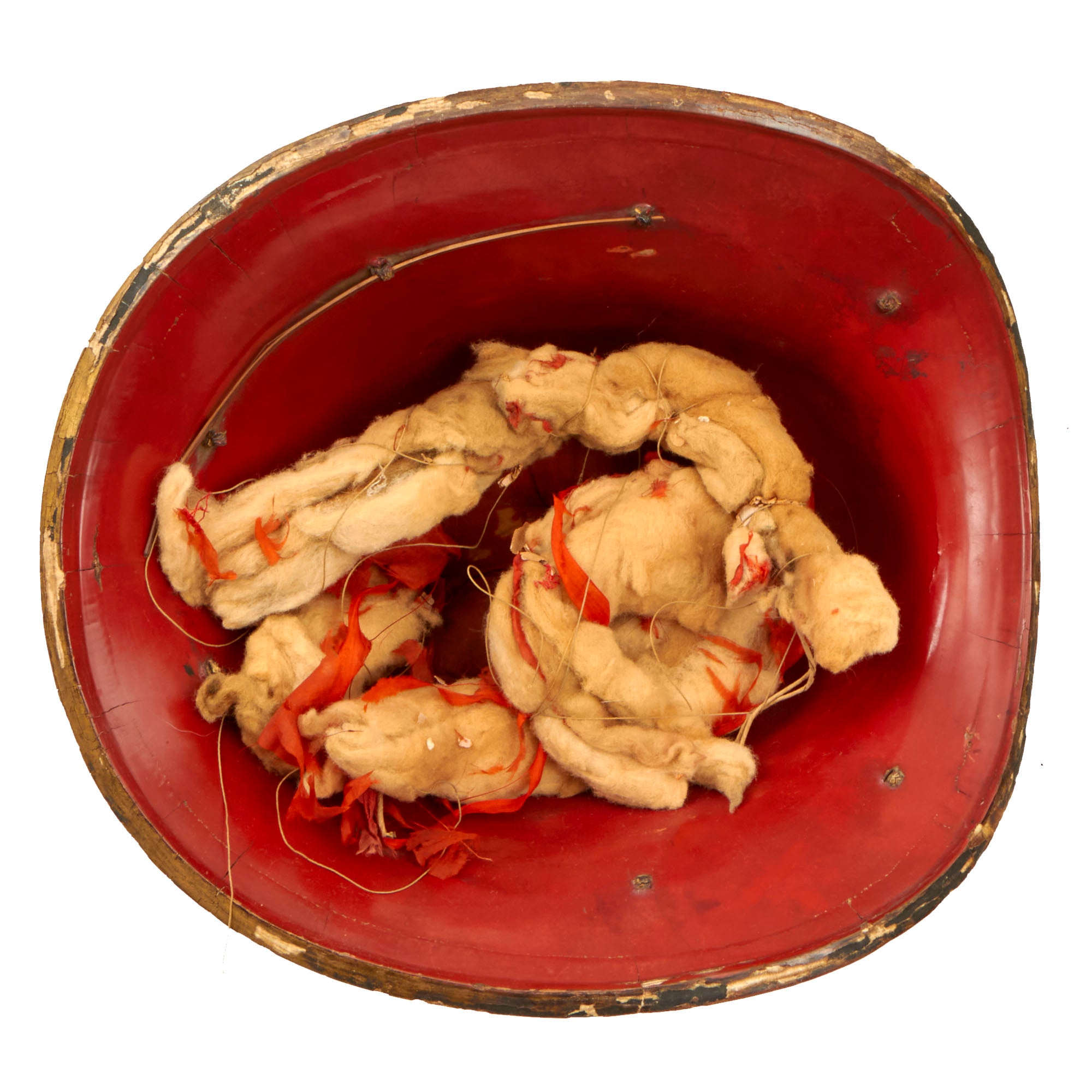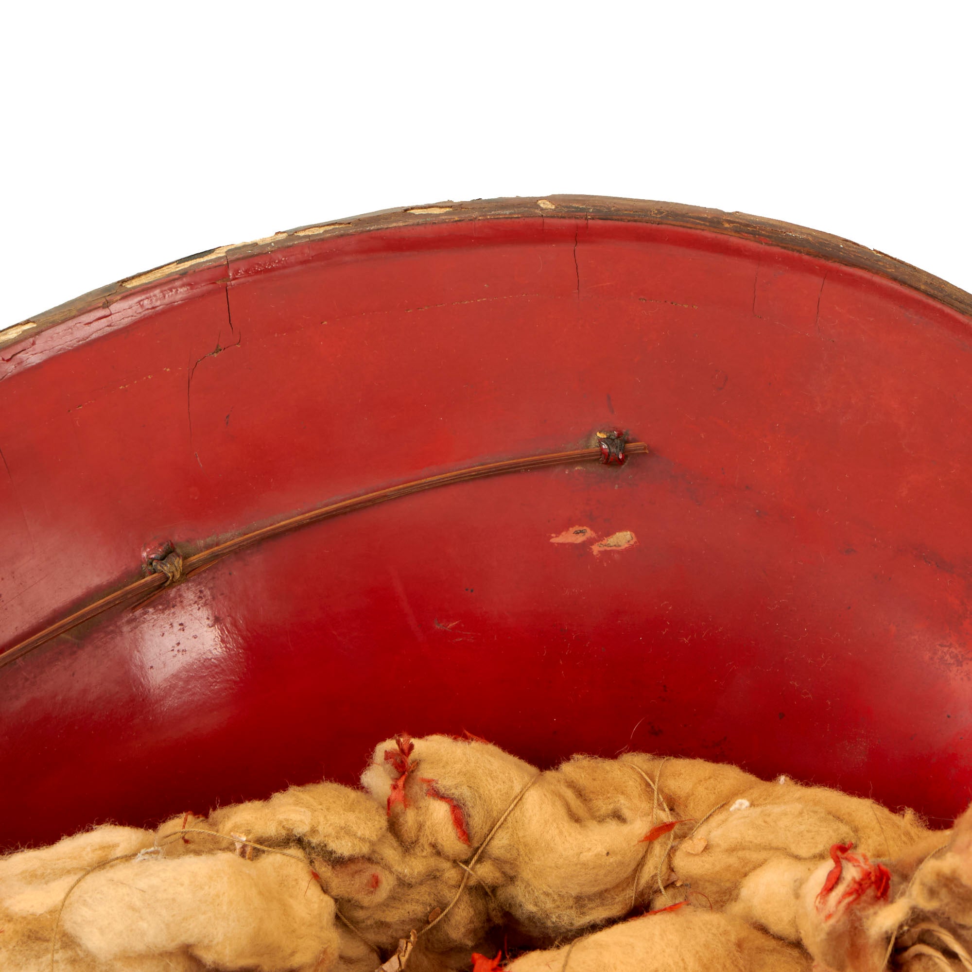 This is an original Japanese Lacquered Jingasa head covering or helmet. They were constructed usually from pressed fabric and paper, and in fact provided exceptional protection from attack with a blade from a horseman. This example is high domed, and would have provided protection from all sides except the front. We looked to see if we could find a name for this specific style, but were unfortunately unsuccessful. It is finished with black urushi lacquer on the exterior, with red on the inside, the classic color pattern. The interior still retains the head pillow and fabric liner ring which is not fully connected to the helmet at both sides, so some of it hangs out. The helmet measures roughly 13½ x 13 x 9”.