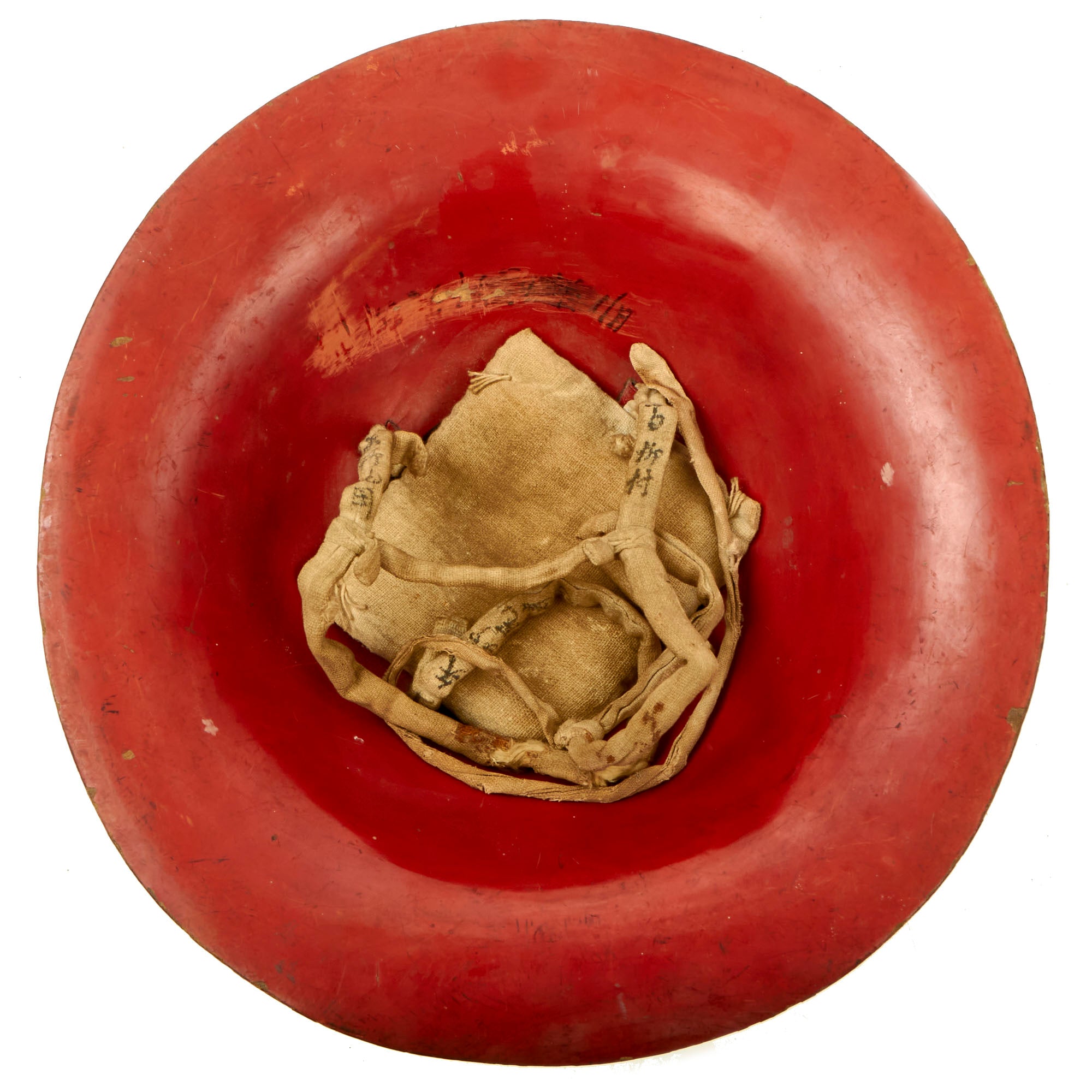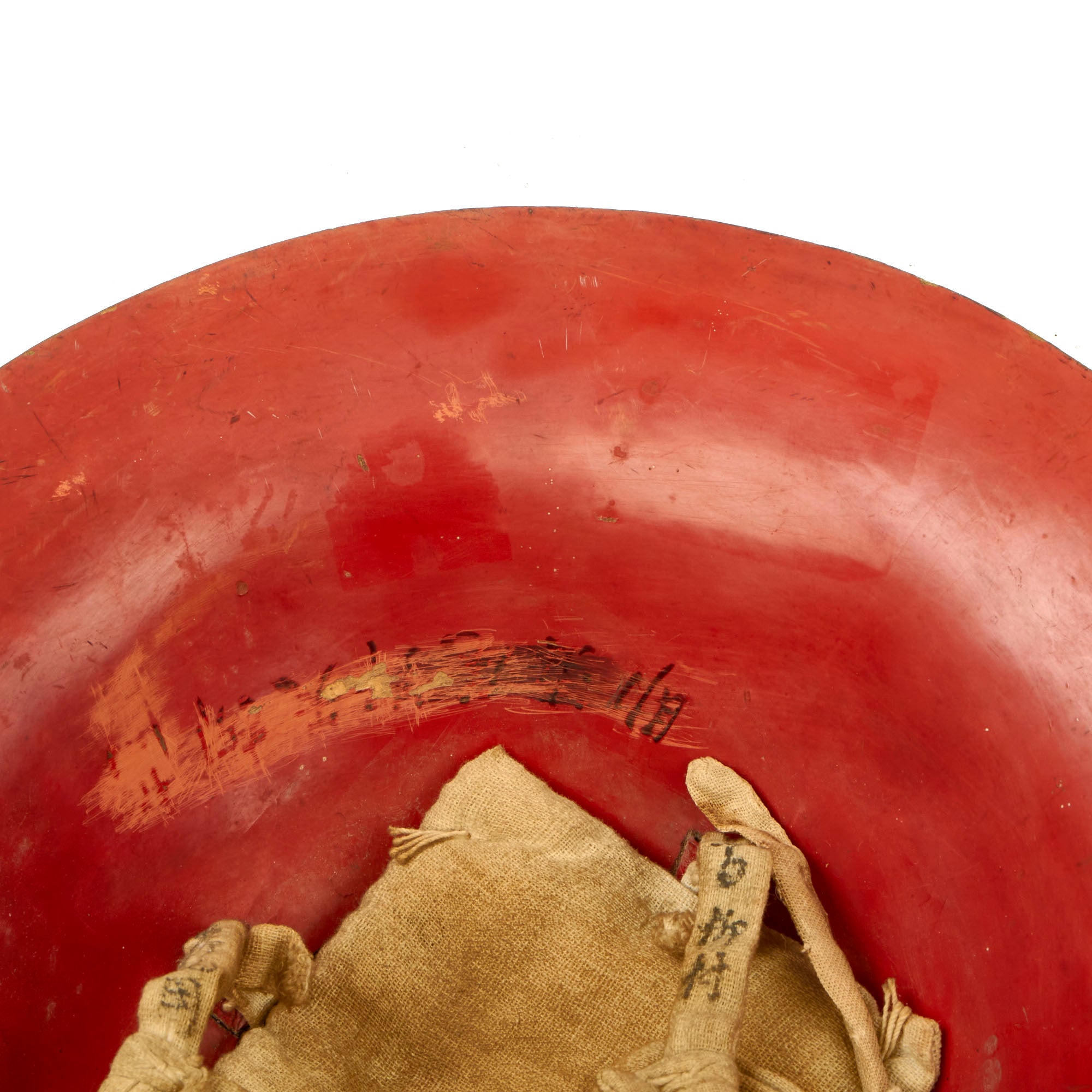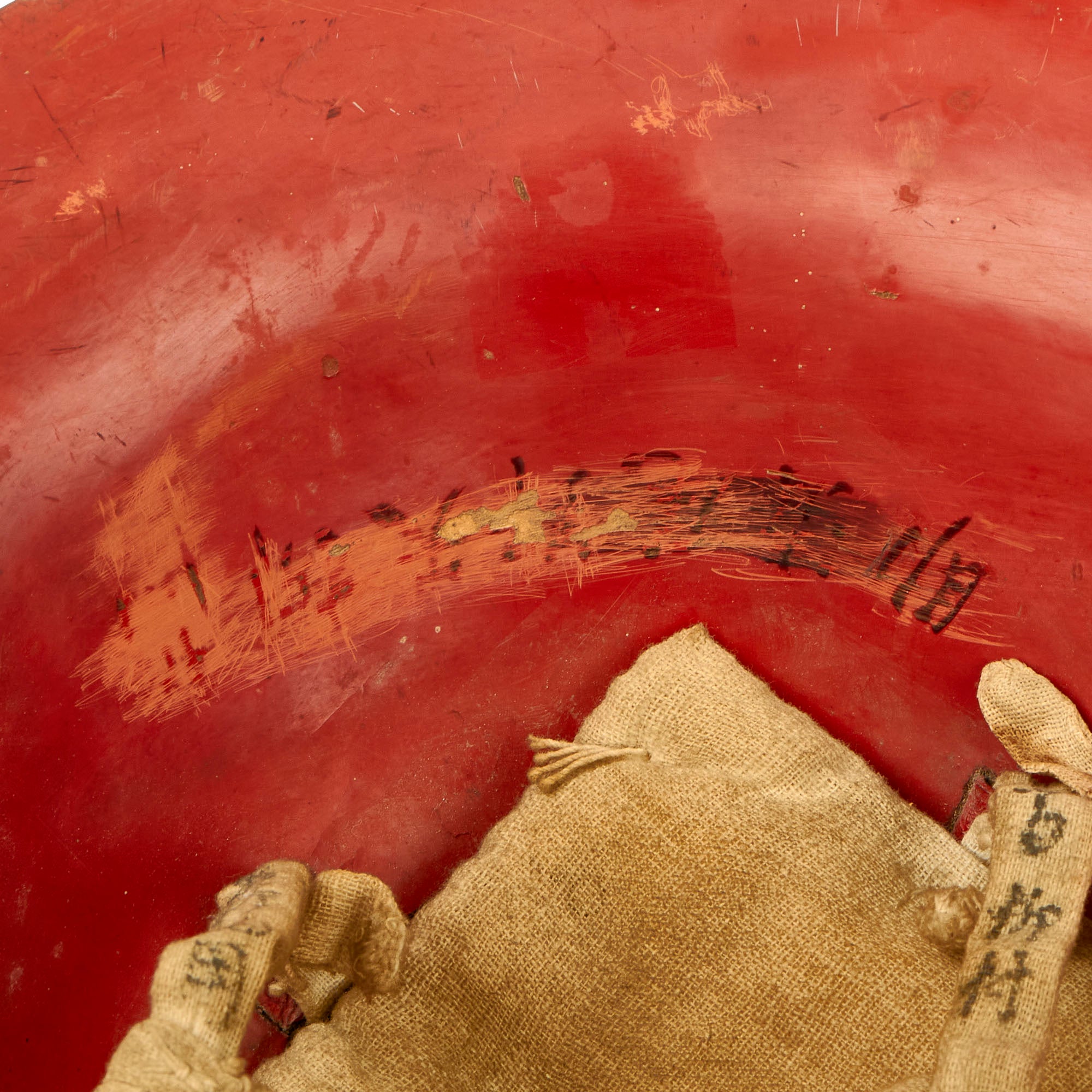 These were used with a minimal padded cushion liner, with a squarish pad on the crown, and padded loops to go on either side of the head. These would then be connected by straps or ribbons. This example still has the complete liner, which looks to be filled with pulled plant fiber on both the crown and side straps. It does have a bit of fraying and tearing, showing REAL period wear. This is definitely not a helmet that was restored recently or one of the many modern made helmets flooding the market. There are even Japanese Kanji Markings on the side straps, which could make a great translation project!