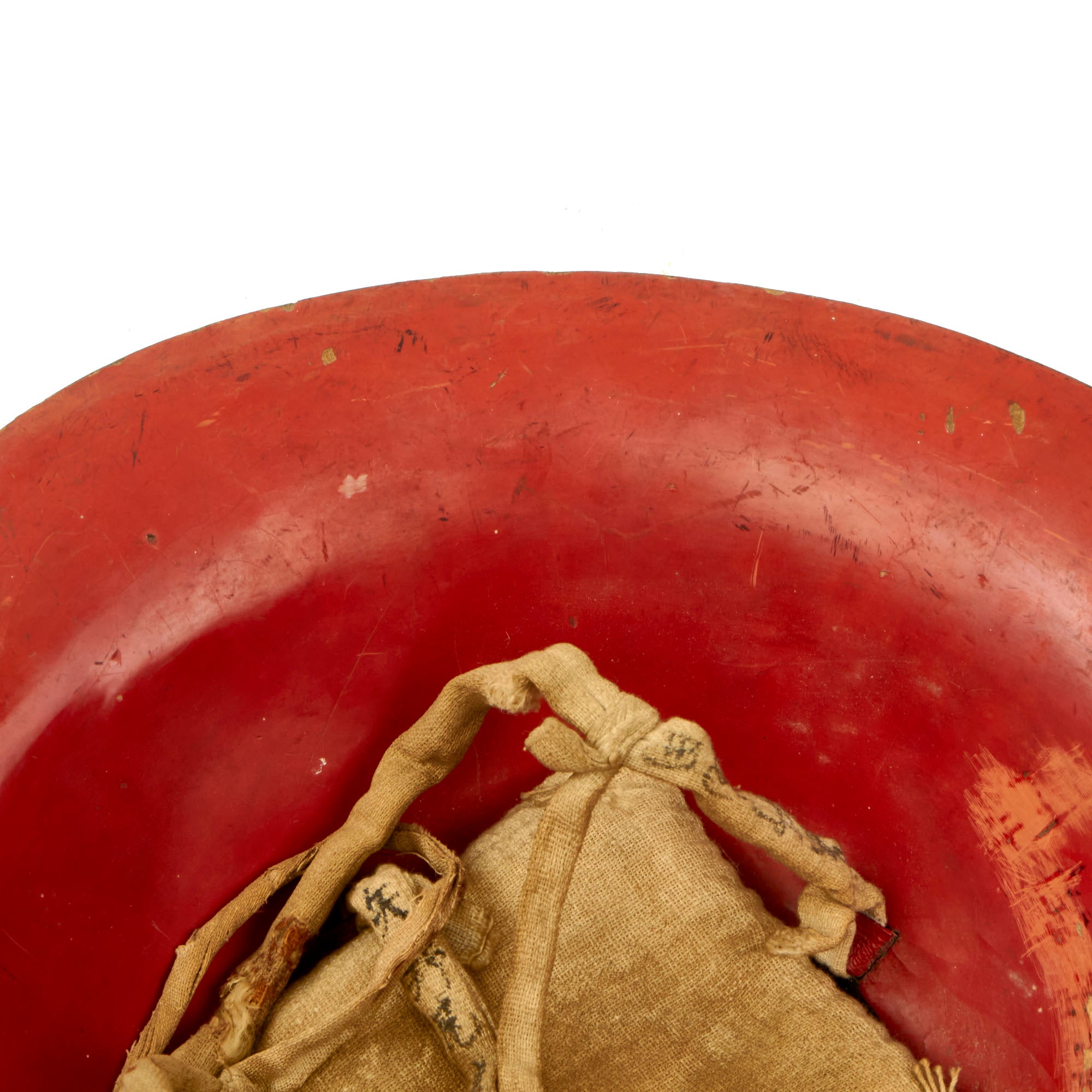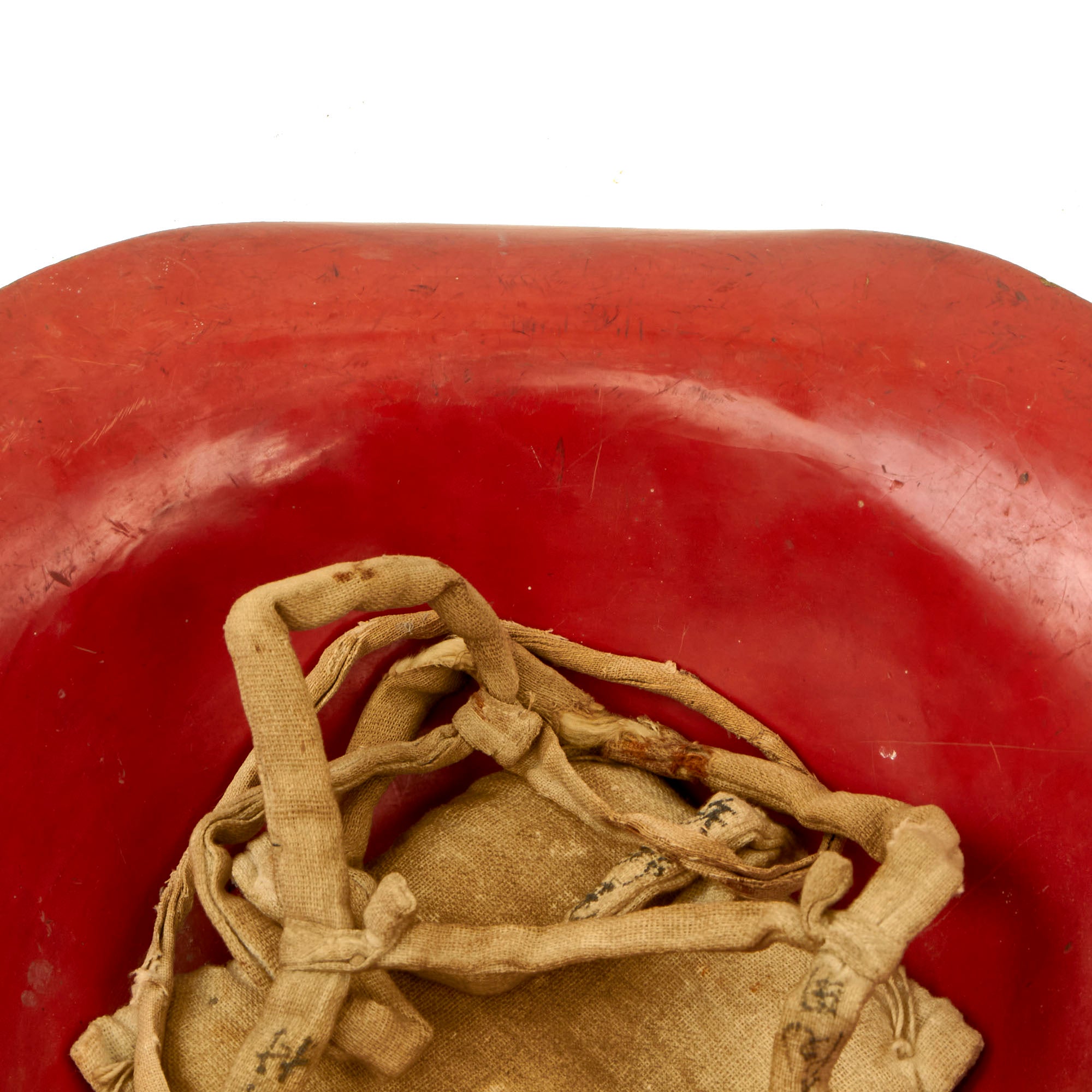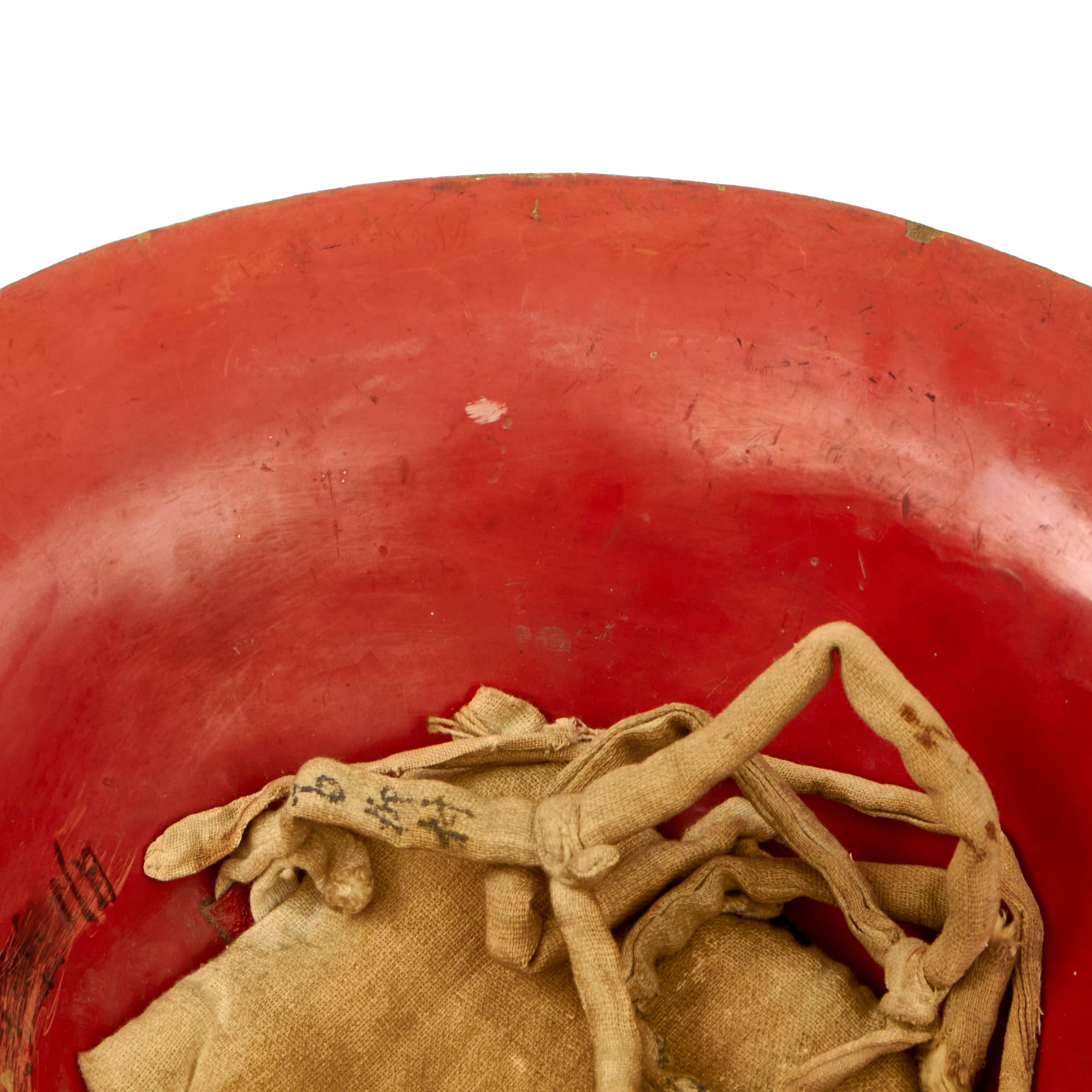 These were used with a minimal padded cushion liner, with a squarish pad on the crown, and padded loops to go on either side of the head. These would then be connected by straps or ribbons. This example still has the complete liner, which looks to be filled with pulled plant fiber on both the crown and side straps. It does have a bit of fraying and tearing, showing REAL period wear. This is definitely not a helmet that was restored recently or one of the many modern made helmets flooding the market. There are even Japanese Kanji Markings on the side straps, which could make a great translation project!
