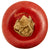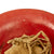 The jingasa has black lacquer on the exterior without a Mon on the front, the interior is finished in red lacquer, now faded to more of an orange color in areas. There is some chipping to the exterior and around the edges, and there were some kanji markings on the interior, which were scratched out. It appears to be made of wood or pressed paper layers covered with fabric and lacquer, which can be seen where the finish has chipped away. The helmet measures 13" across side to side, and 14" front to back, with a height of about 4".
