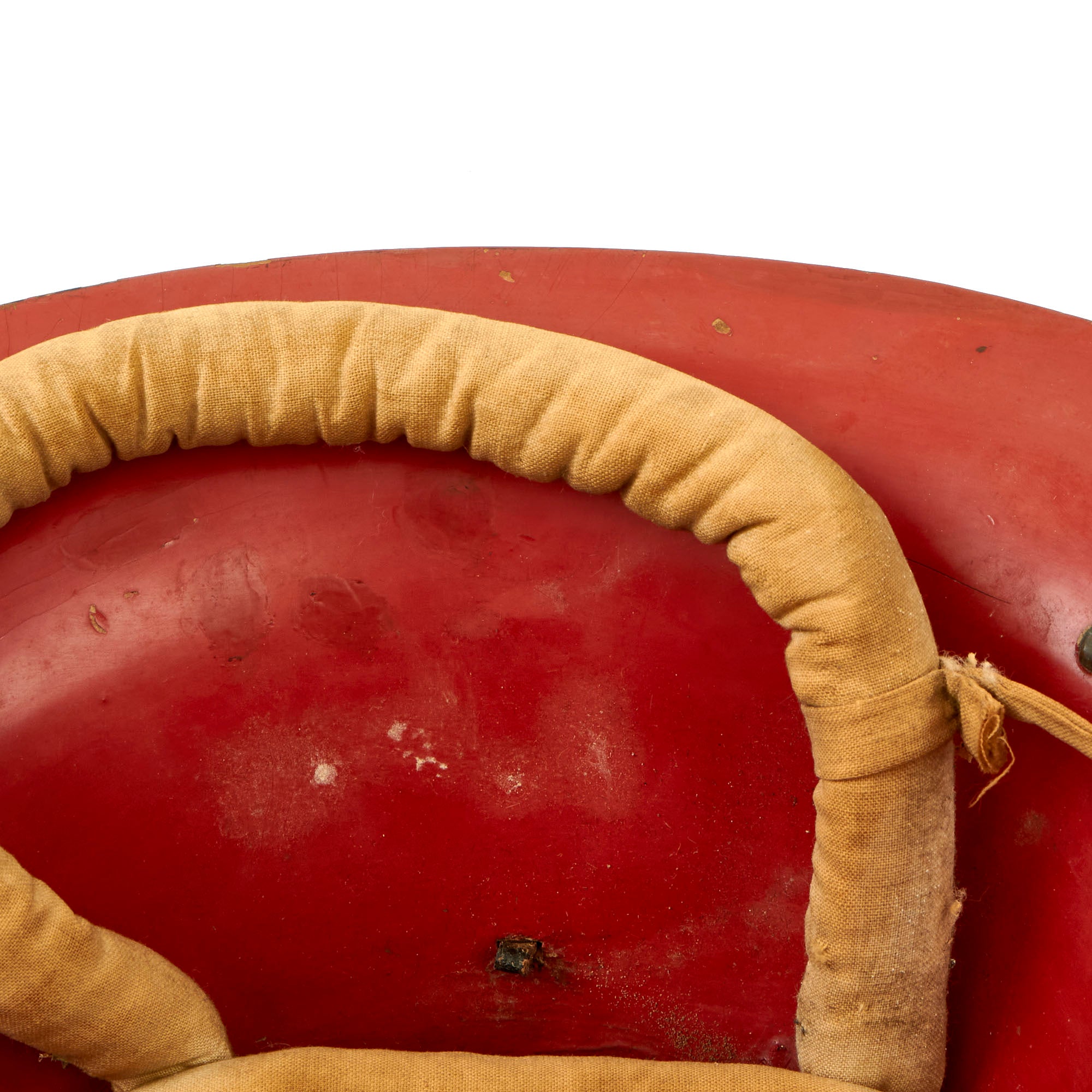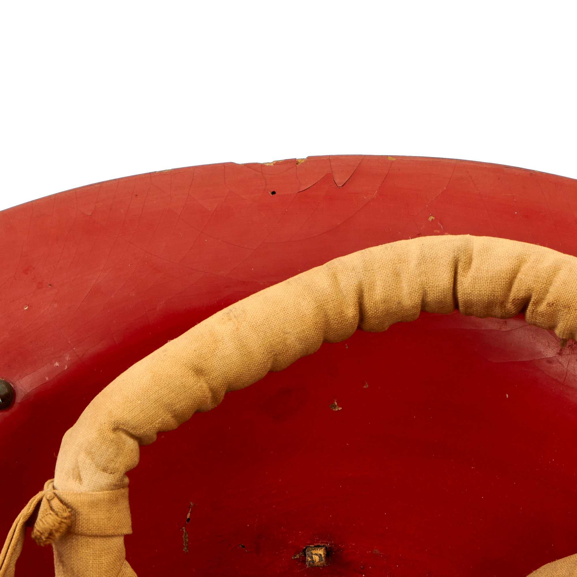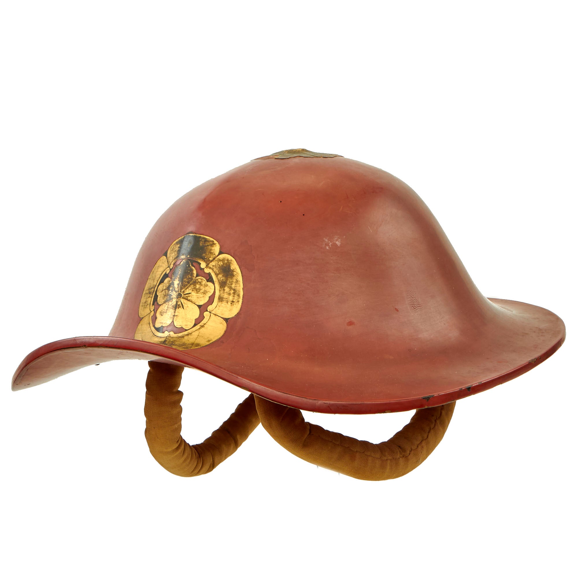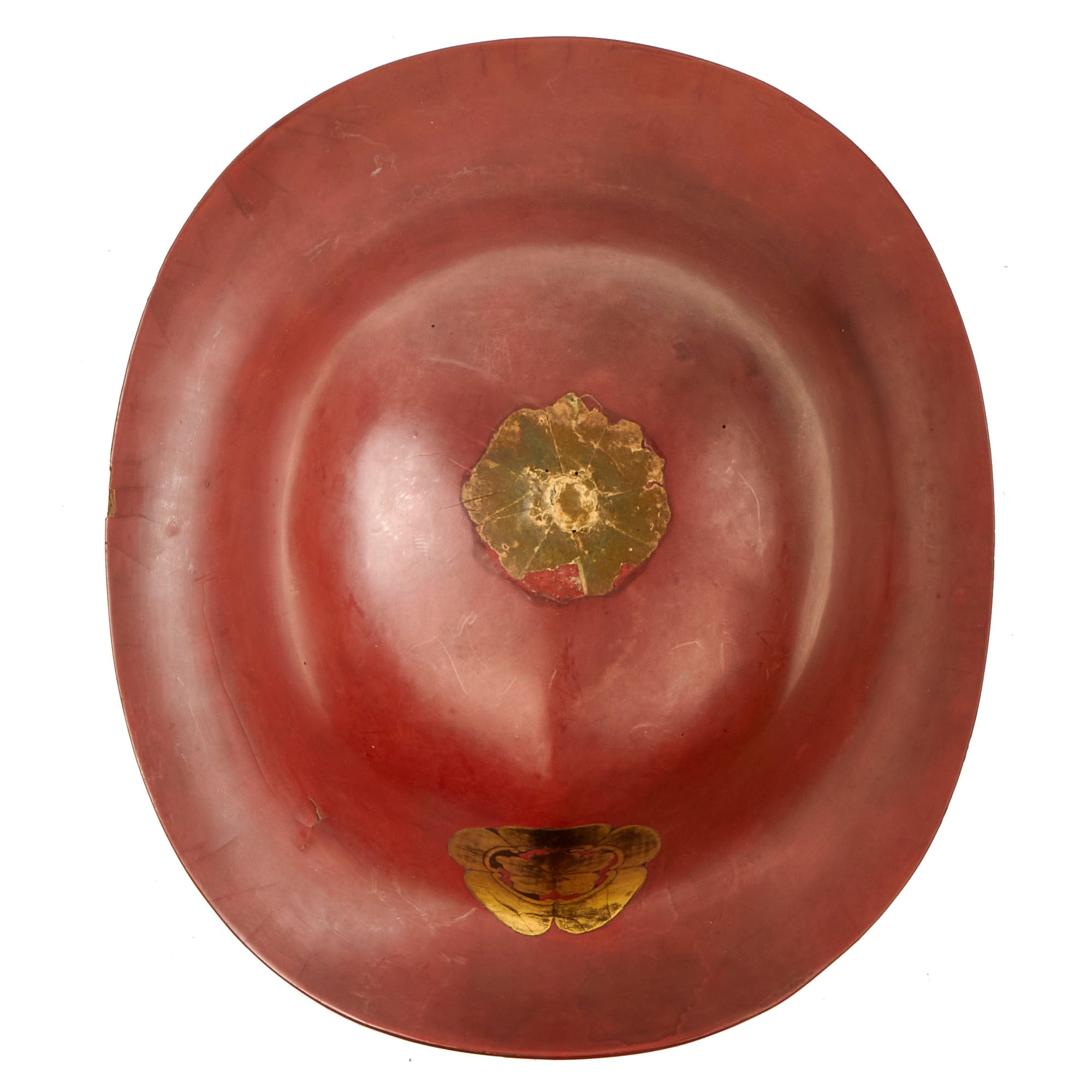 The bajo jingasa has lovely red urushi lacquer on the exterior and interior, and bears a gold five petaled flower Mon family crest on the front, which we were unfortunately not able to identify. There is checking and crazing in the lacquer, showing that it is quite old, and there is some chipping around the edges. The shell appears to be made of wood or pressed paper layers covered with fabric and lacquer, which can be seen where the finish has chipped away. The helmet measures 12 1/4" across side to side, and 14" front to back, with a height of about 5".