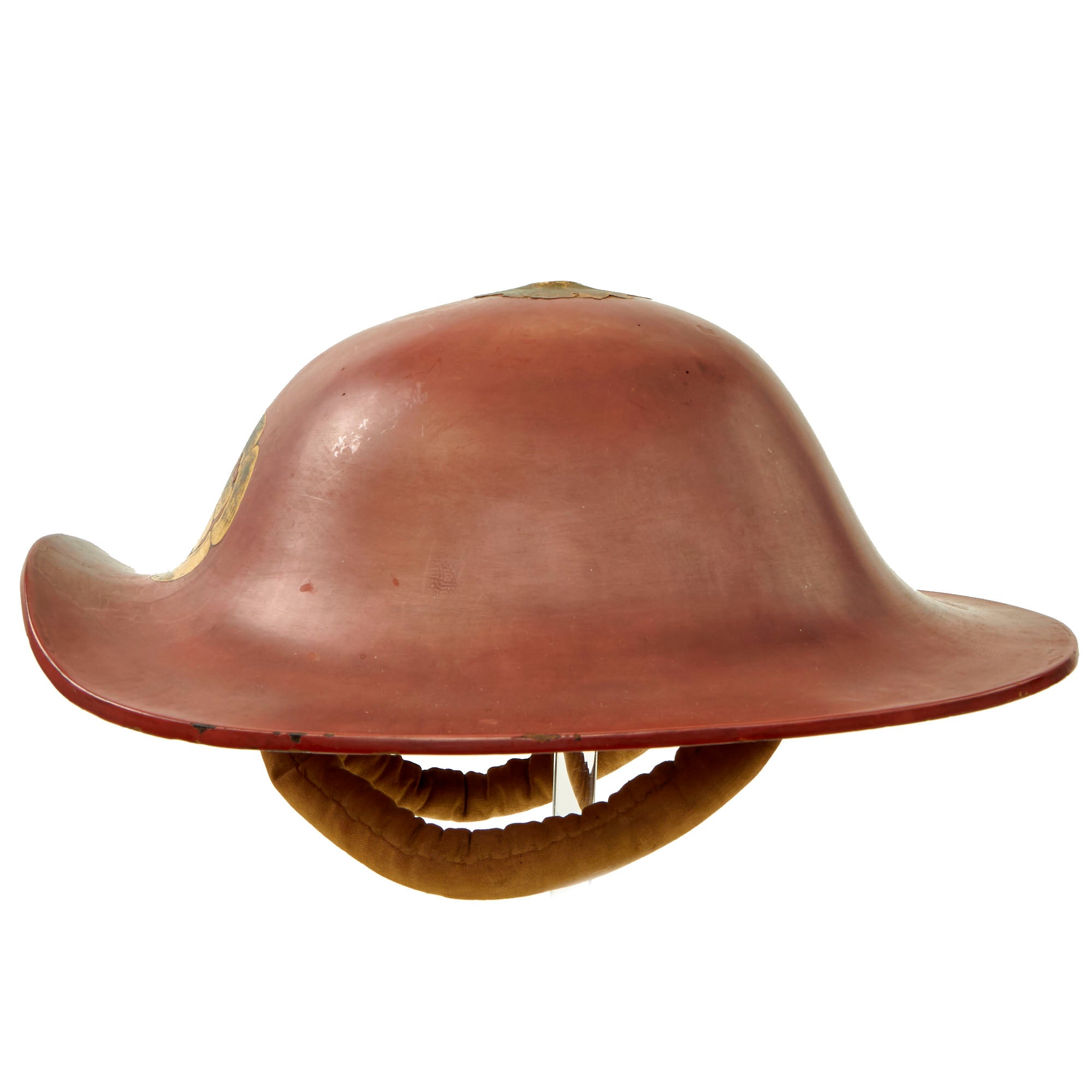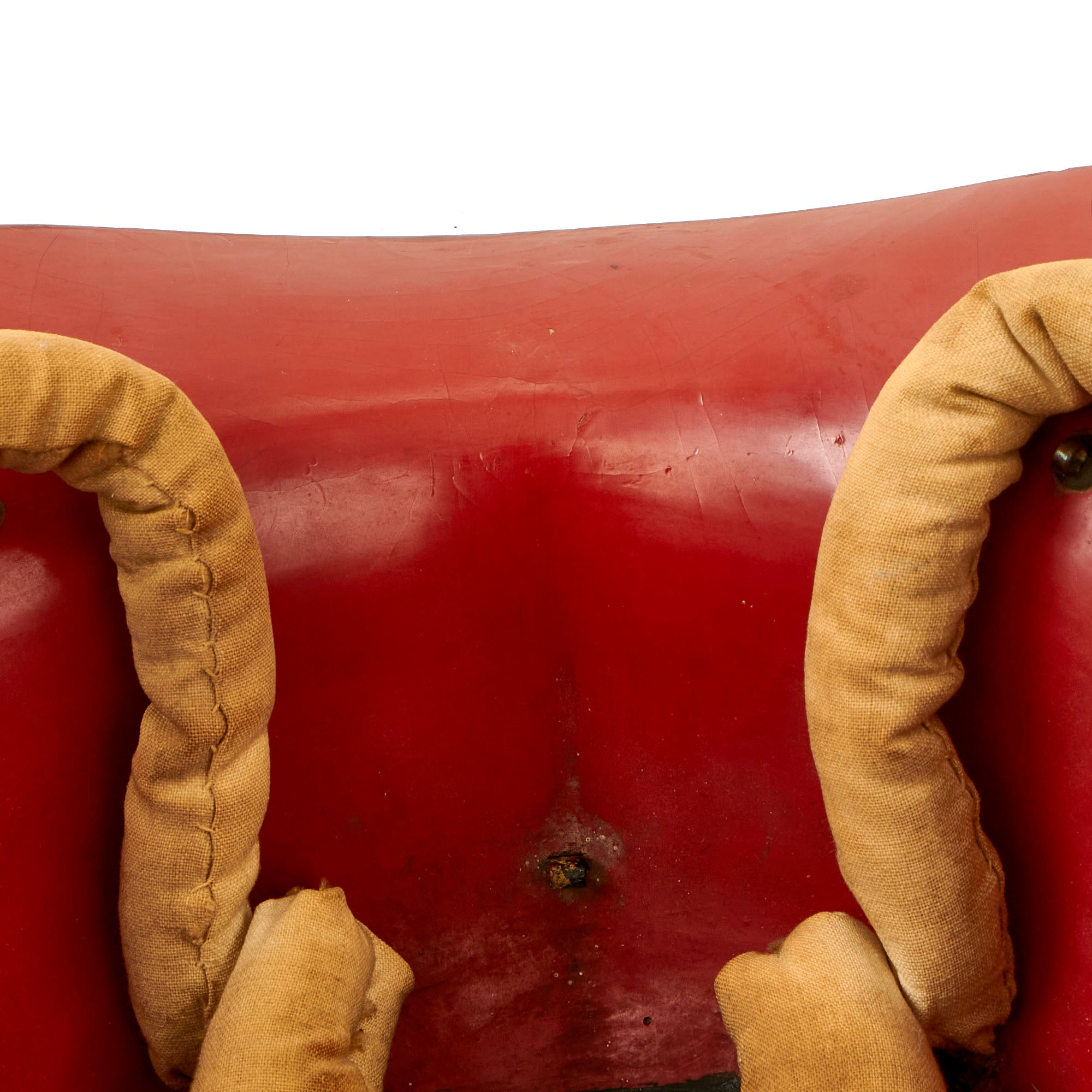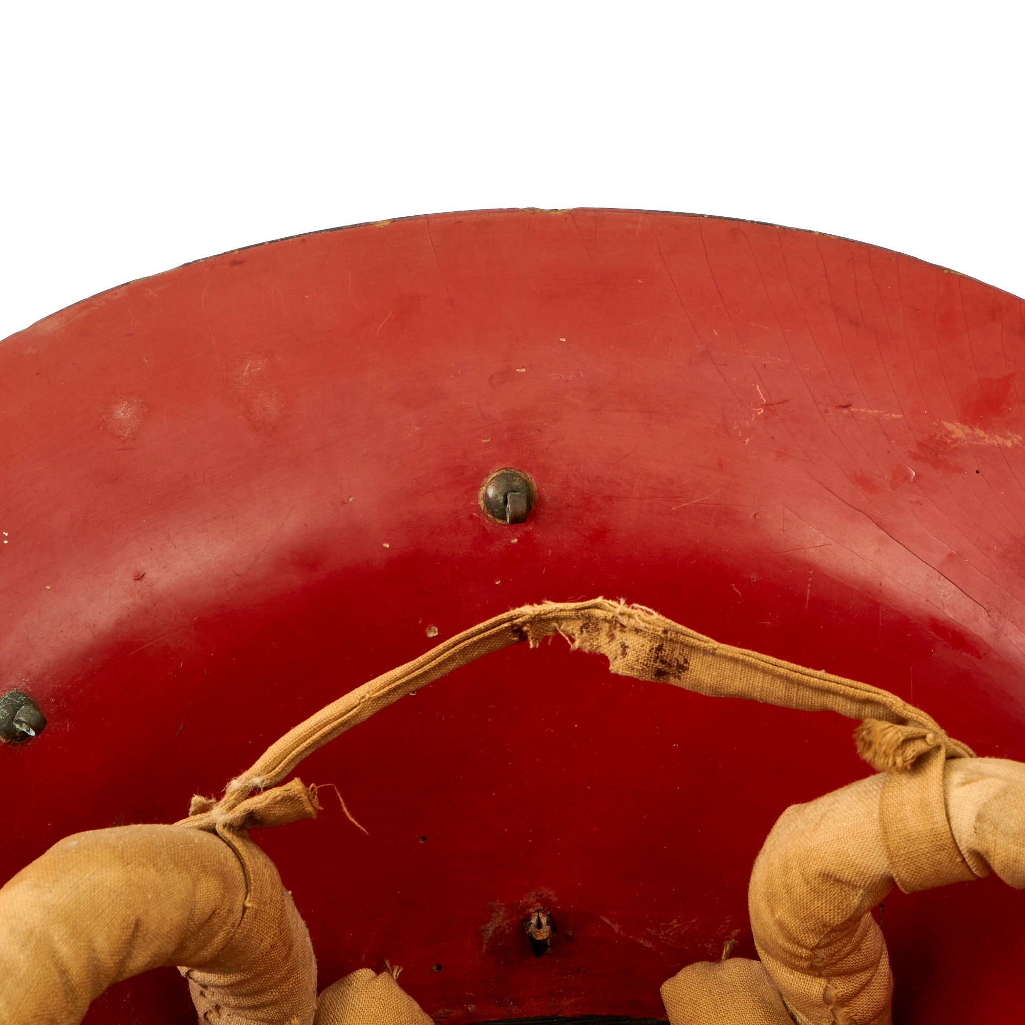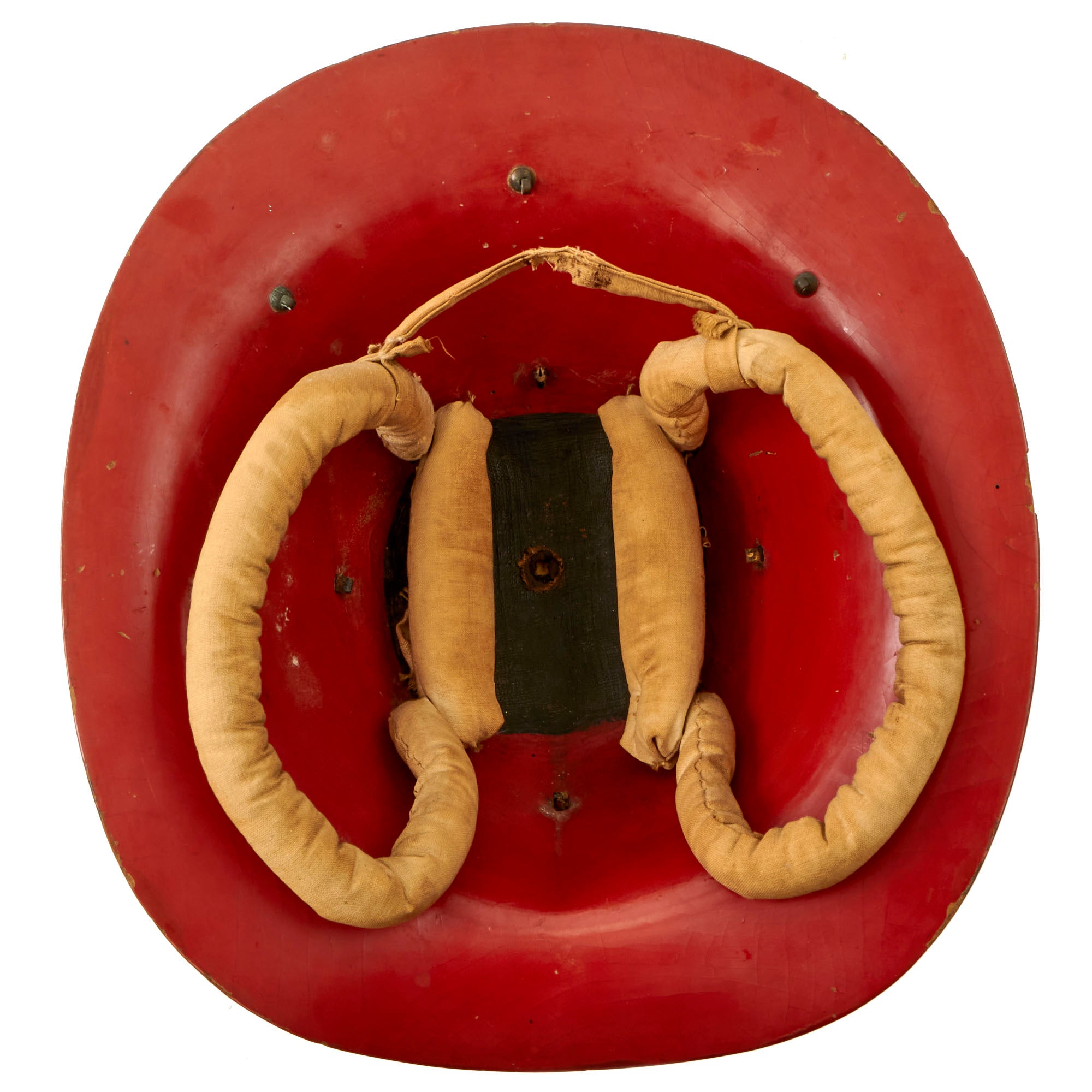 The bajo jingasa has lovely red urushi lacquer on the exterior and interior, and bears a gold five petaled flower Mon family crest on the front, which we were unfortunately not able to identify. There is checking and crazing in the lacquer, showing that it is quite old, and there is some chipping around the edges. The shell appears to be made of wood or pressed paper layers covered with fabric and lacquer, which can be seen where the finish has chipped away. The helmet measures 12 1/4" across side to side, and 14" front to back, with a height of about 5".