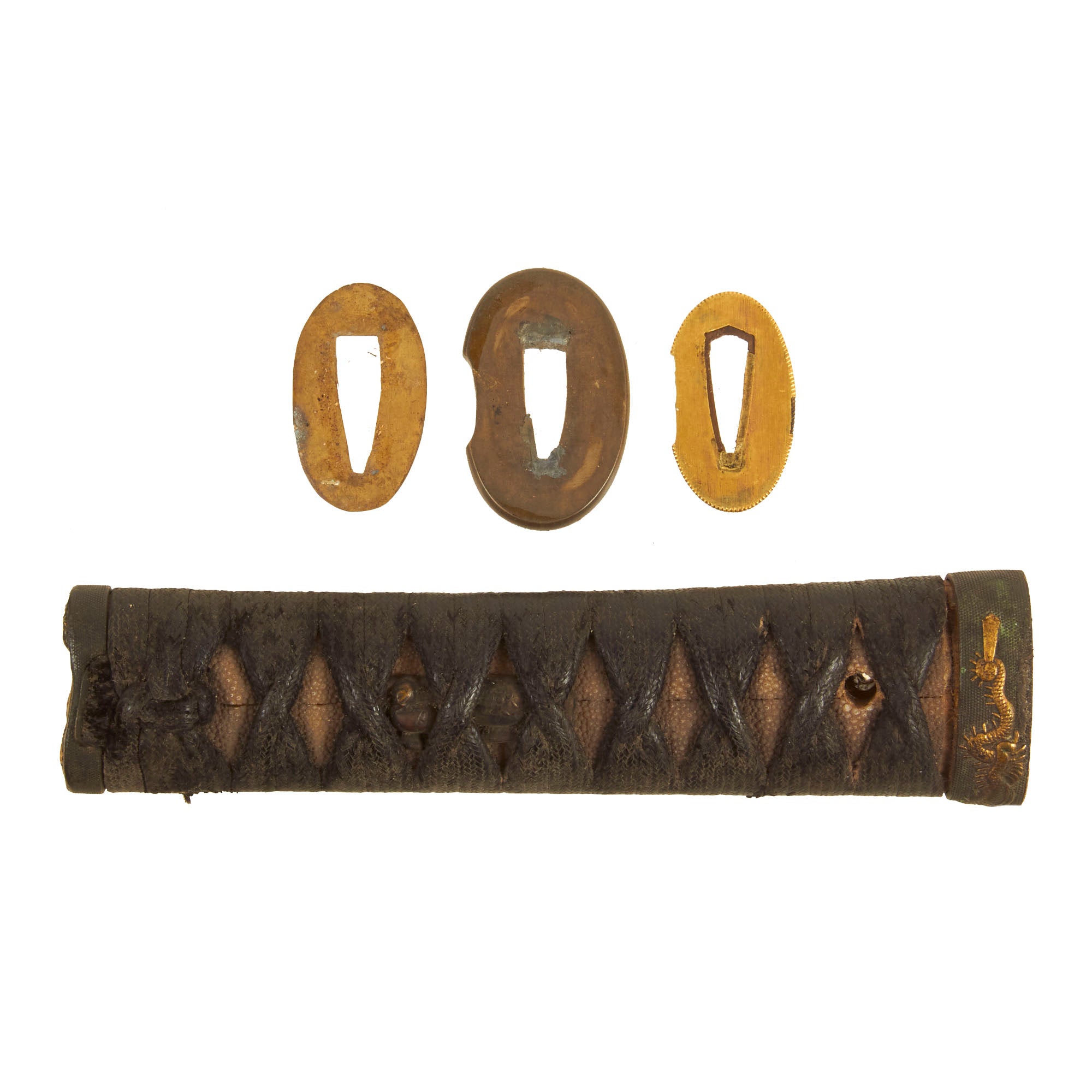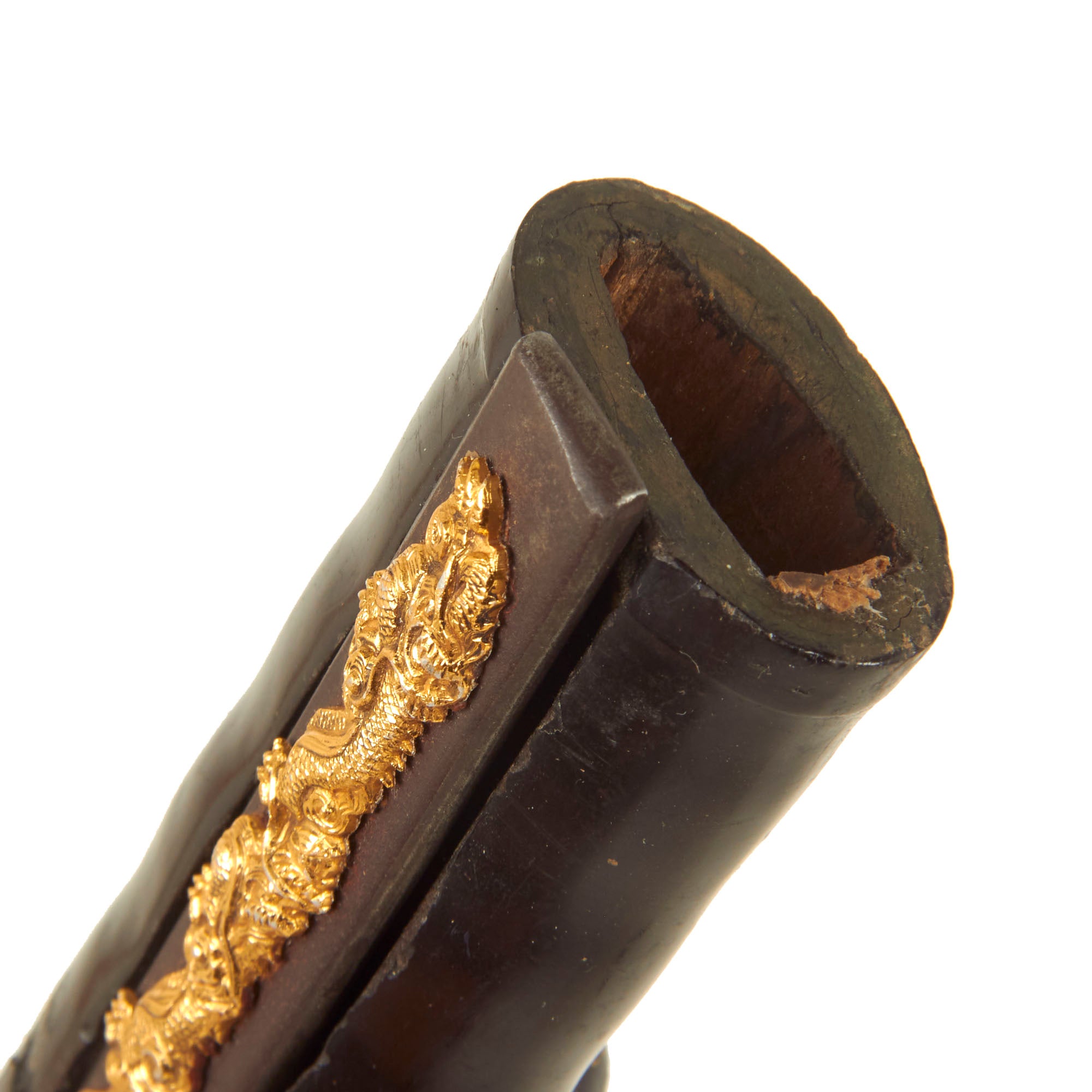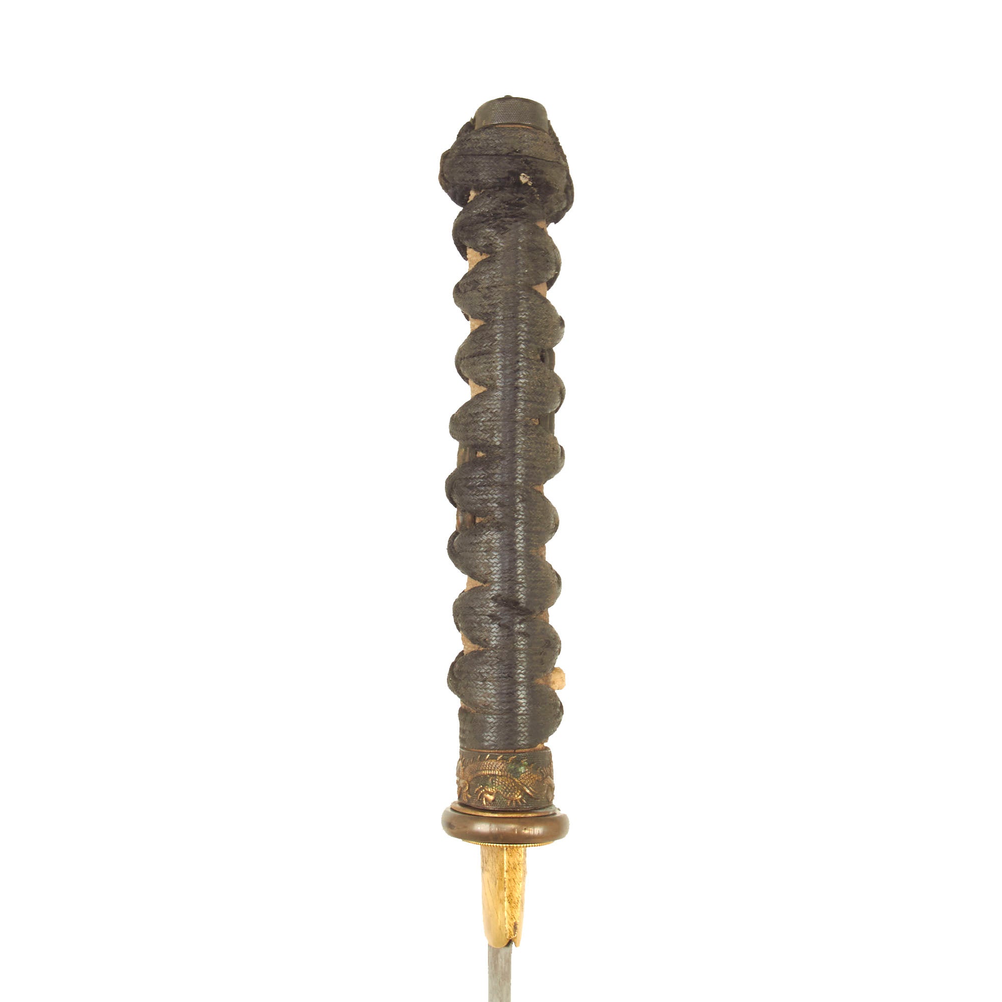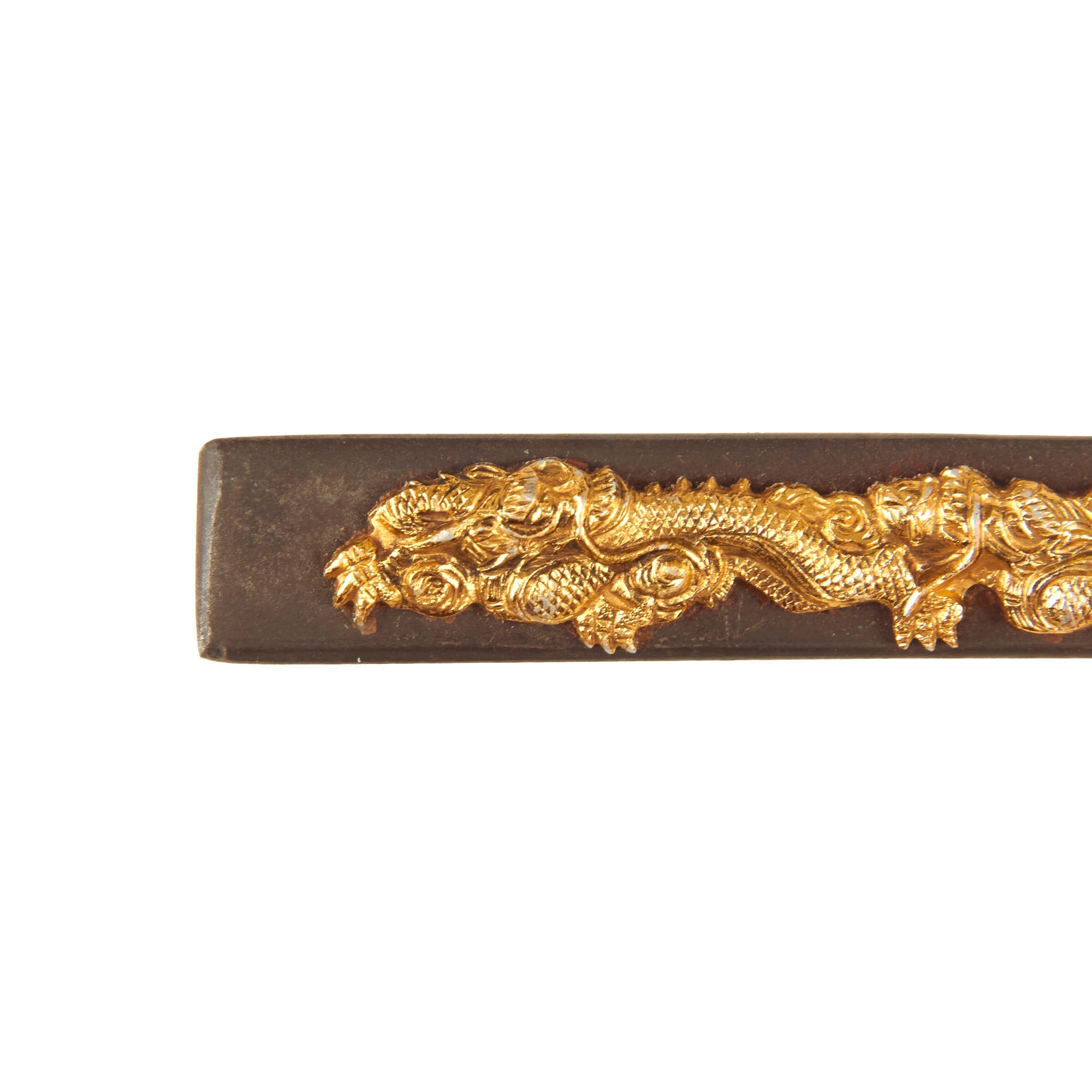 It is fitted with a lovely minimal oval brass TSUBA (cross guard), which is surrounded by two seppa (spacers) to keep the fit tight. The bottom of the blade is fitted with a lovely "rain" pattern HABAKI blade collar, typical of those used during the Edo period. The TSUKA (handle) has a nice blacked brass FUCHI (grip collar) with a fantastic gilt dragon design wrapping around onto both sides. It is wrapped with a very nice stingray Sa-Me Skin grip, which is covered with a nice black ITO (cloth binding), which shows wear from use and age. This holds the two MENUKI (grip ornaments) in place, which look to be bronze mythical creatures. The KASHIRA (end cap) is also blacked brass with a gilt dragon on it, and is properly secured with the wrapping. It is held on with one wooden securing peg, which is a most likely replacement.